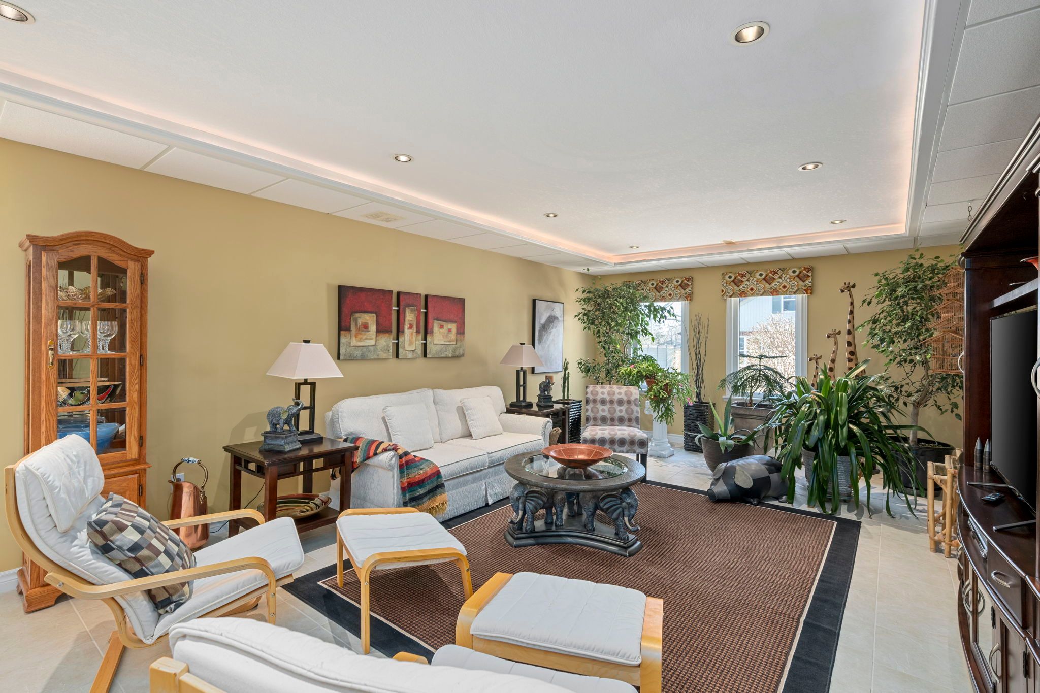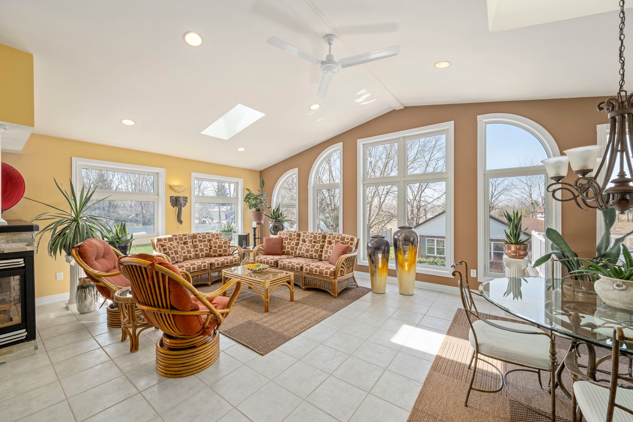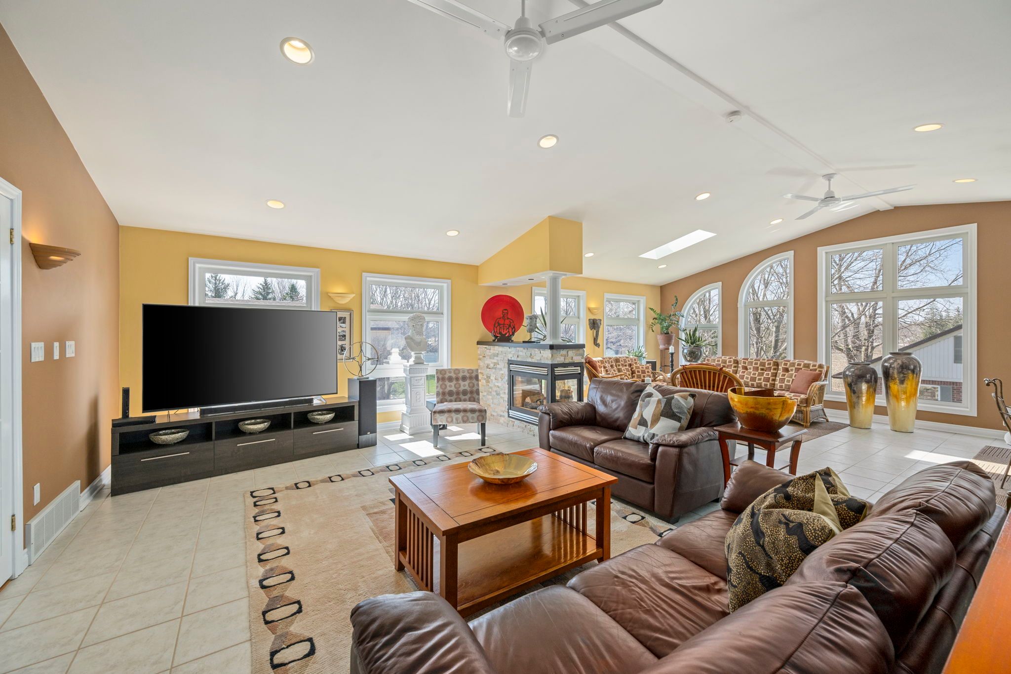 • Updated kitchen with a large island and cozy dining area featuring a gas fireplace.
