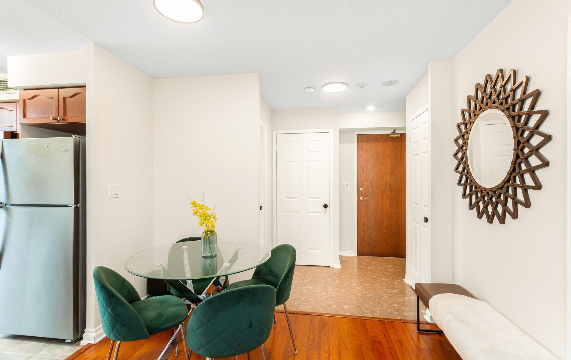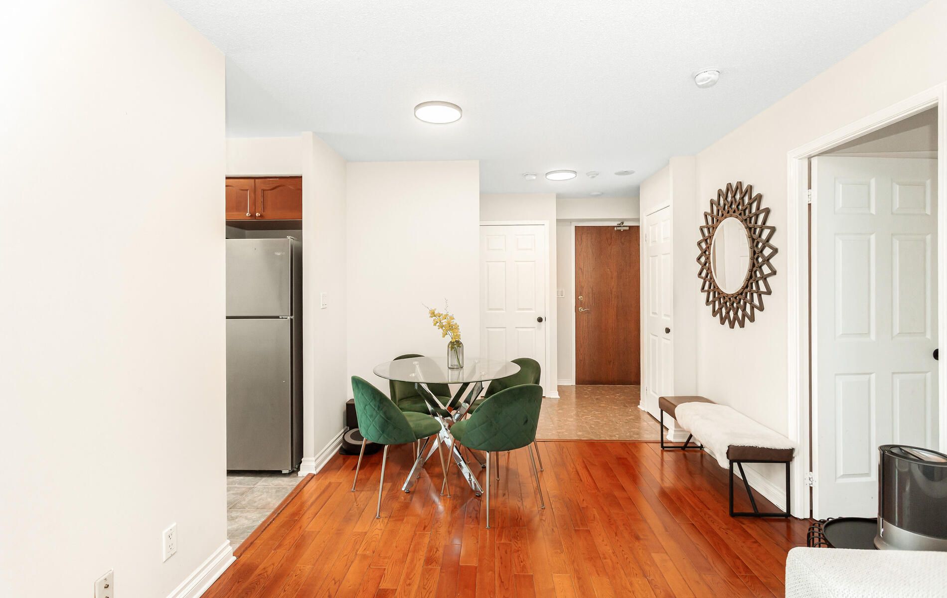 • Contemporary kitchen with stainless steel appliances and elegant hardwood floors.