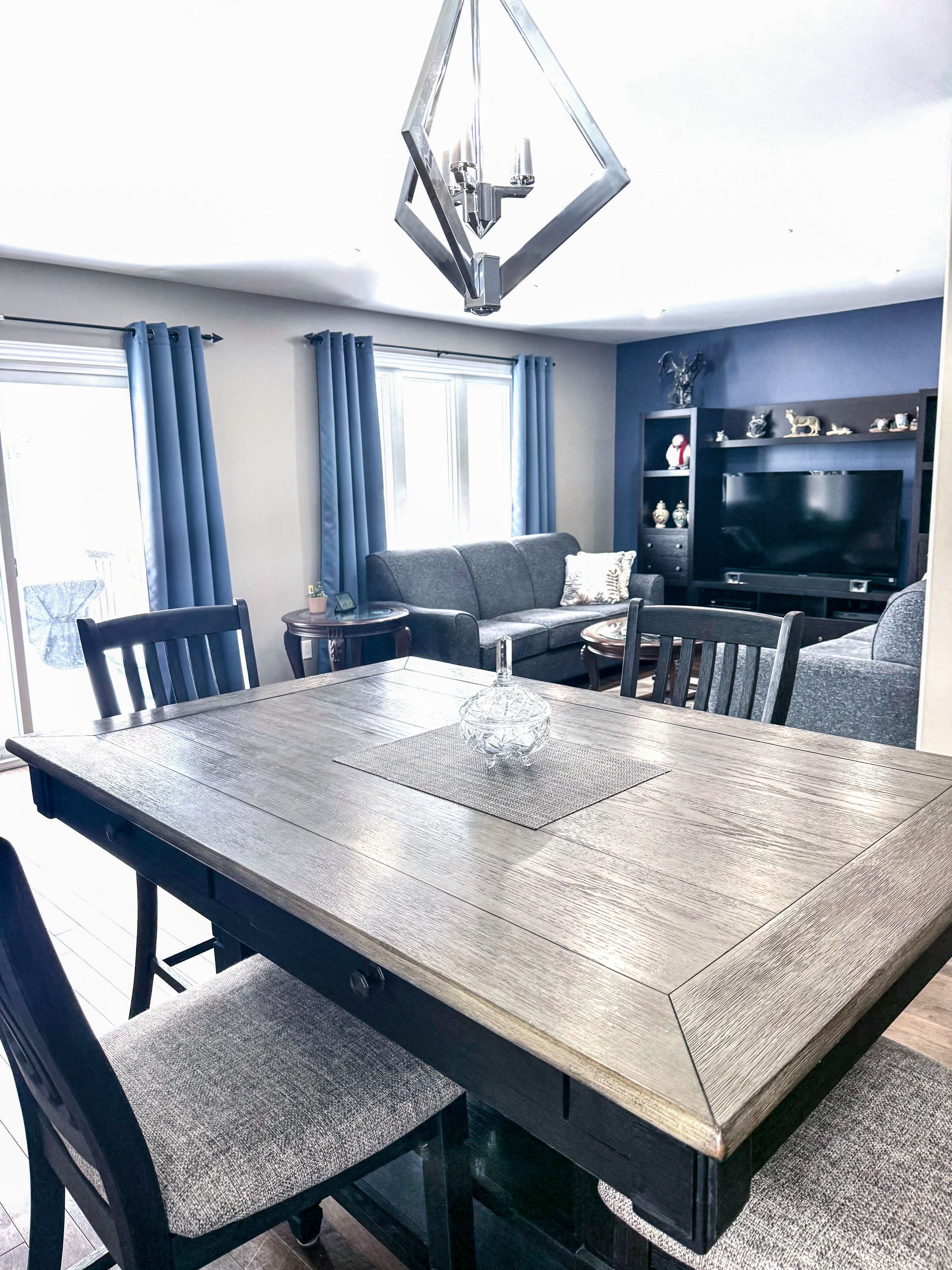 • Bright living room with large windows and backyard views.