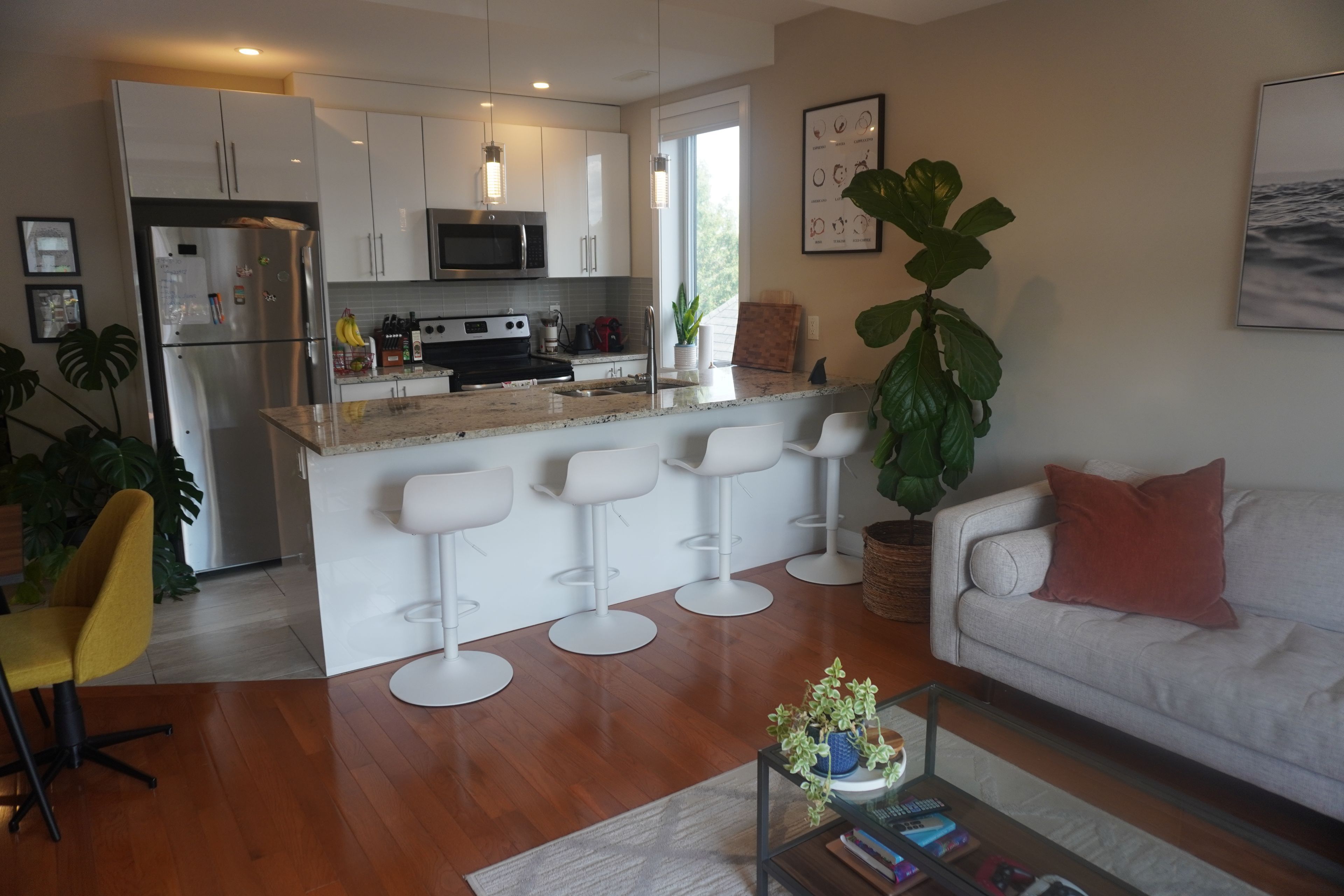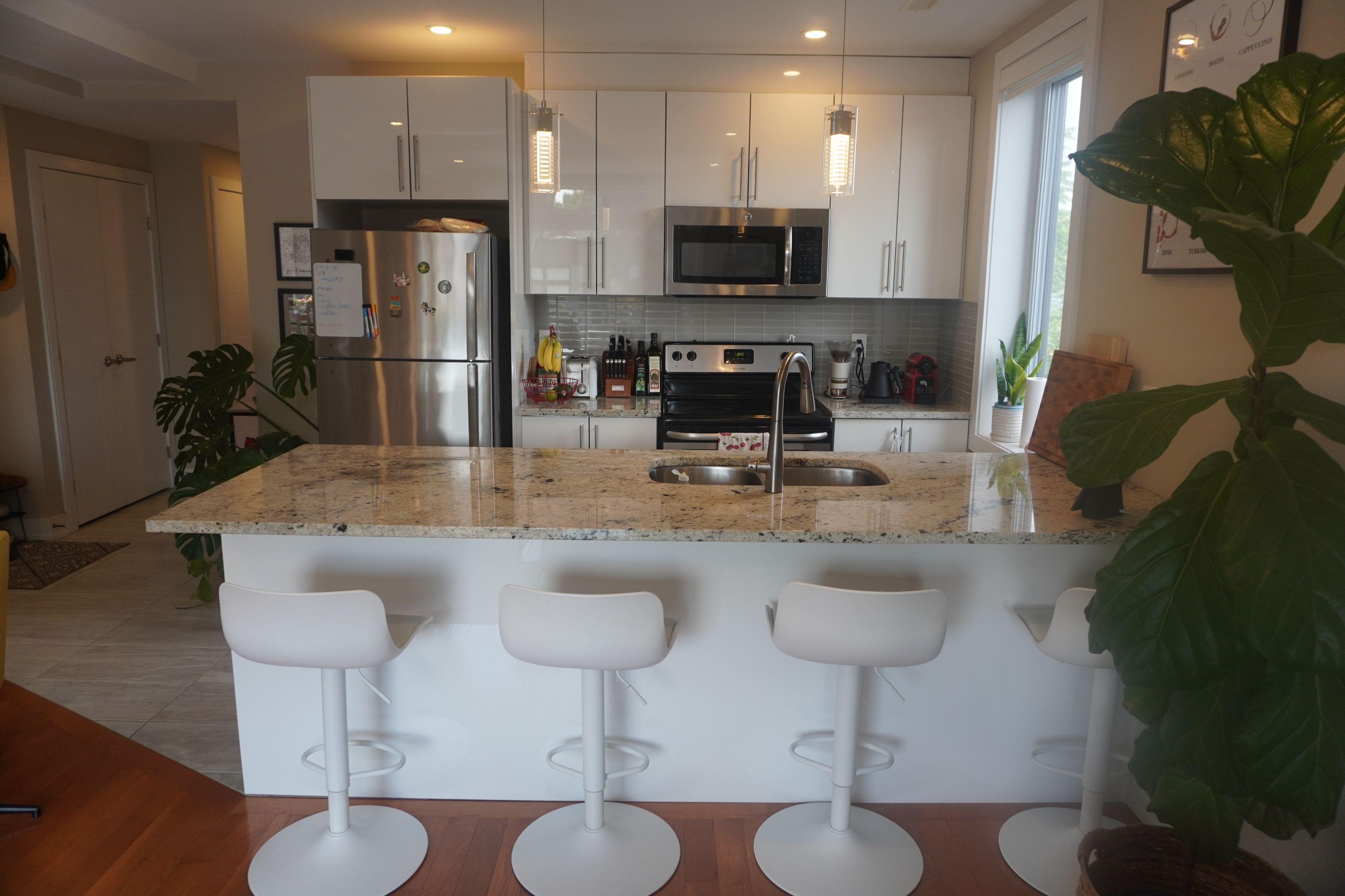 • Modern unit features quartz countertops and stainless steel appliances.