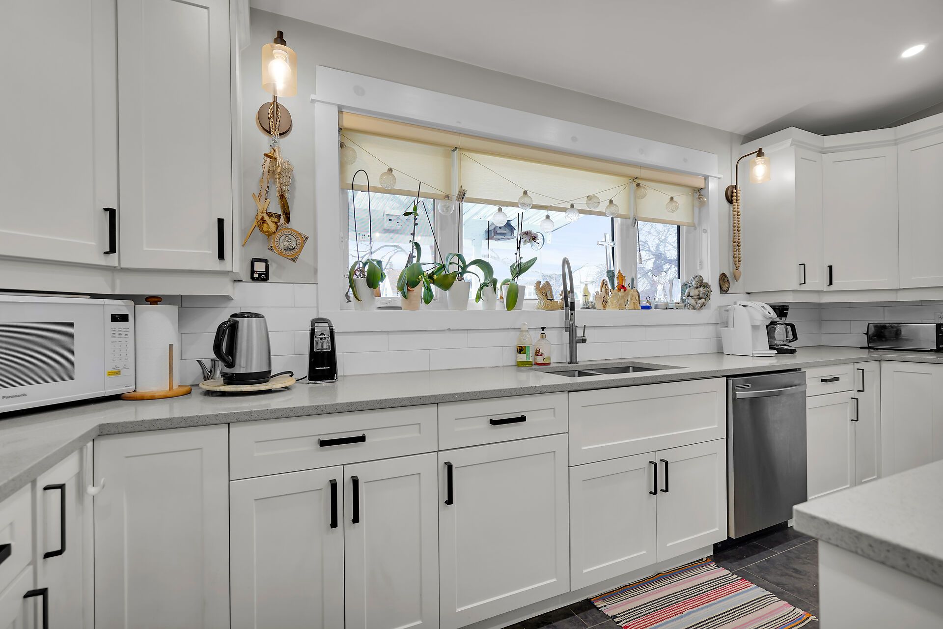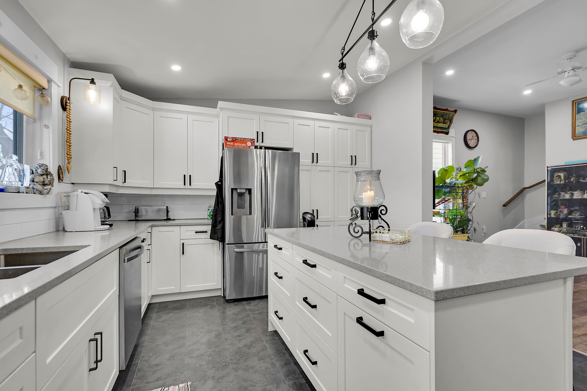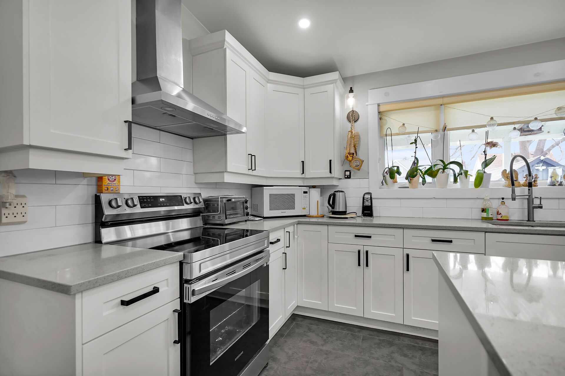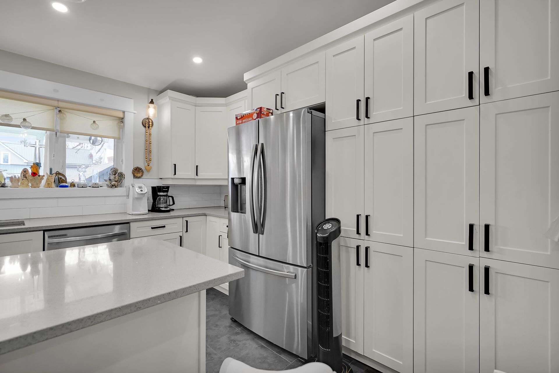 • Renovated kitchen features quartz countertops and plenty of cabinets.