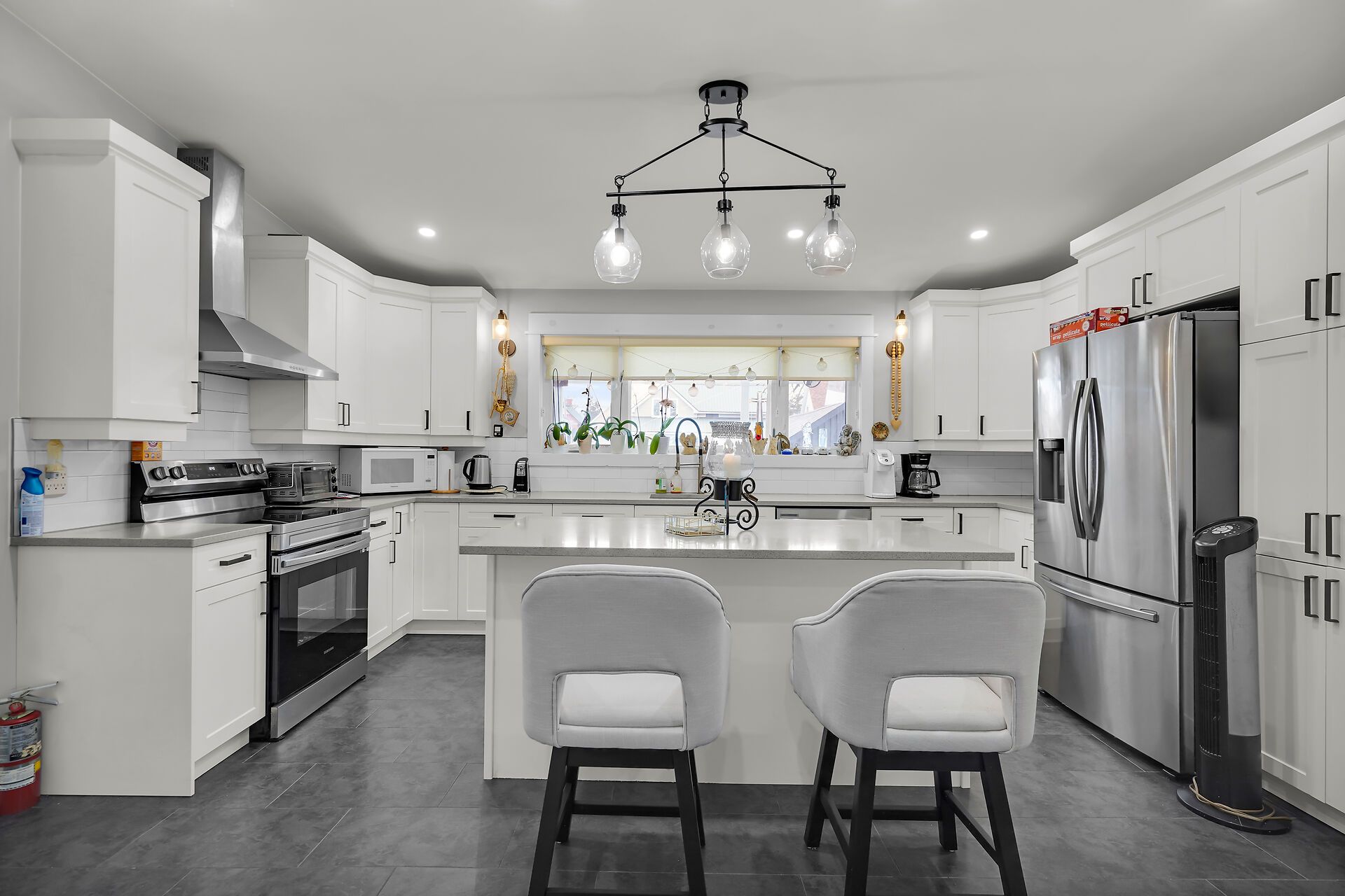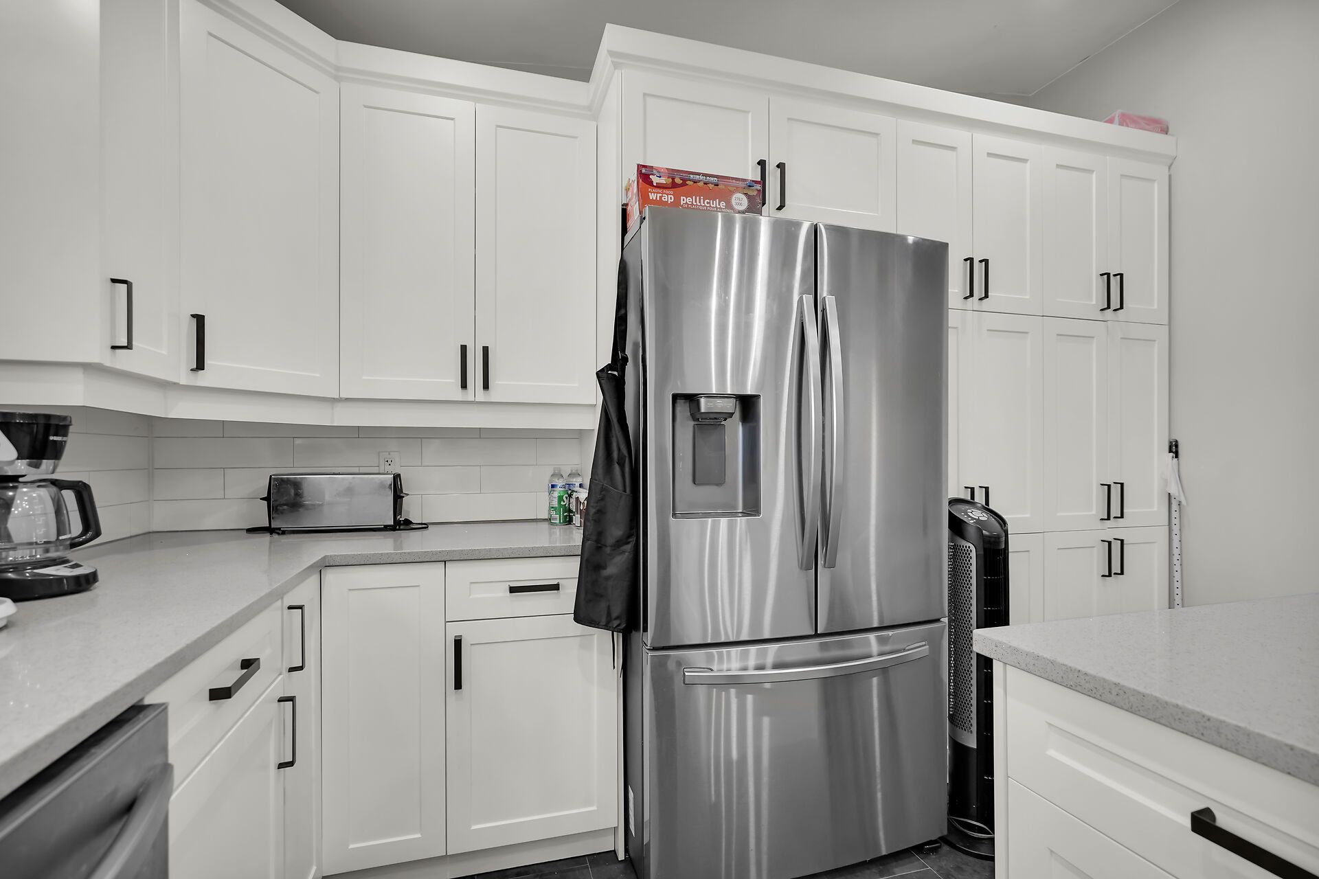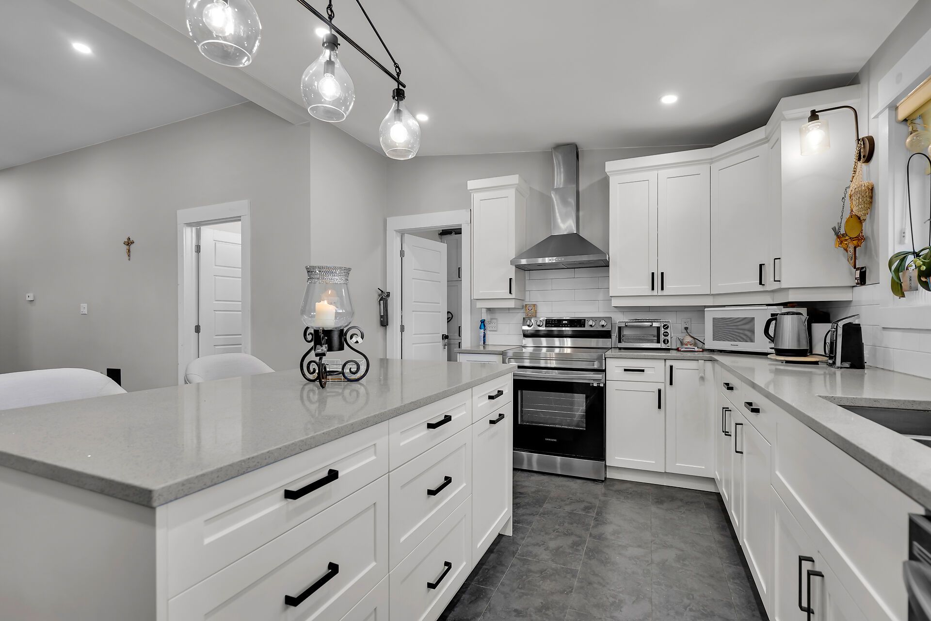• Renovated kitchen features quartz countertops and plenty of cabinets.