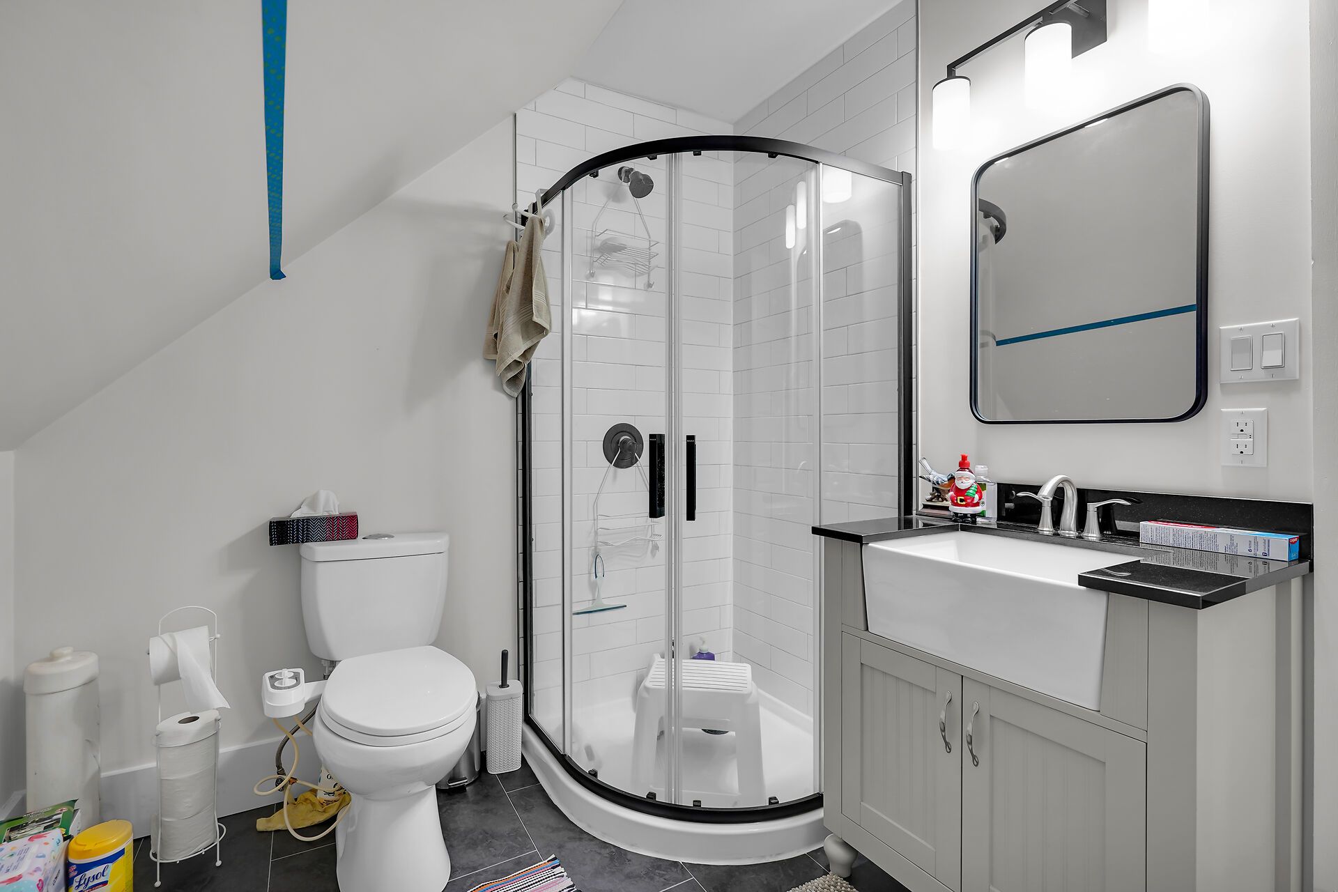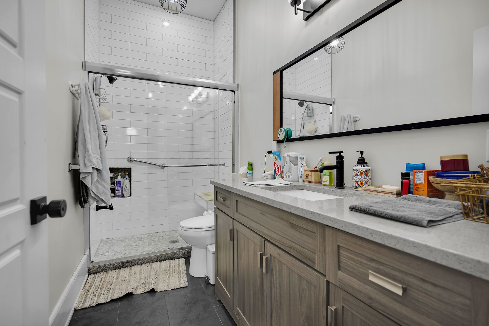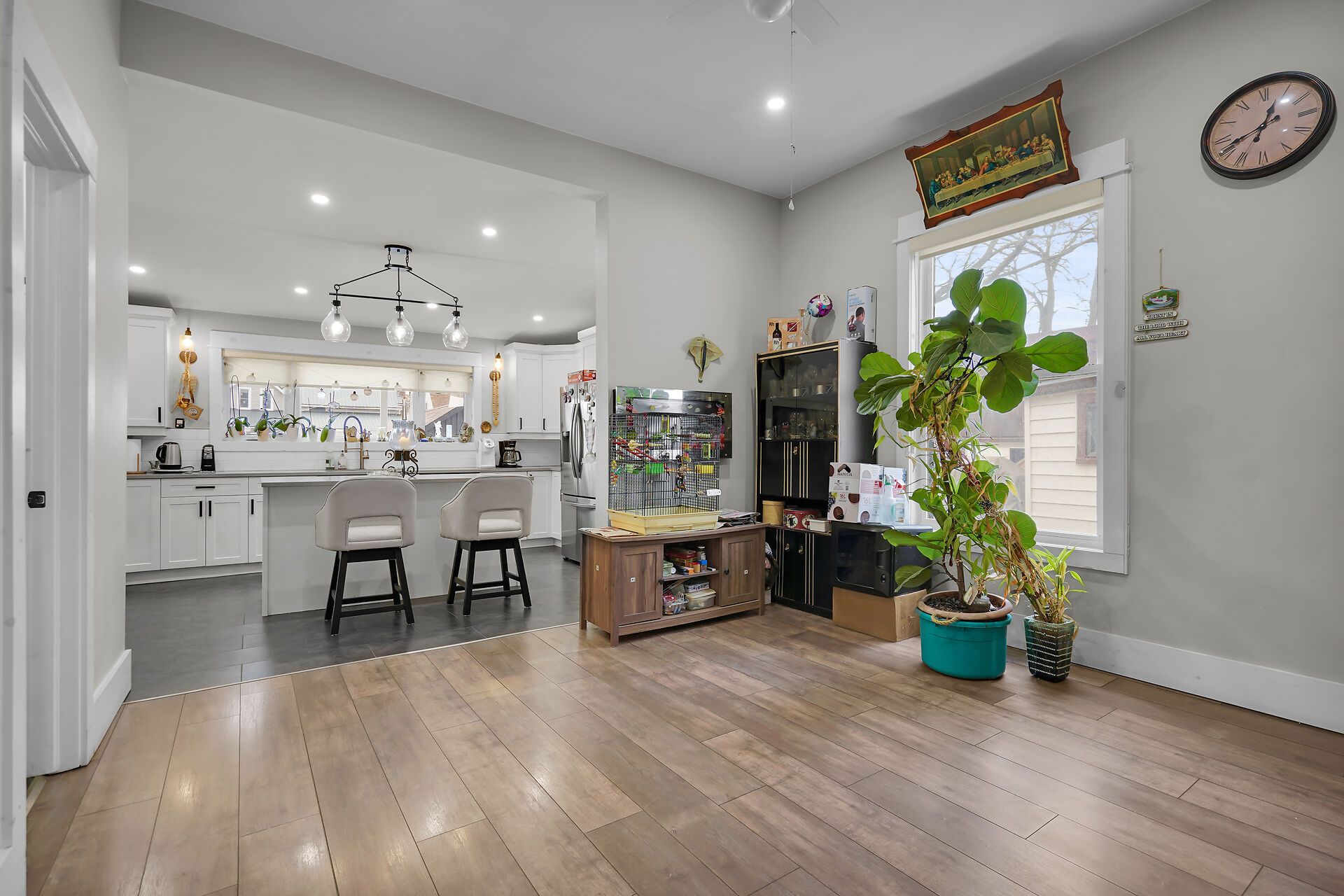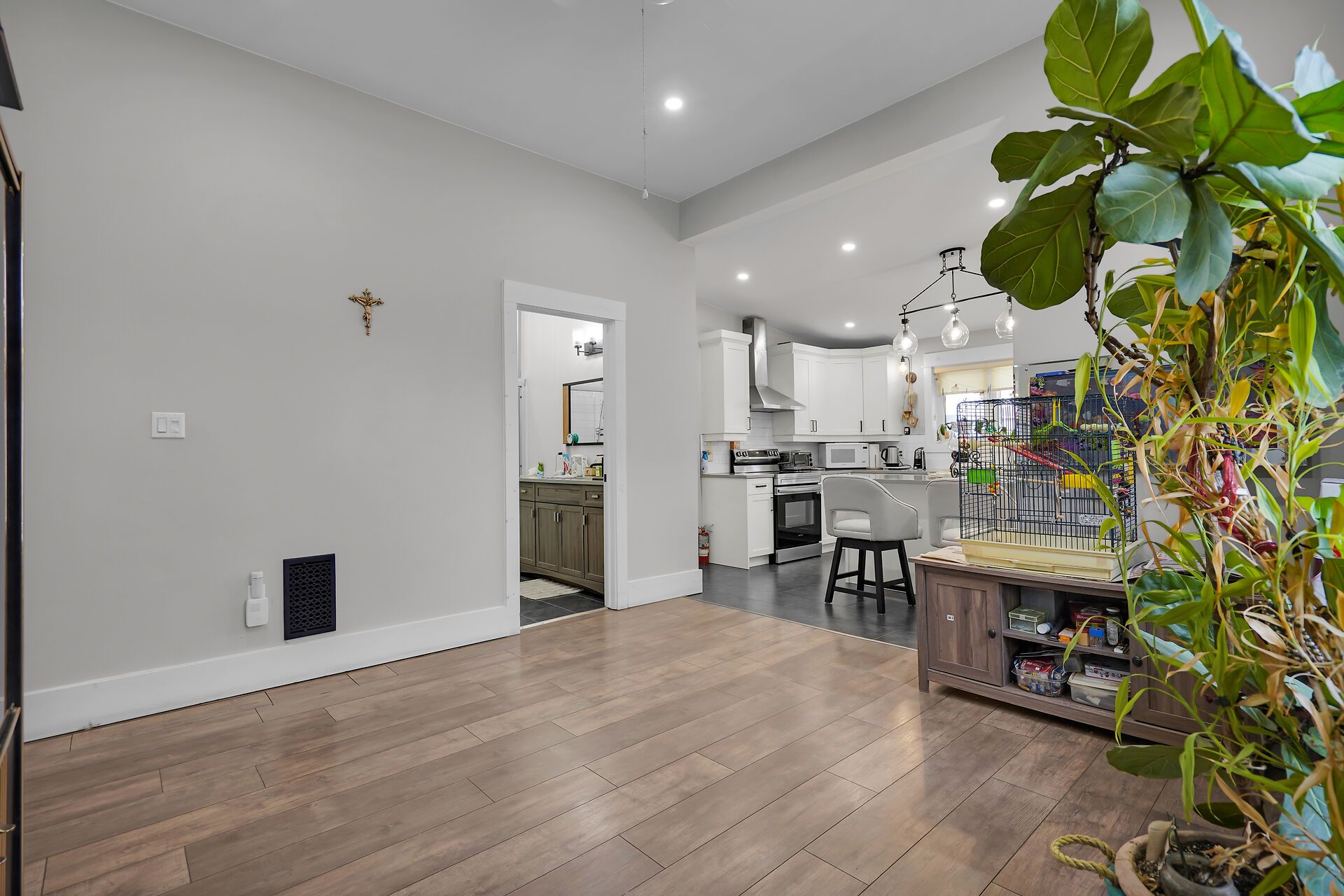 • Renovated kitchen features quartz countertops and plenty of cabinets.