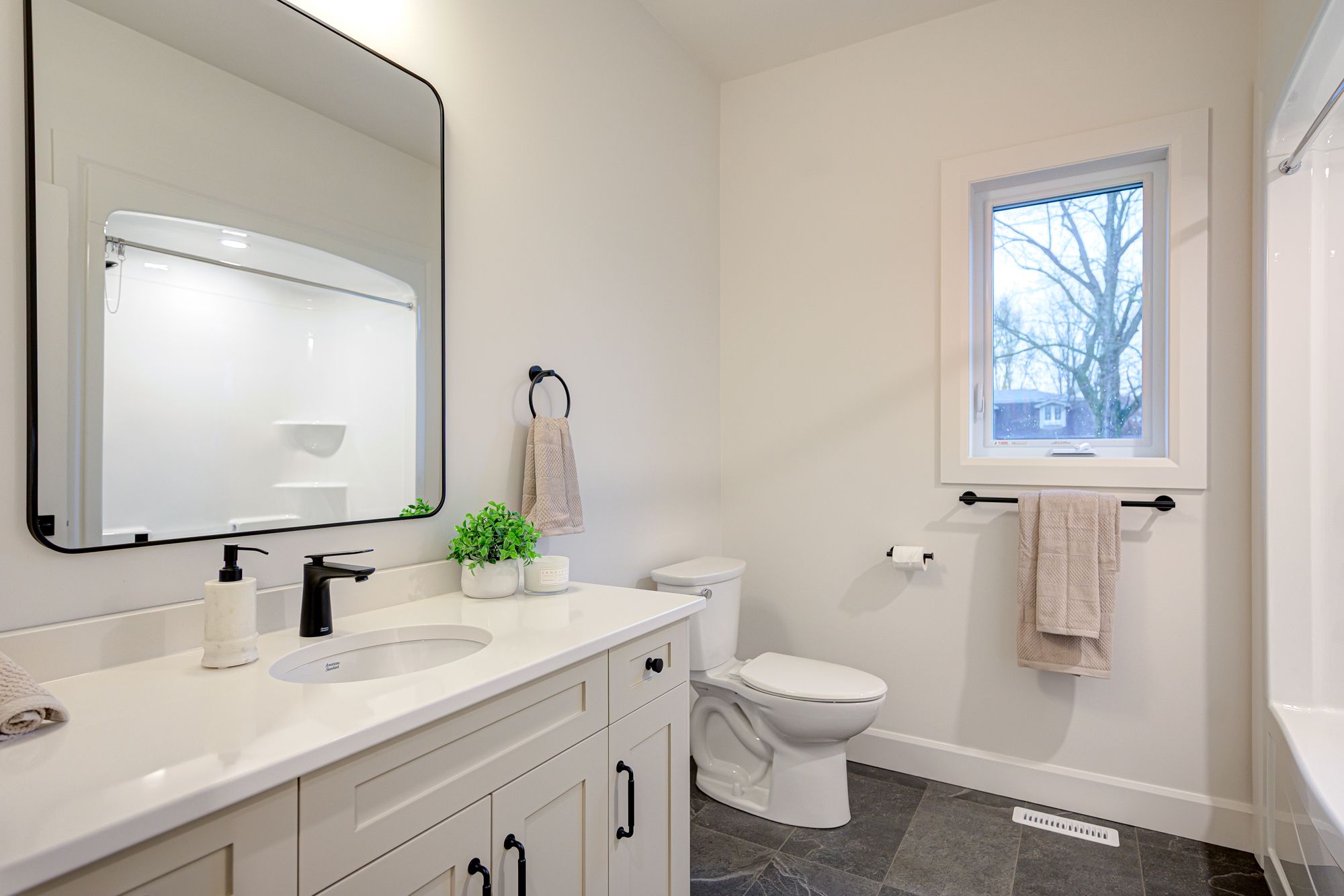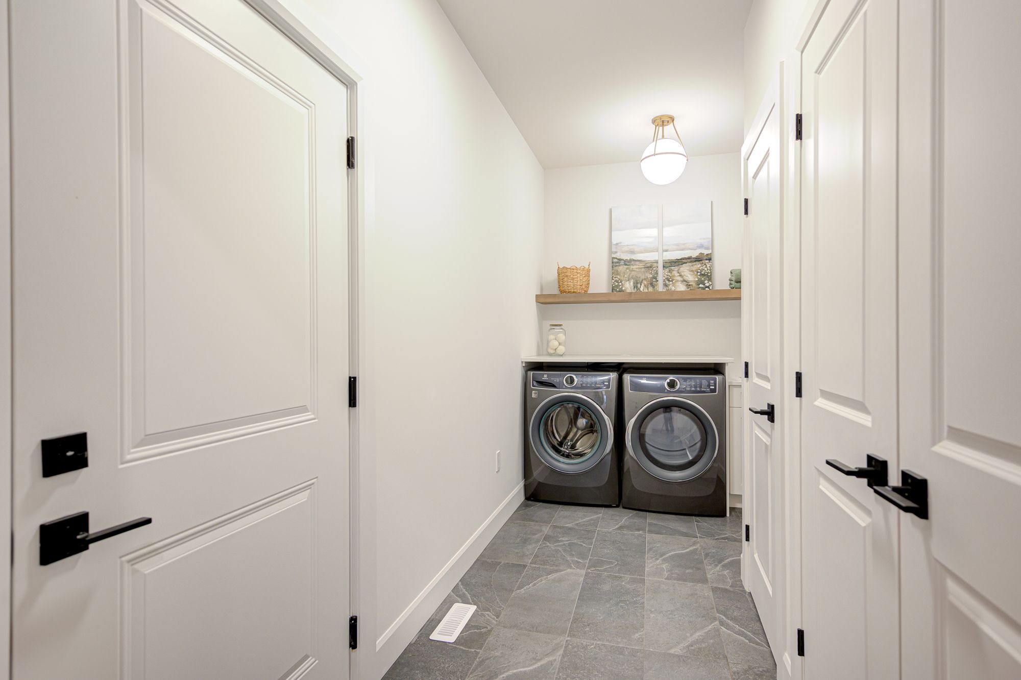 • Designer kitchen with stylish black stainless-steel appliances.