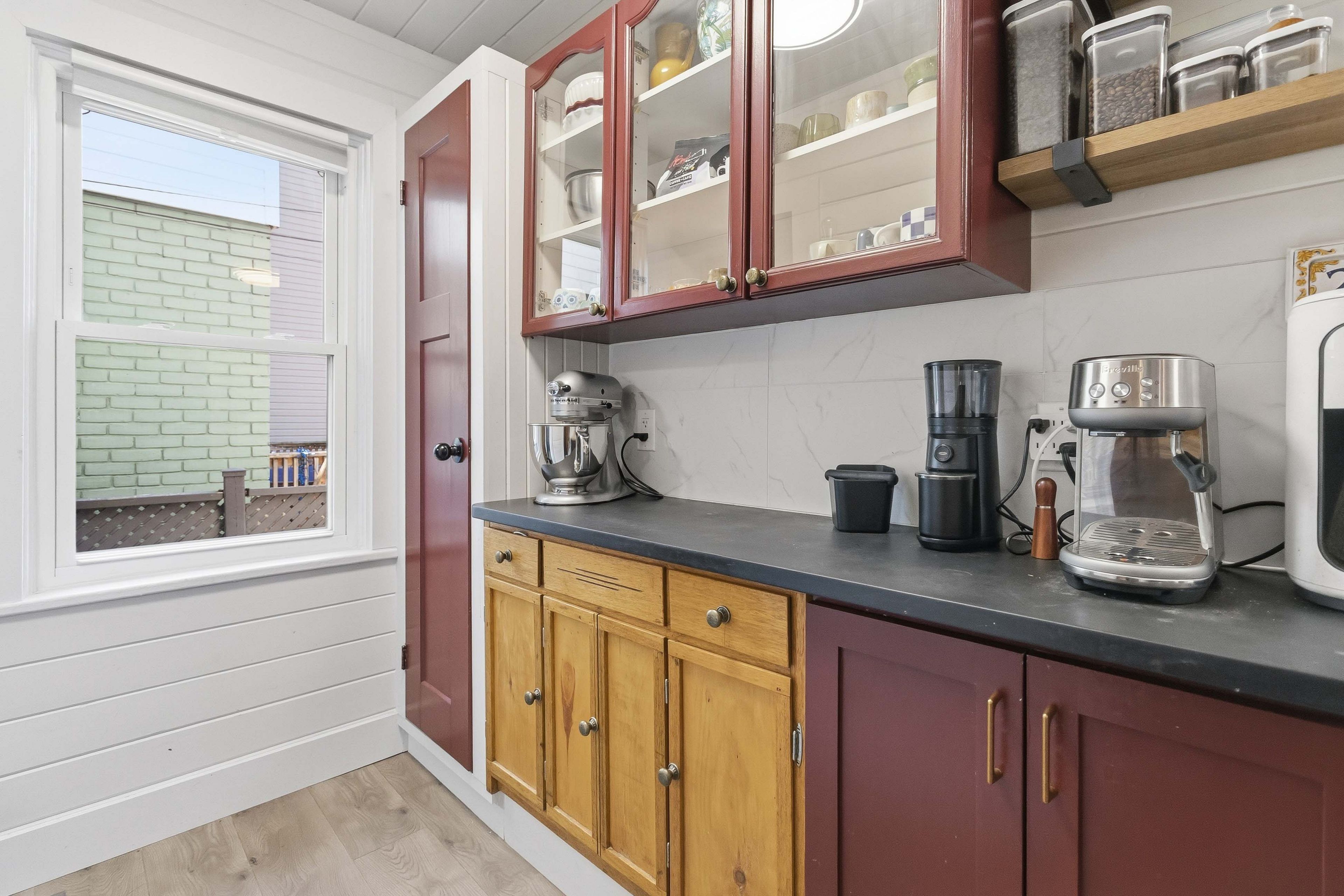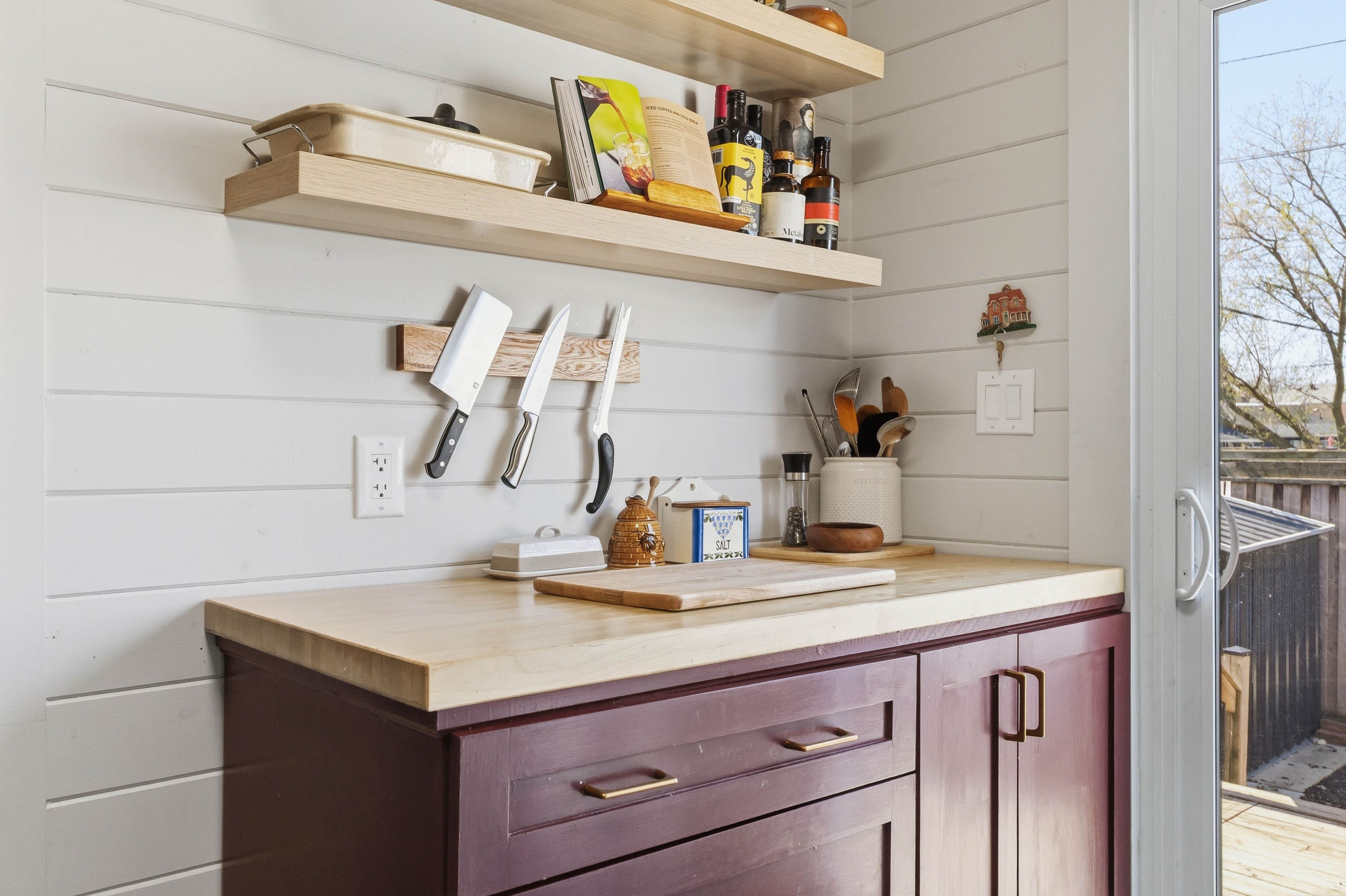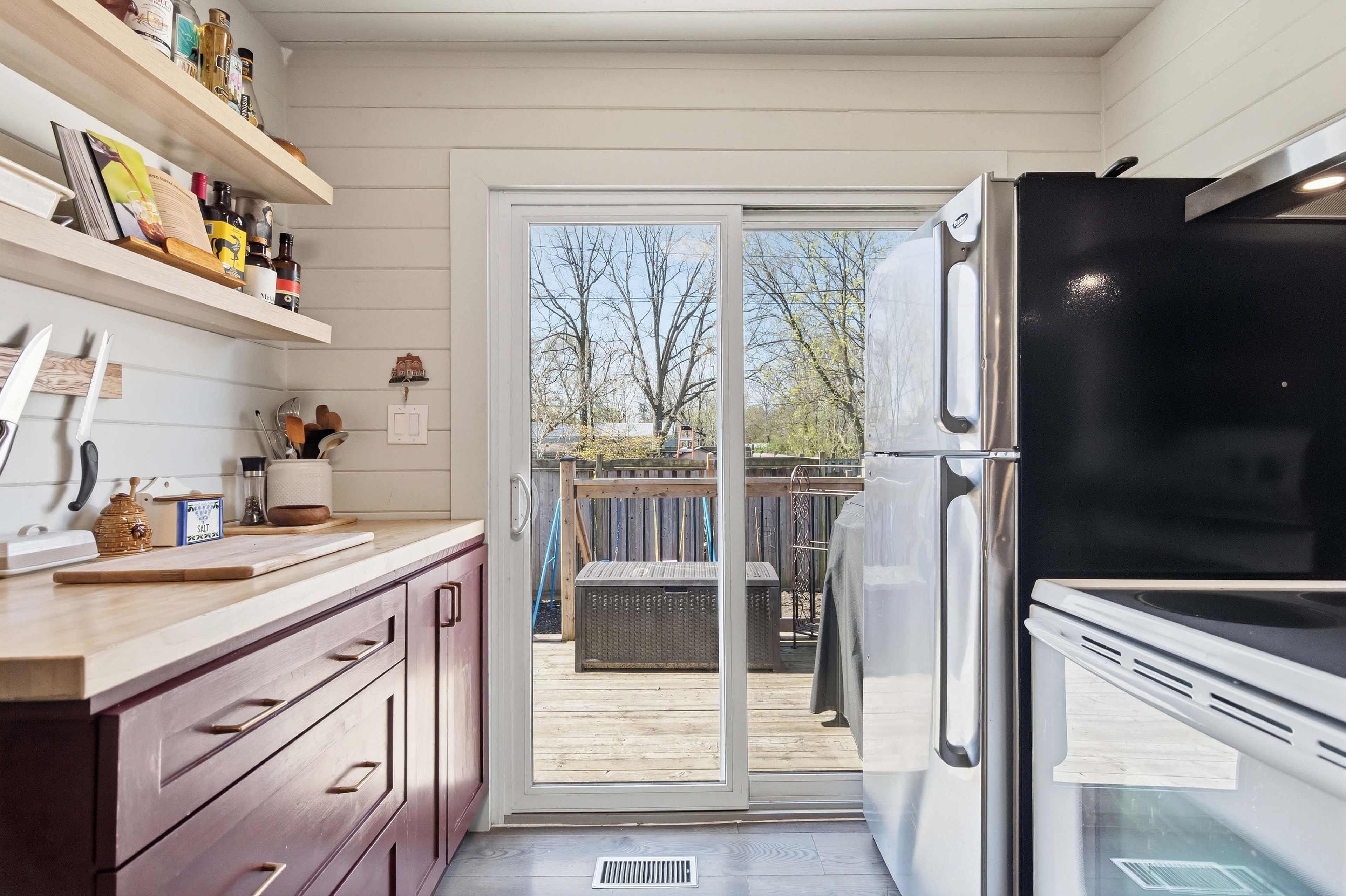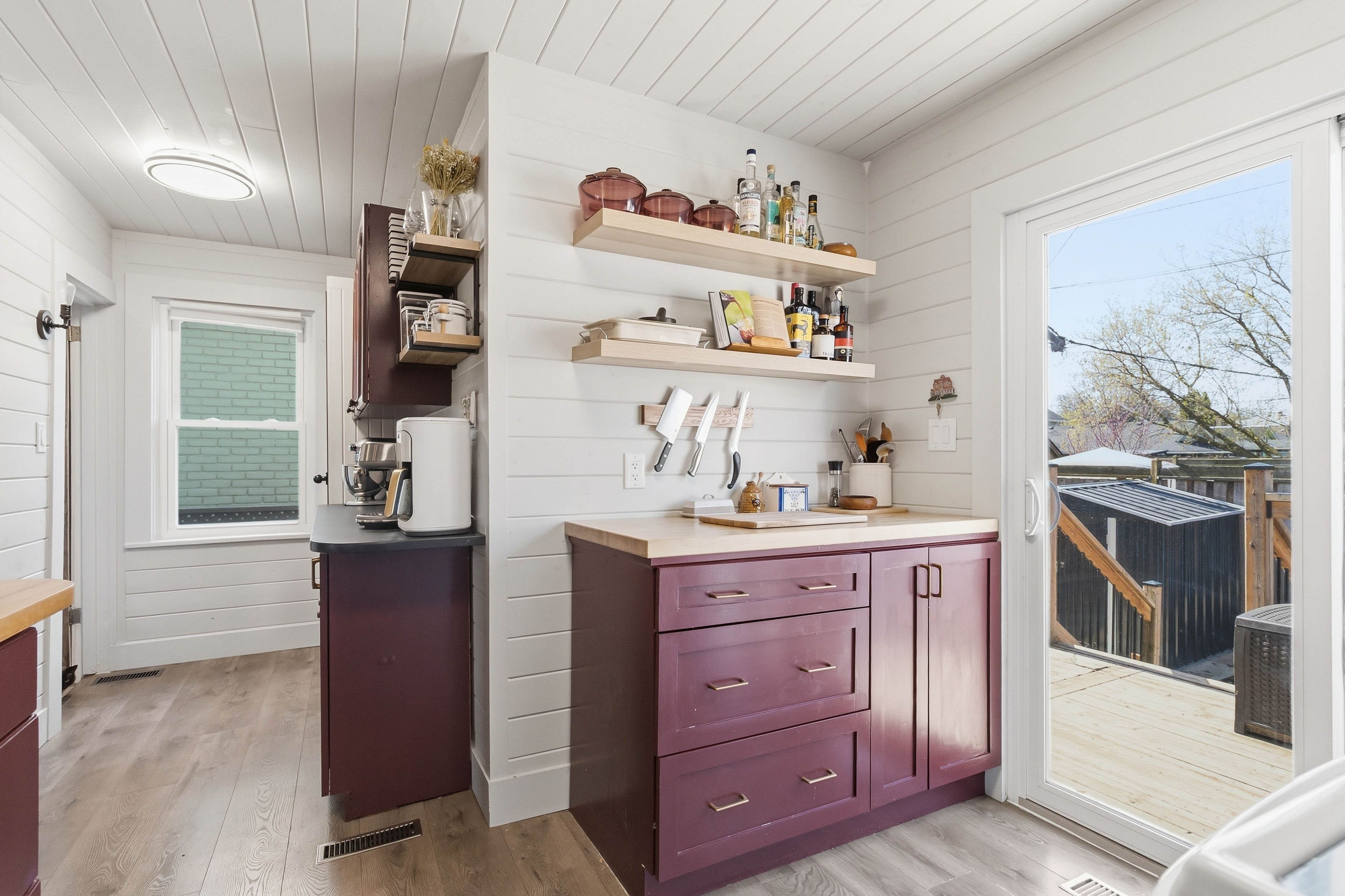 • Fresh kitchen with modern cabinetry and access to a landscaped backyard.