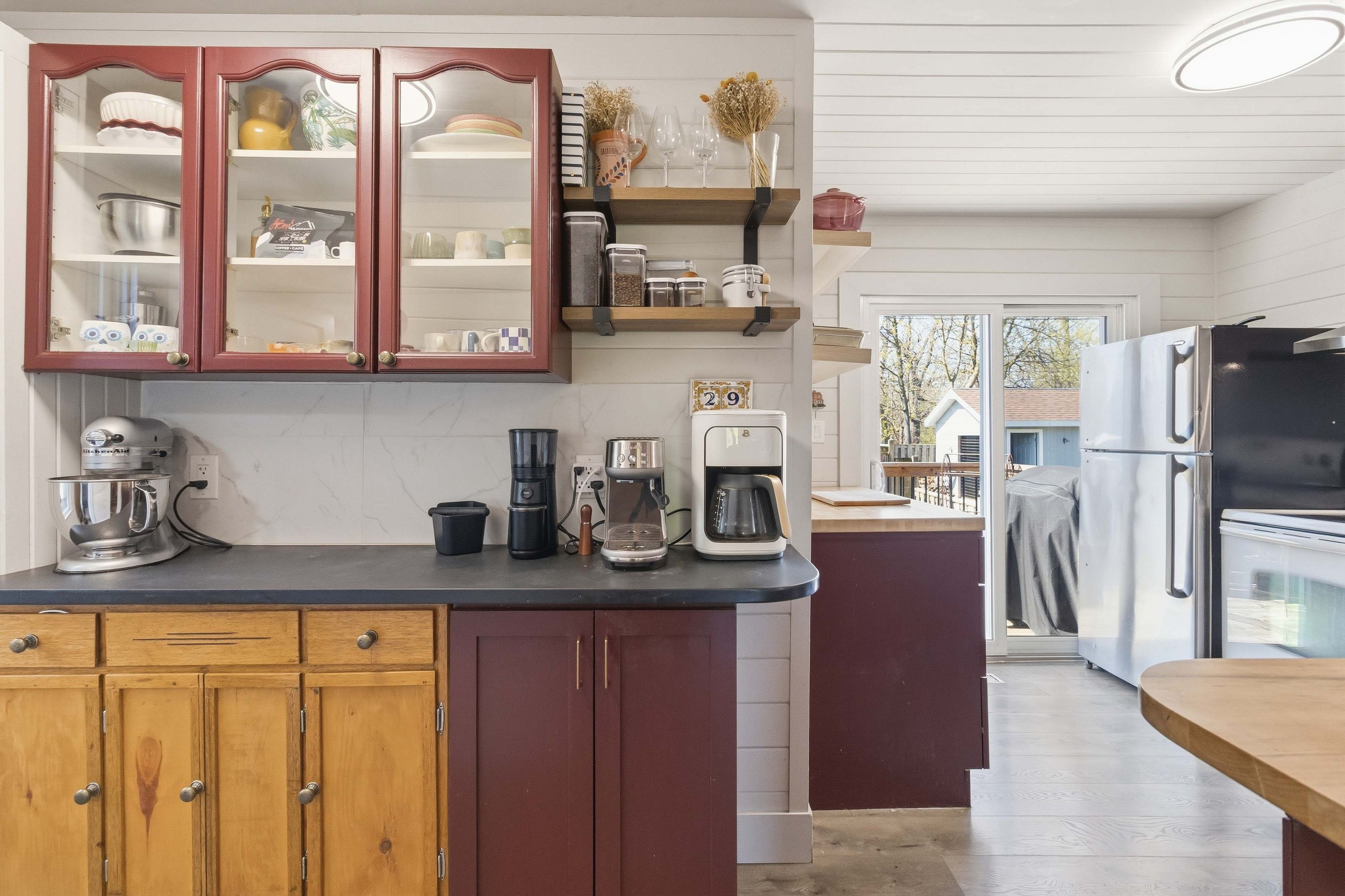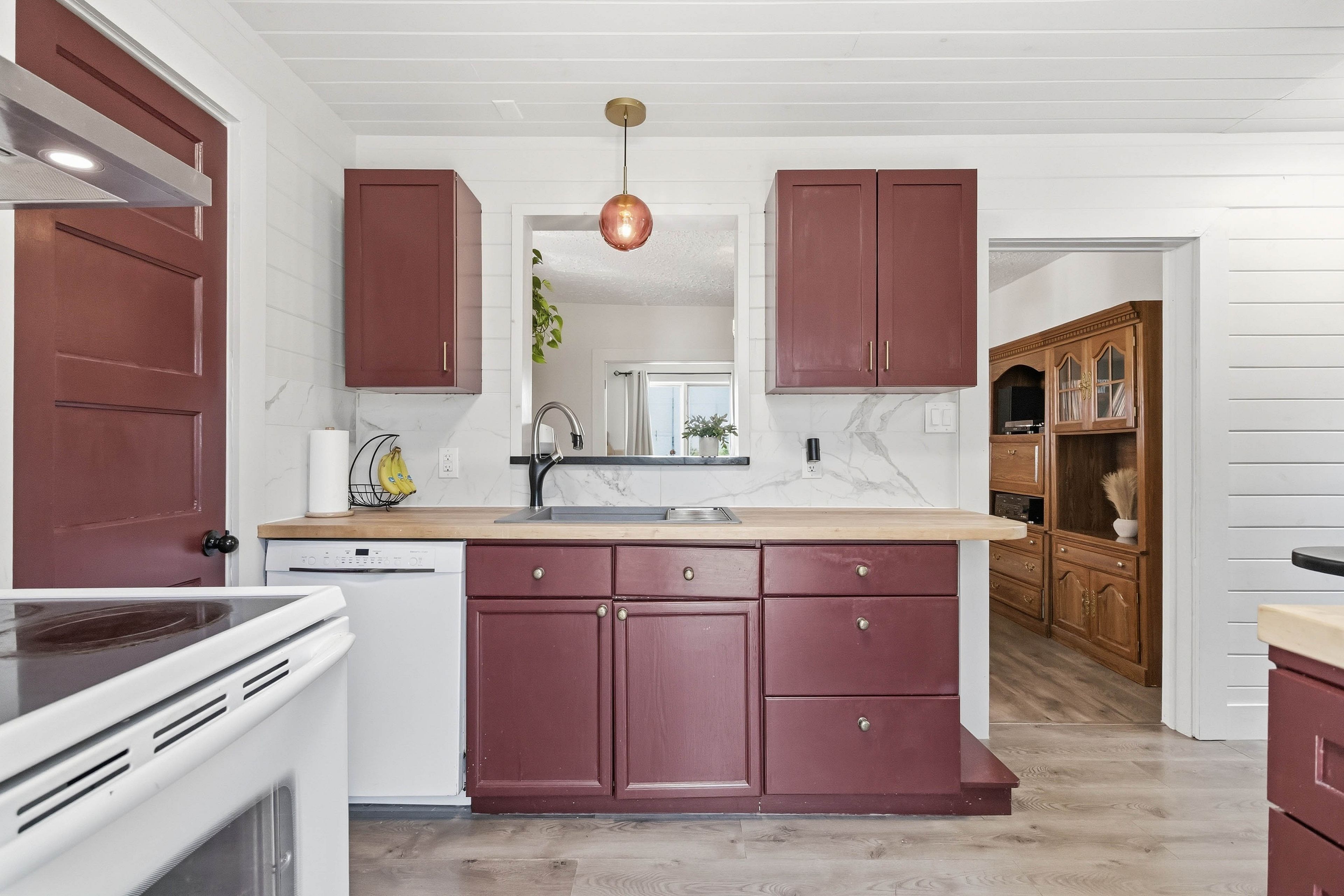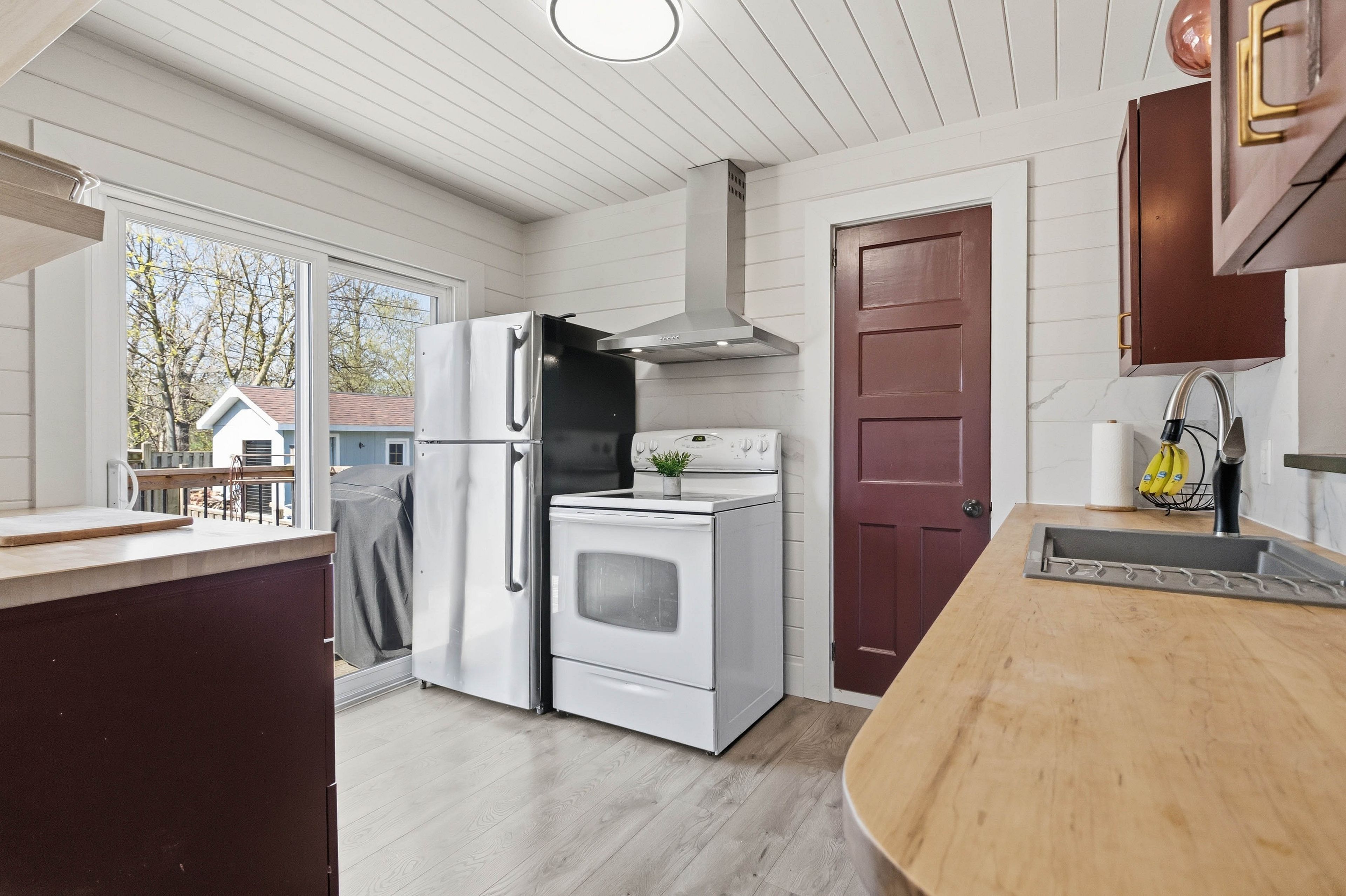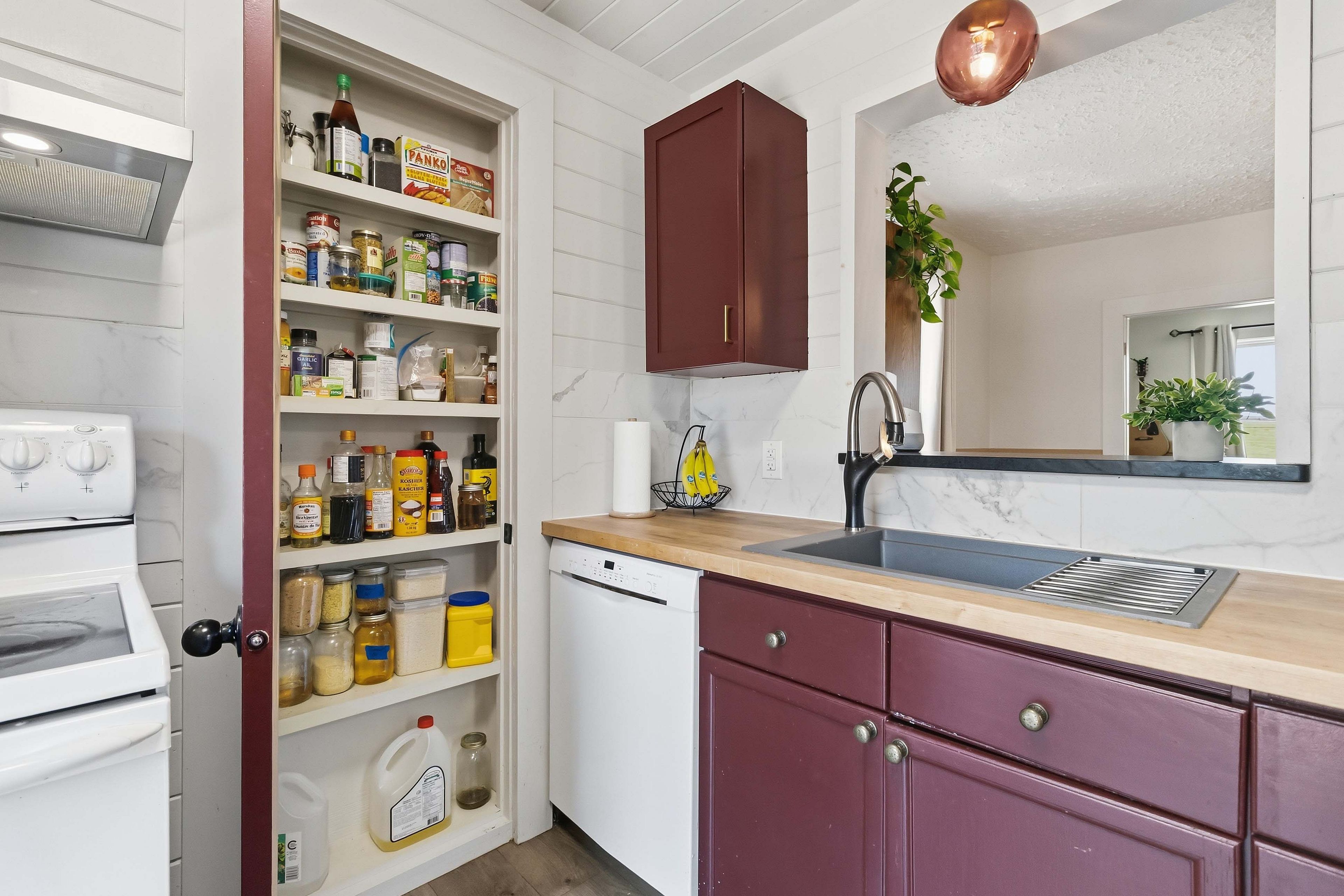 • Fresh kitchen with modern cabinetry and access to a landscaped backyard.