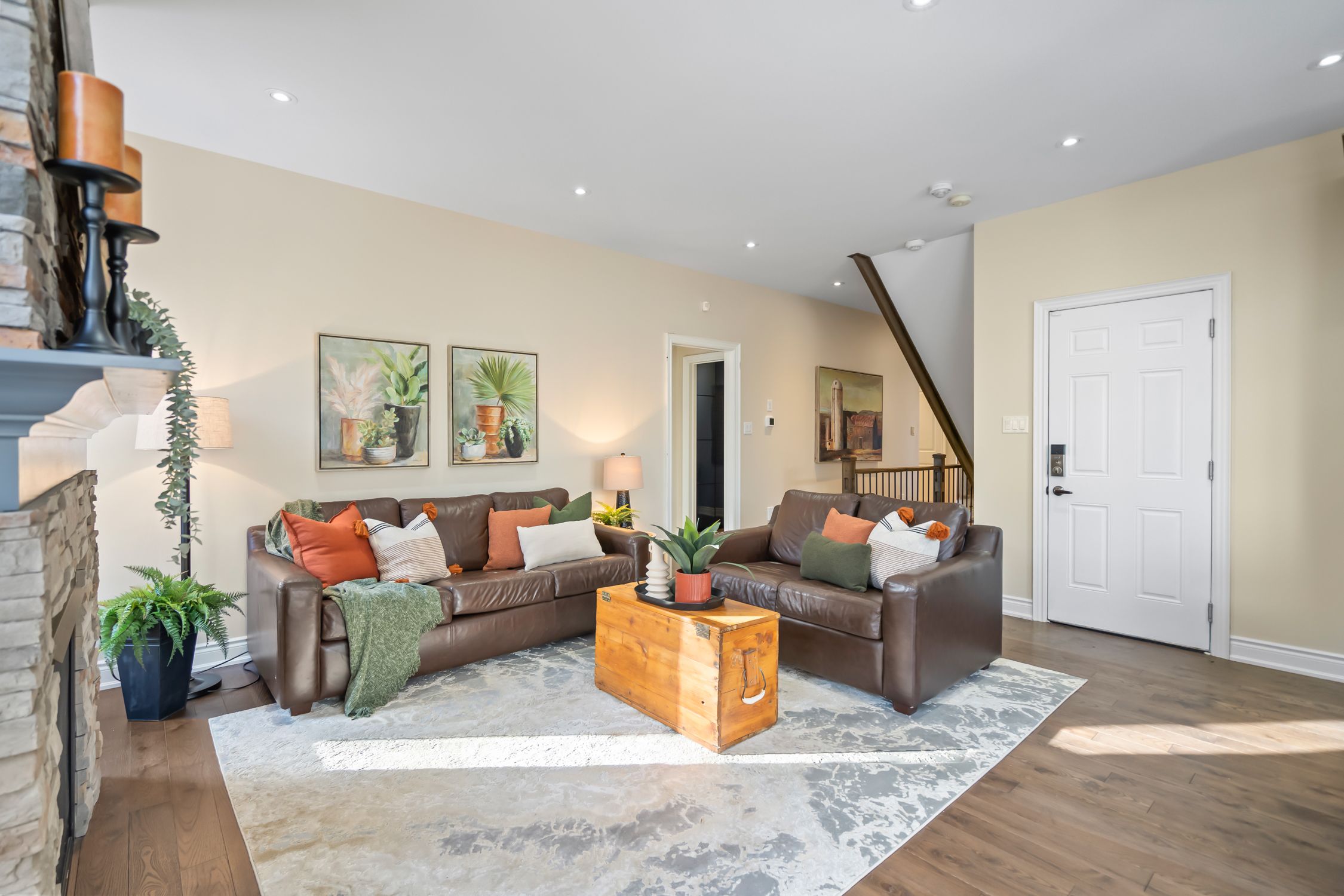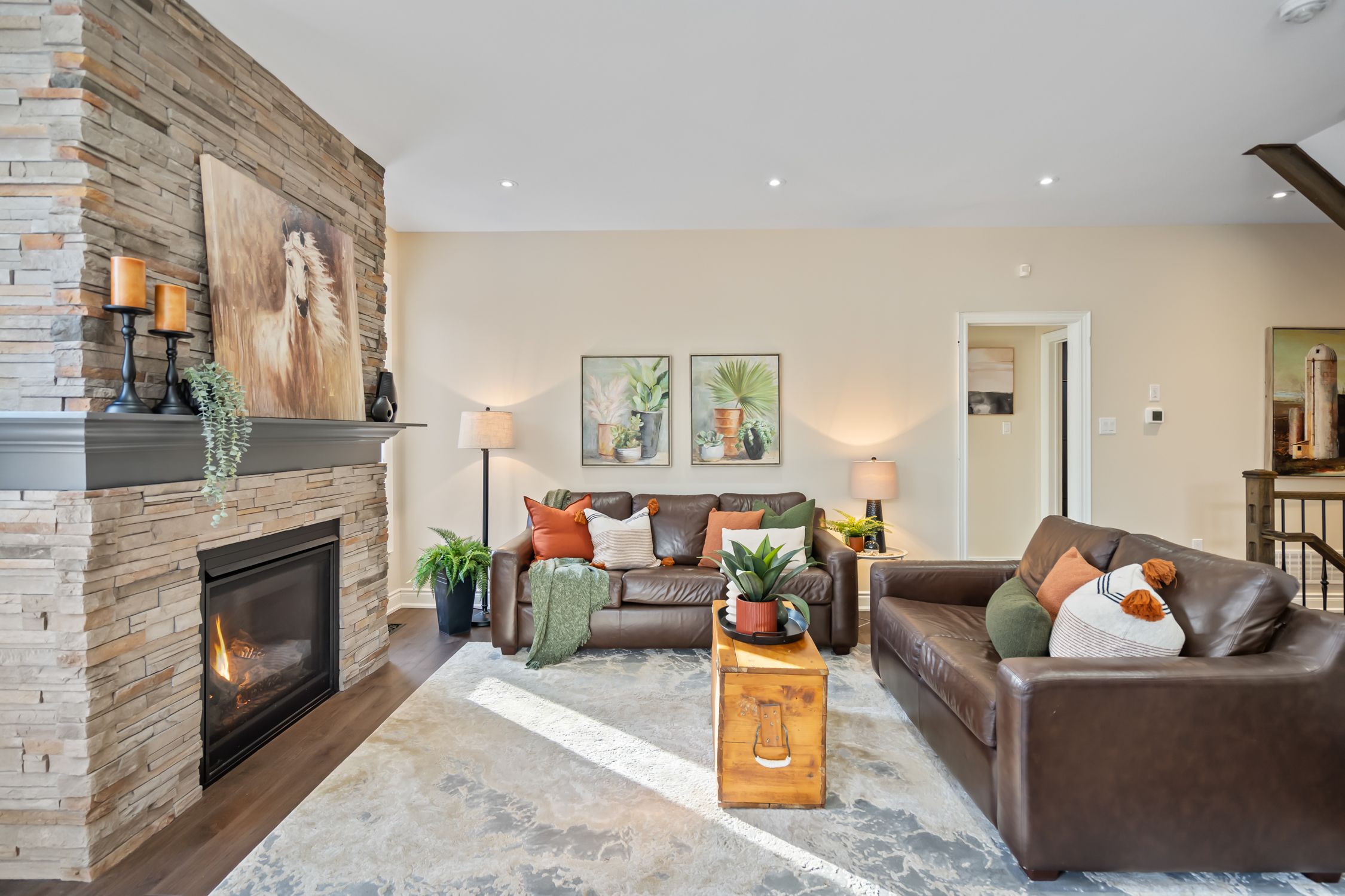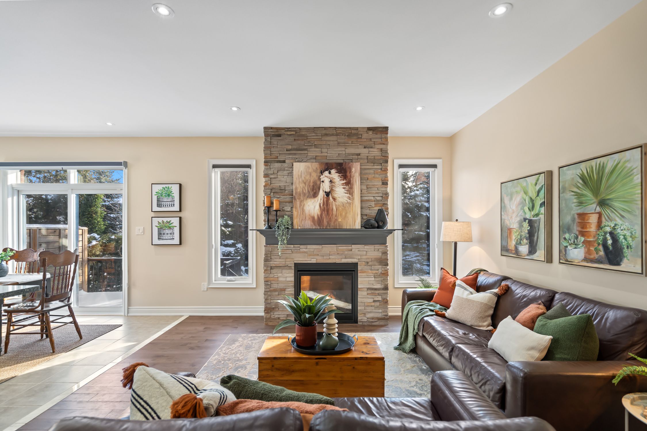 • Open concept layout with gas fireplace, large windows, and modern kitchen.