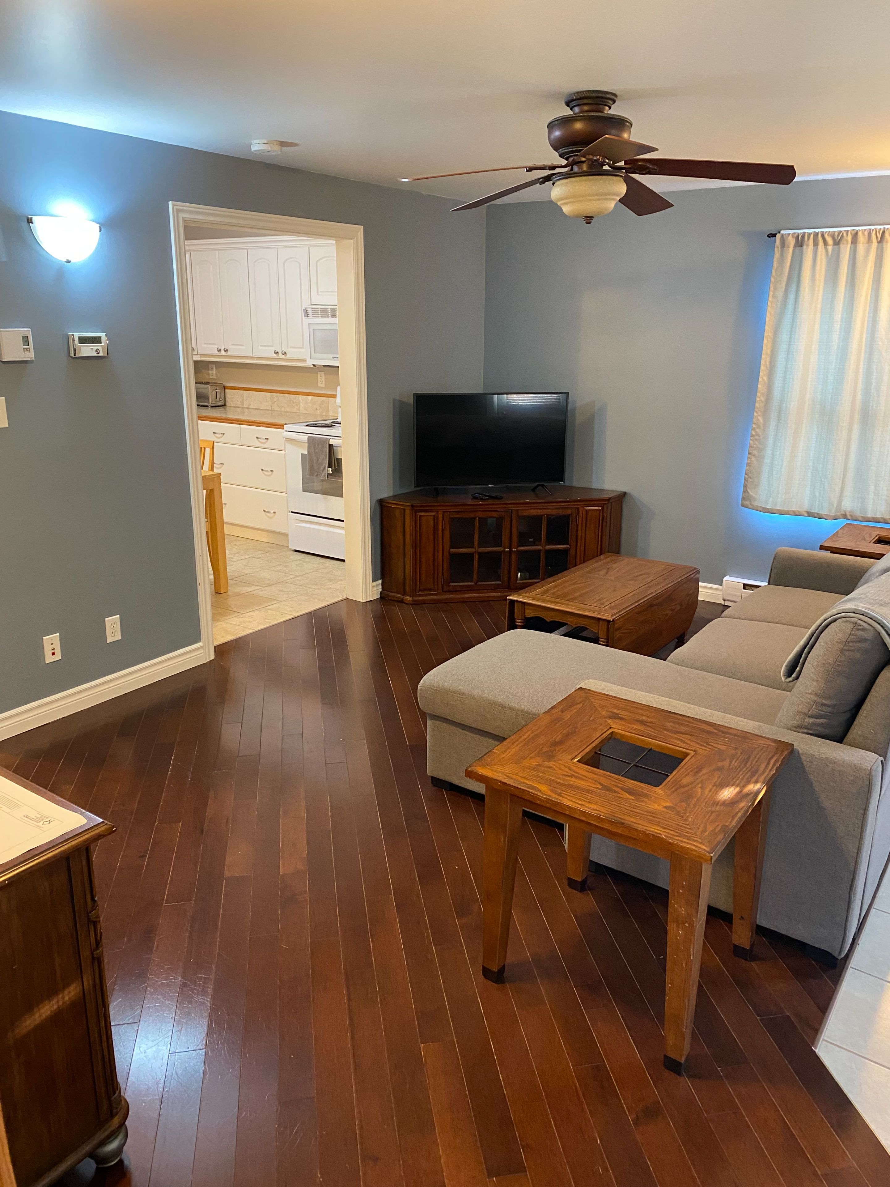 • Bright interior with warm hardwood floors and spacious living area.