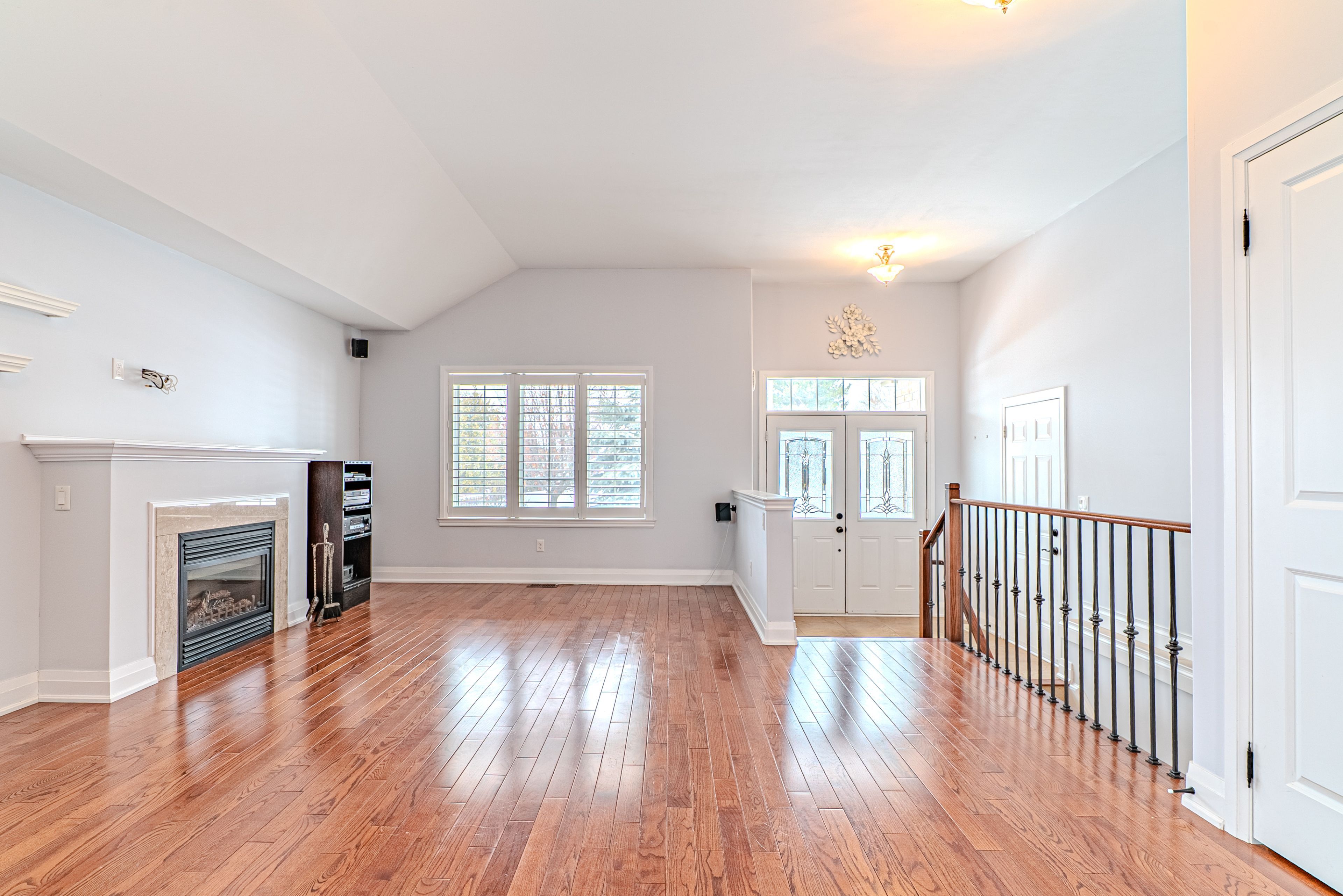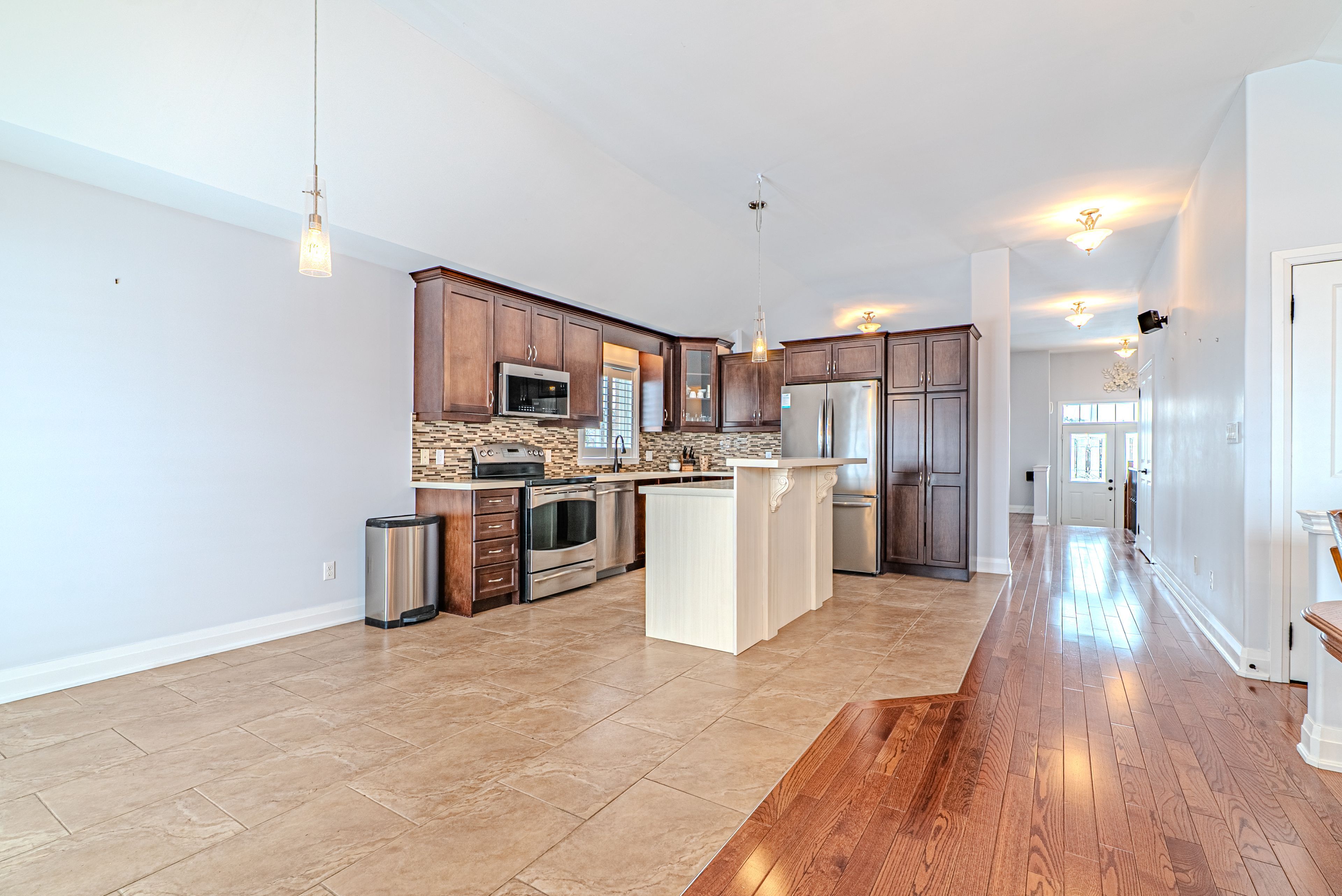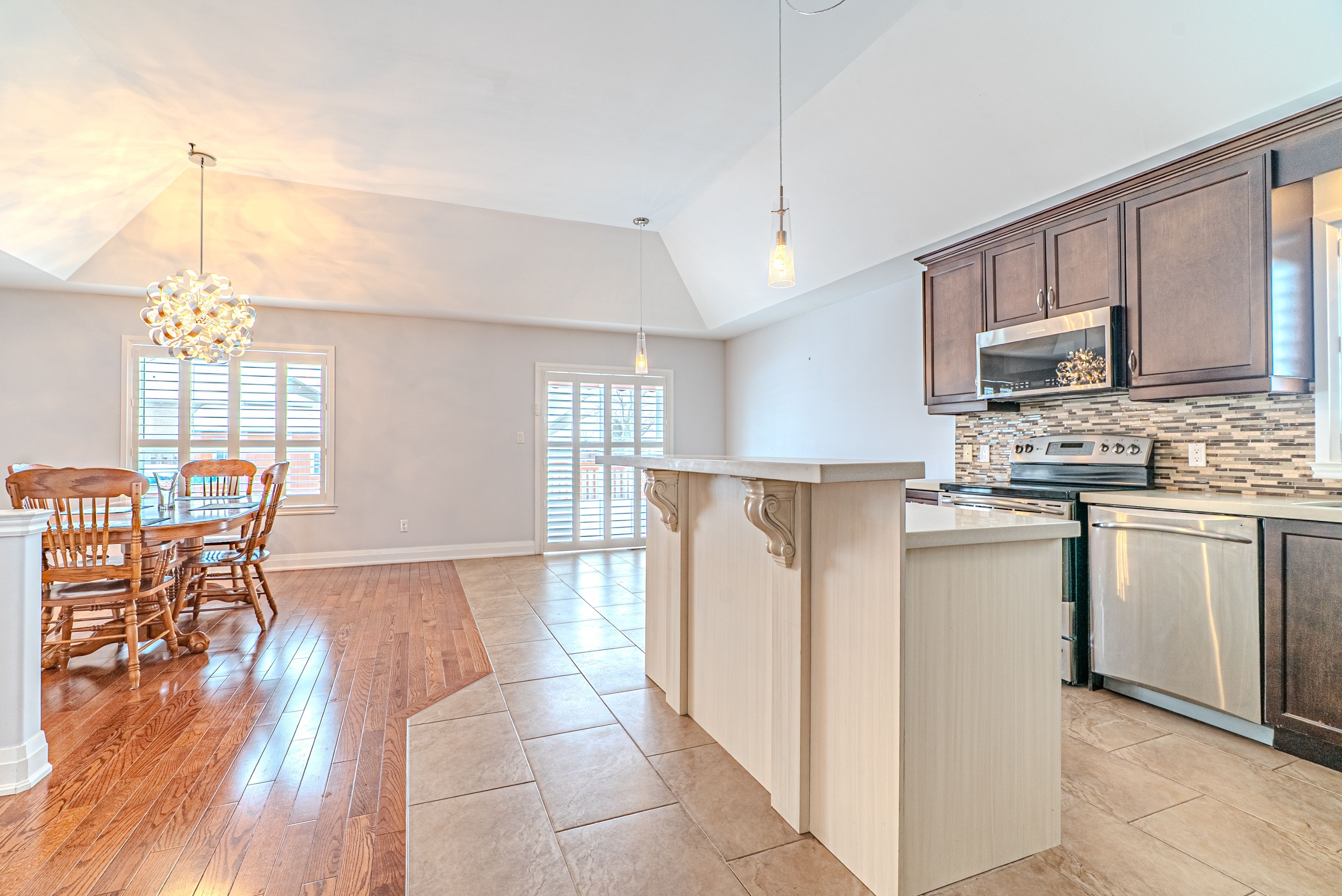 • Modern open concept design with vaulted ceilings and hardwood flooring.