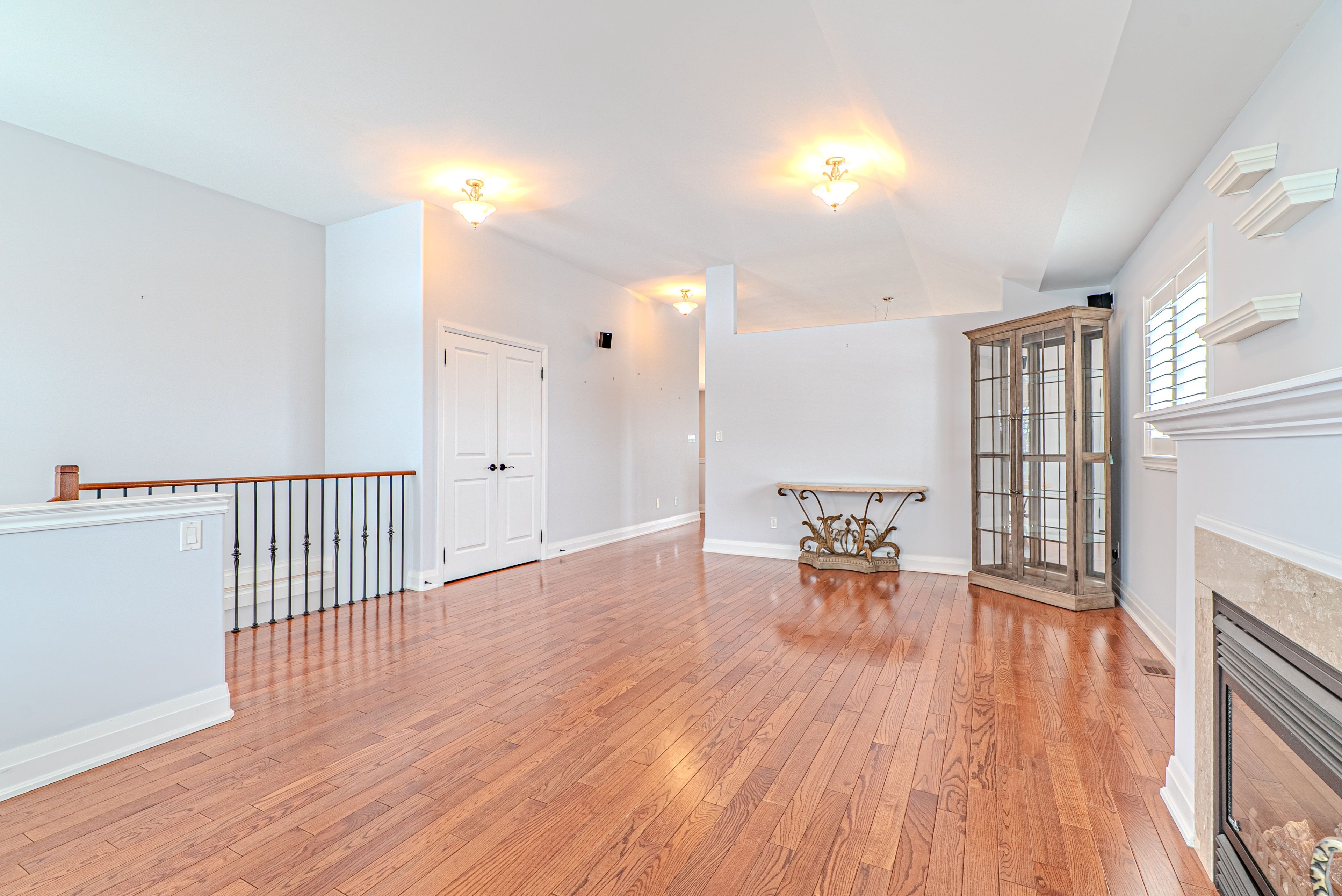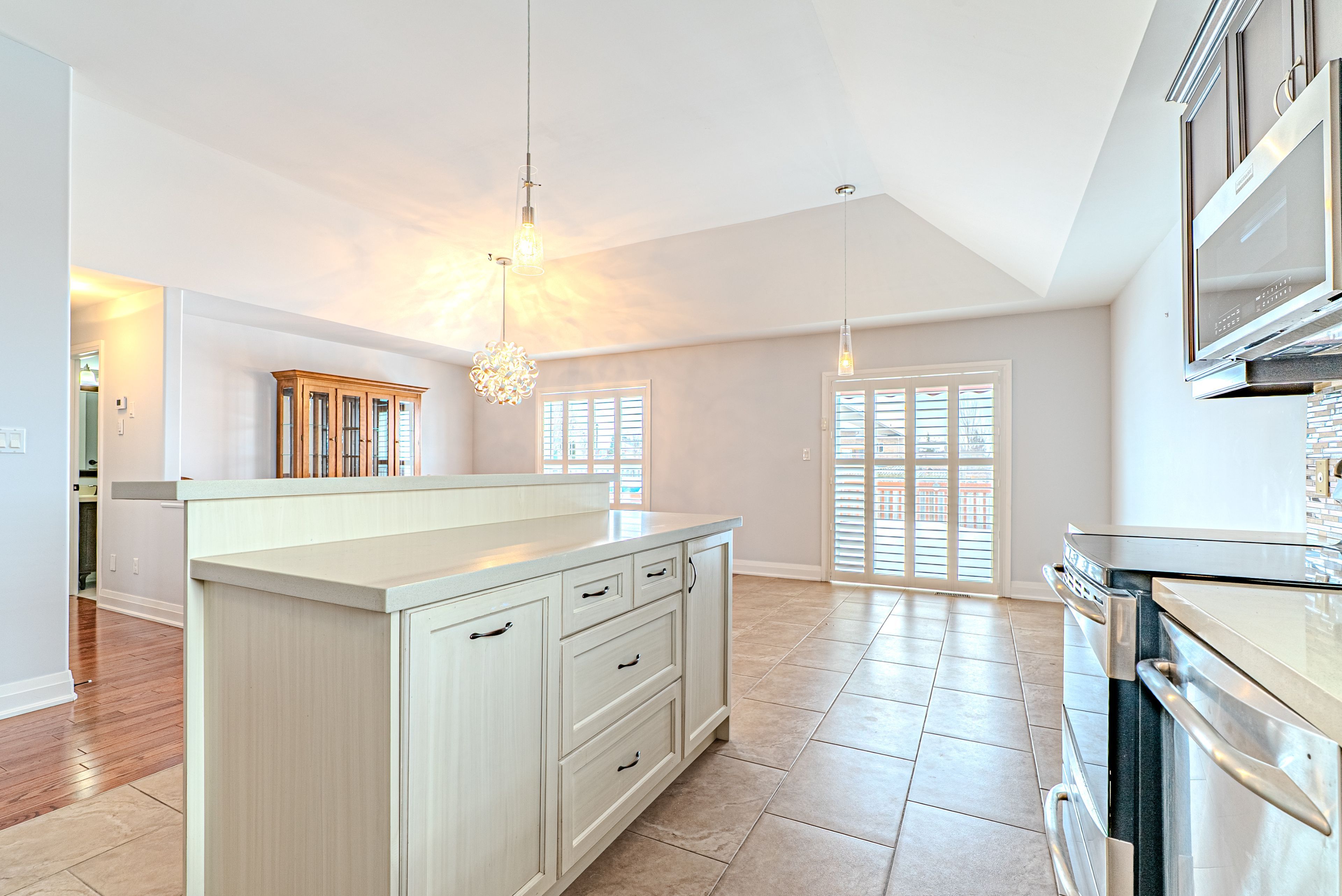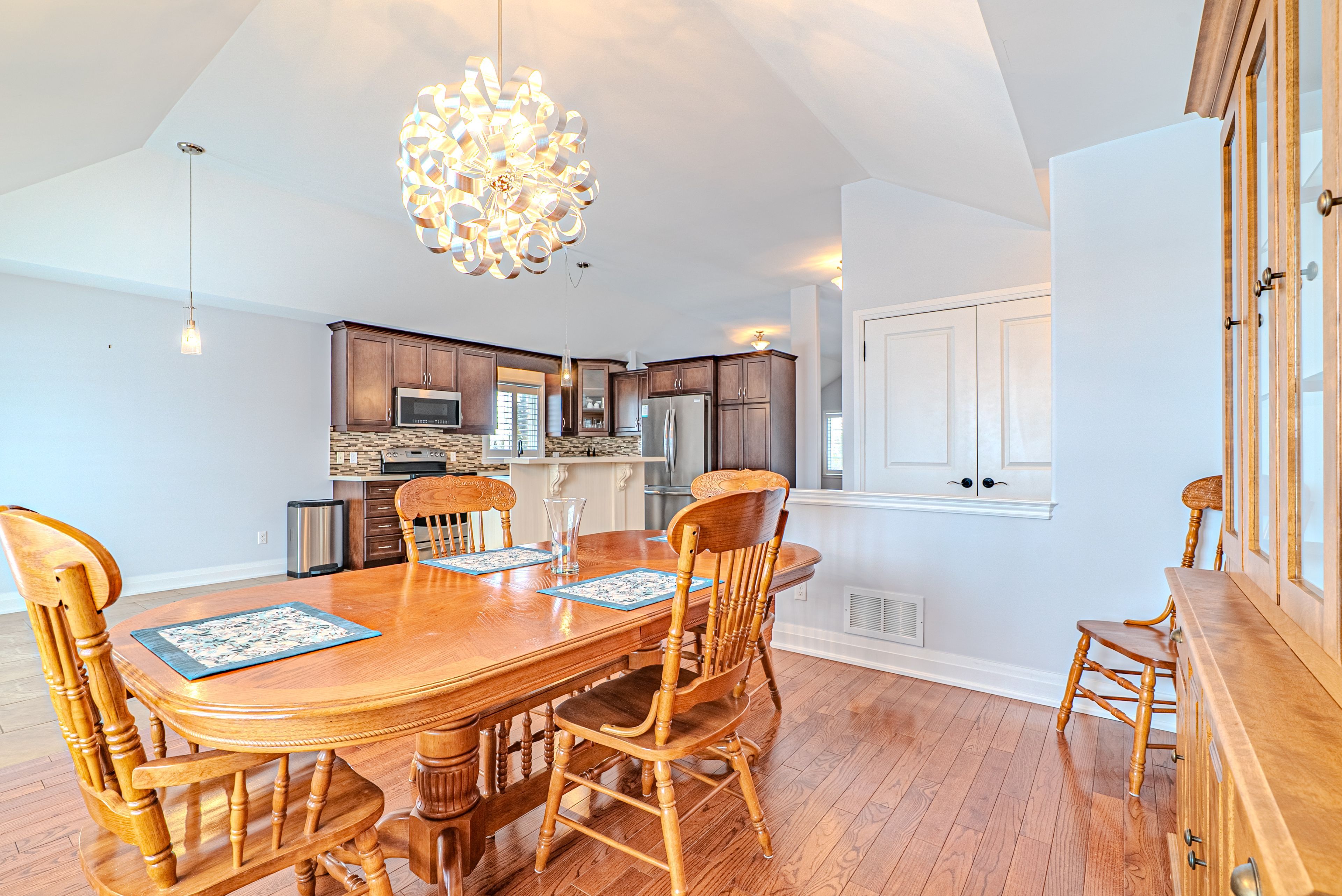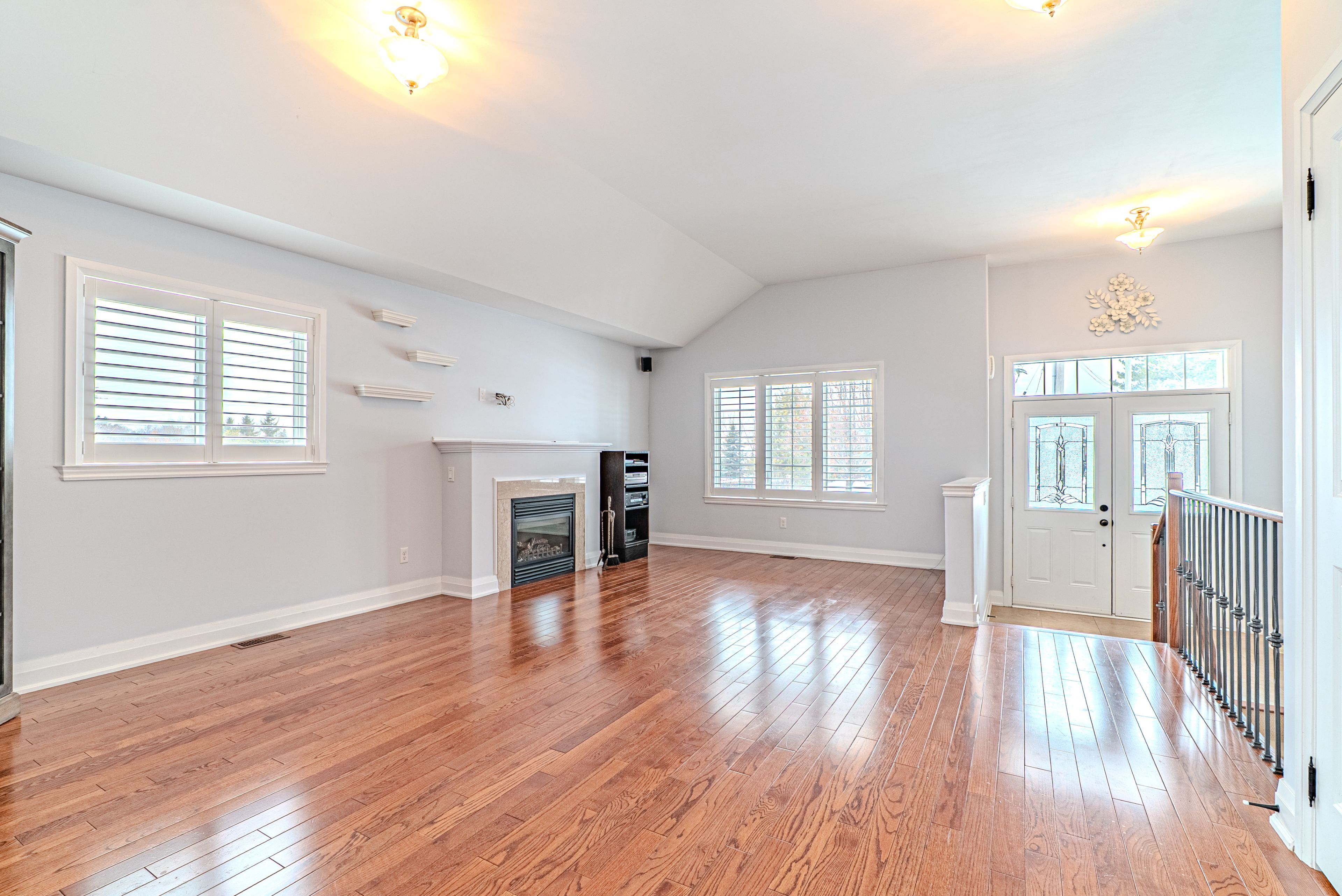 • Modern open concept design with vaulted ceilings and hardwood flooring.