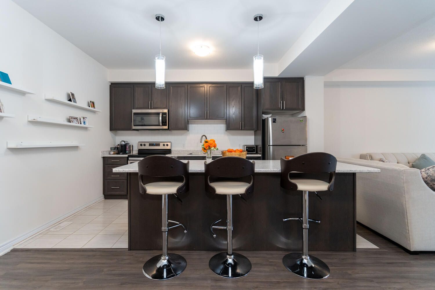 Stunning 3-storey townhome in the highly desirable waterdown community offering 3+1 bedrooms, 3. 5 washrooms, 2,151 sq ft of living space, and just 7 years new. This elegant brick and stone home features a spacious foyer leading to a private main-level bedroom with a full washroom, ideal for guests, in-laws, or a home office. The chef's kitchen boasts a central island, stainless steel appliances, stylish backsplash, and ample cabinetry, flowing seamlessly into a bright open-concept great room with laminate flooring, pot lights, and space for a large dining table-perfect for entertaining. Step out onto the generous balcony for relaxation and fresh air. The third floor offers three spacious bedrooms, two full washrooms, and a convenient laundry area. A fantastic opportunity for first-time home buyers to own a modern, move-in-ready home in one of waterdown's most sought-after neighborhoods-don't miss out!