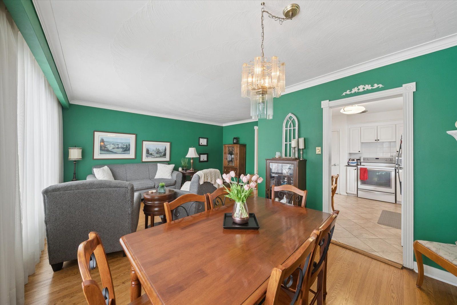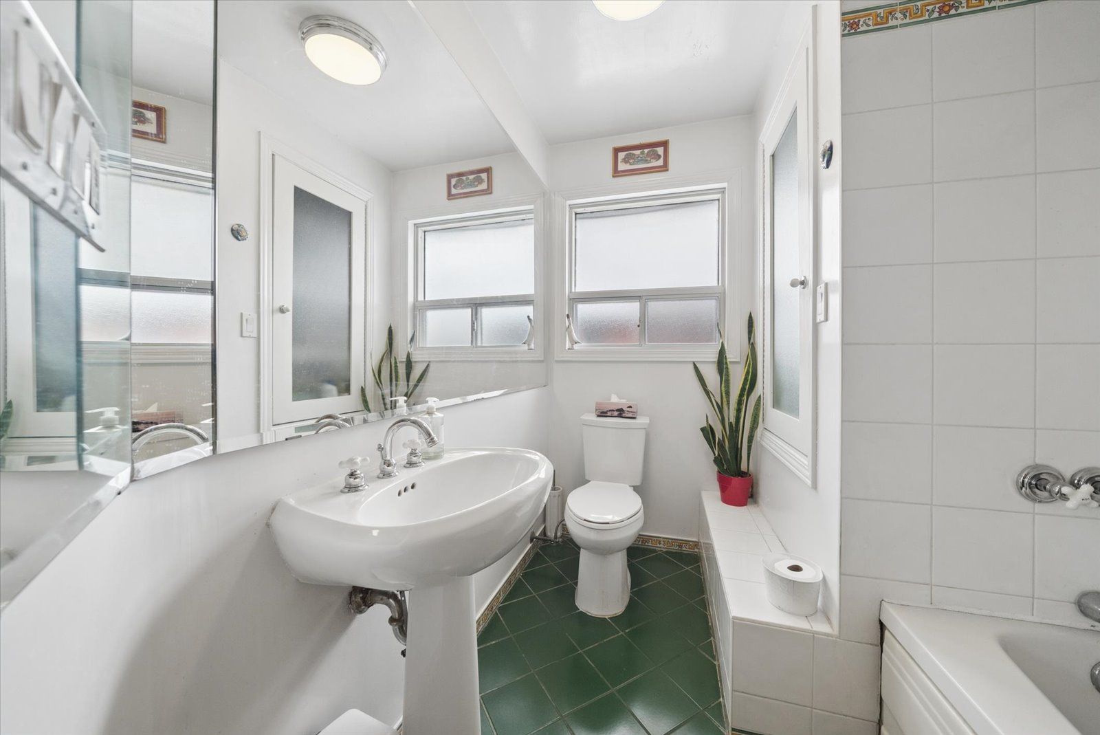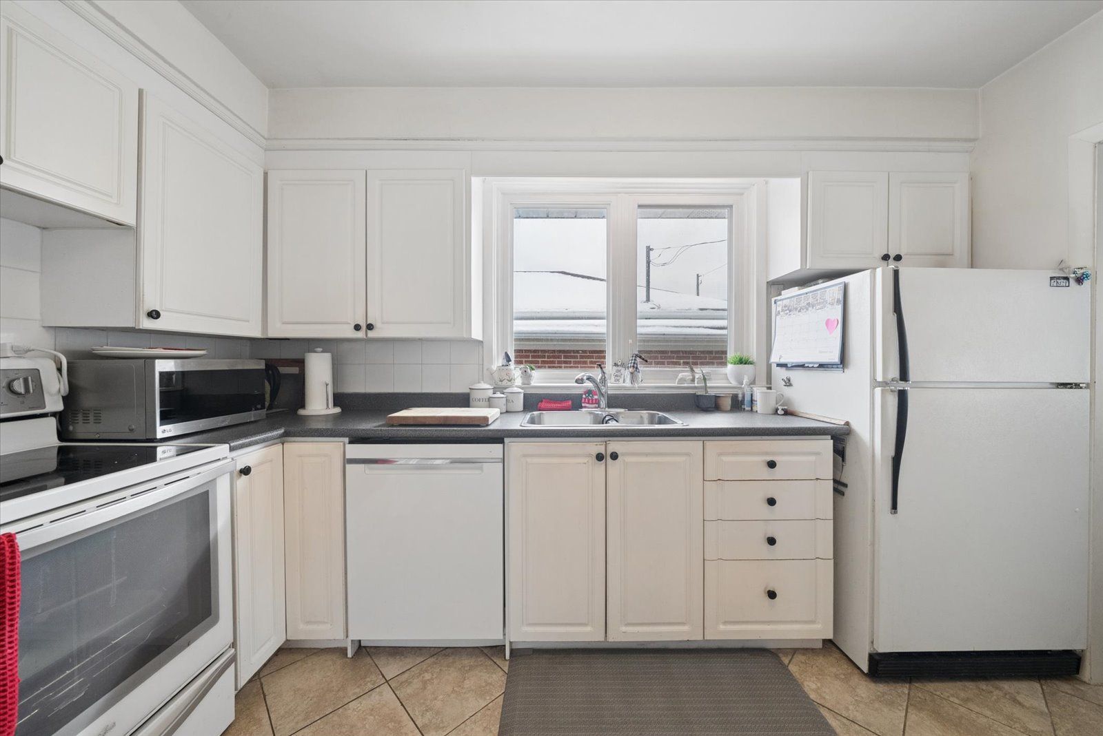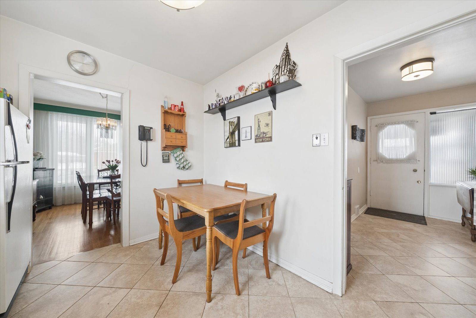 • Family-size eat-in kitchen with ample cupboard space and ceramic flooring.