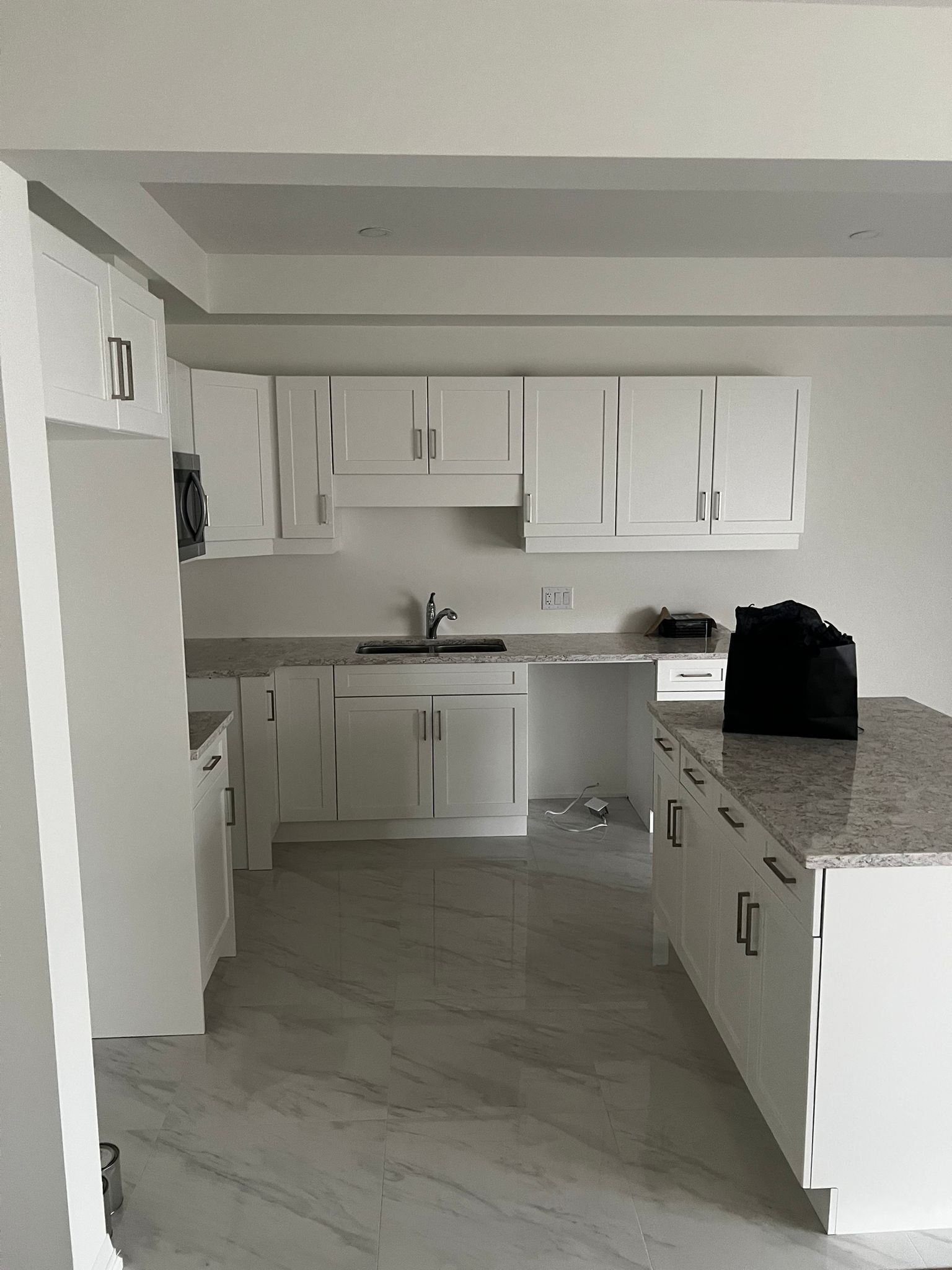 • Chef-inspired kitchen with large marble tiles and hardwood flooring.