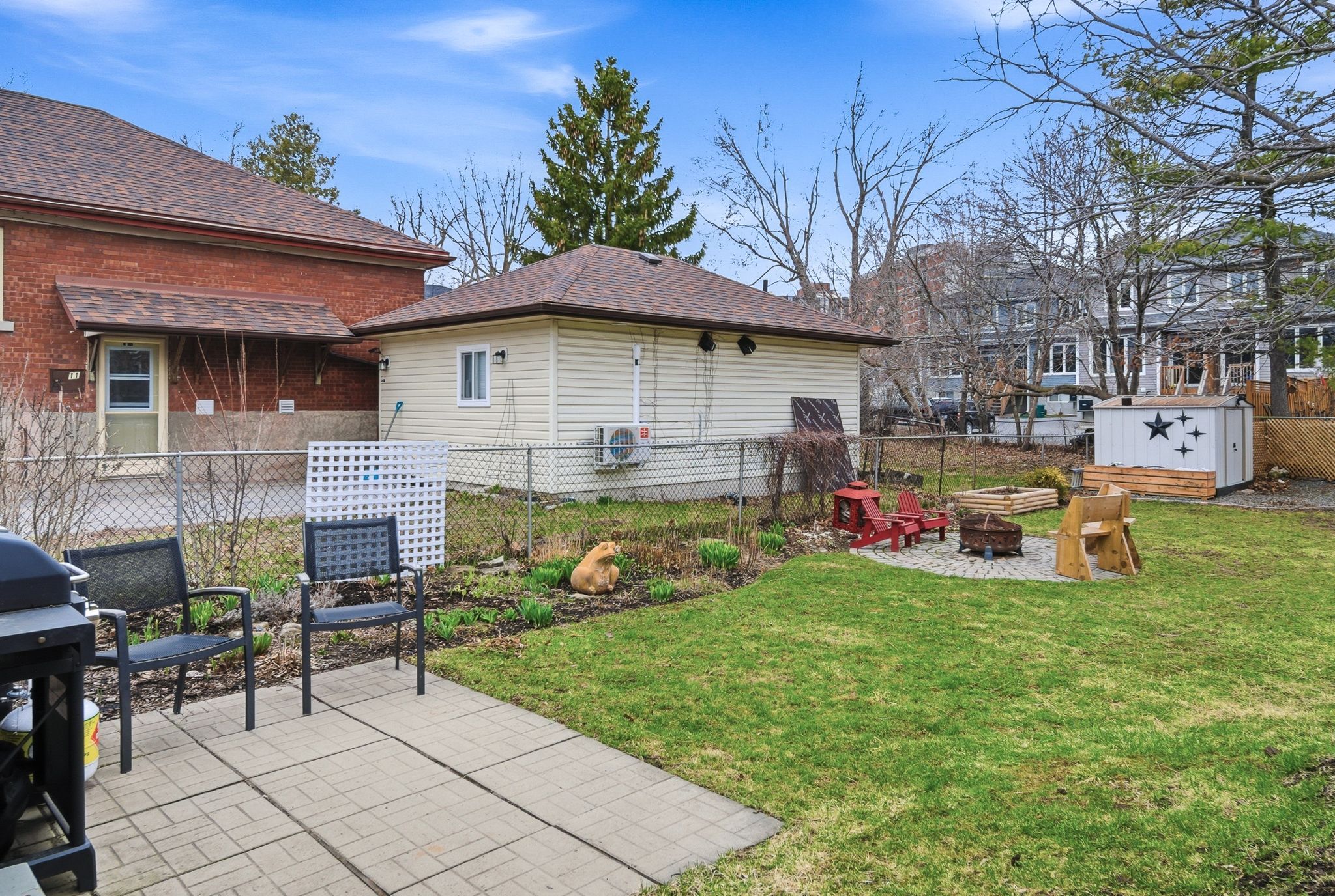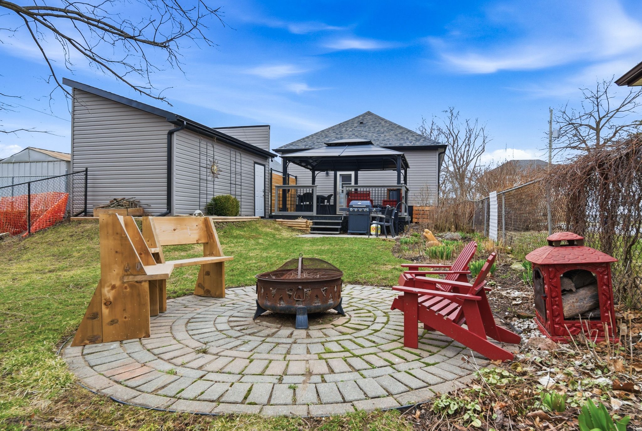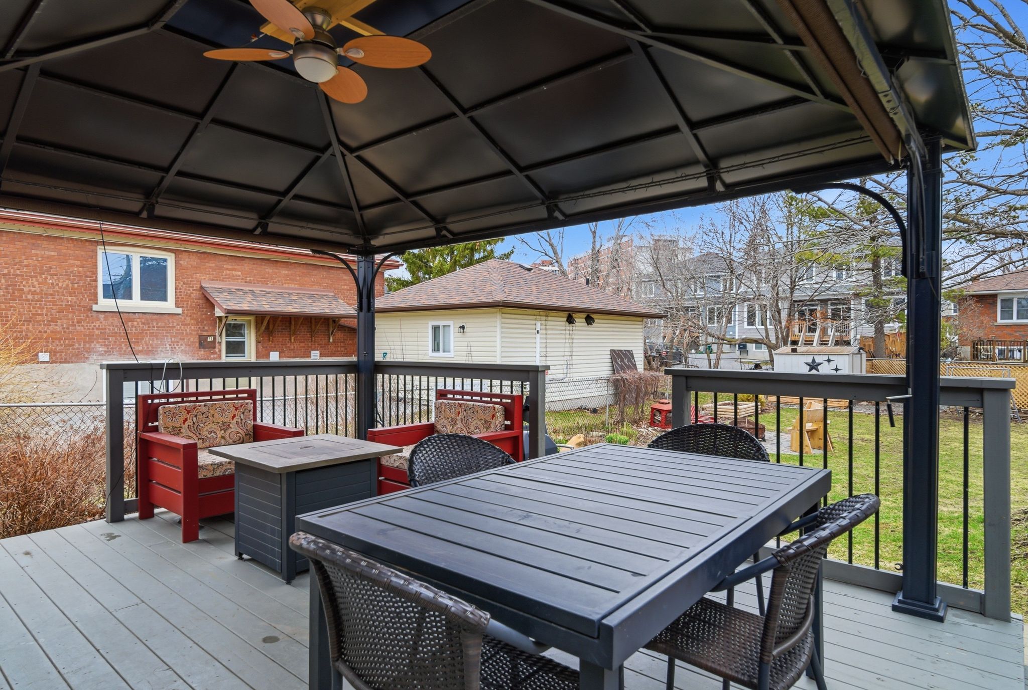 • Fully fenced backyard with deck, fire pit, and mature trees.