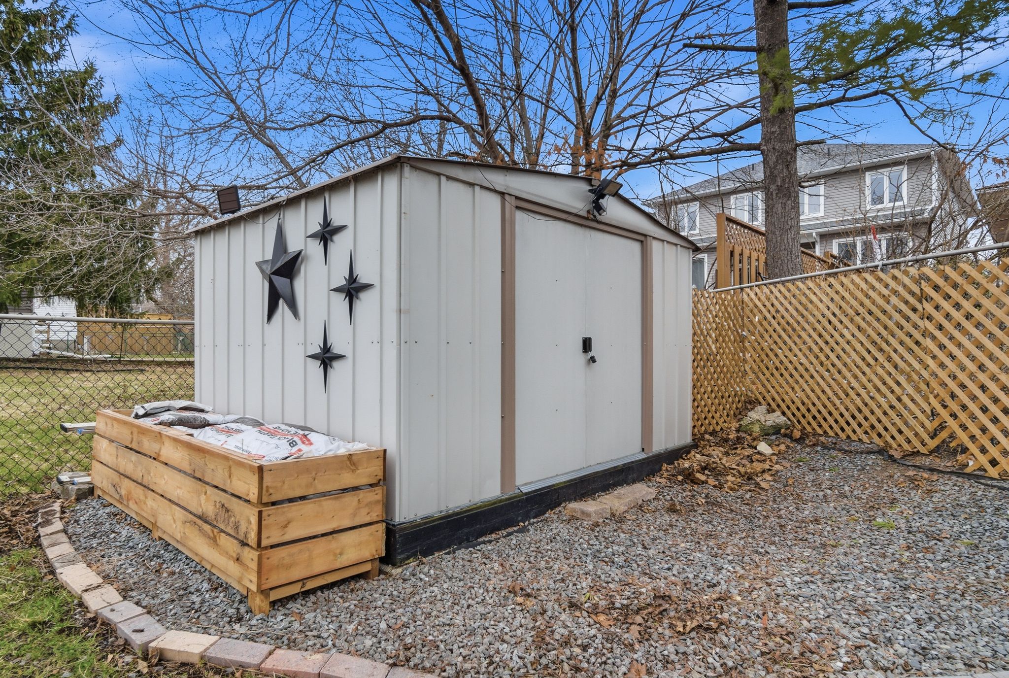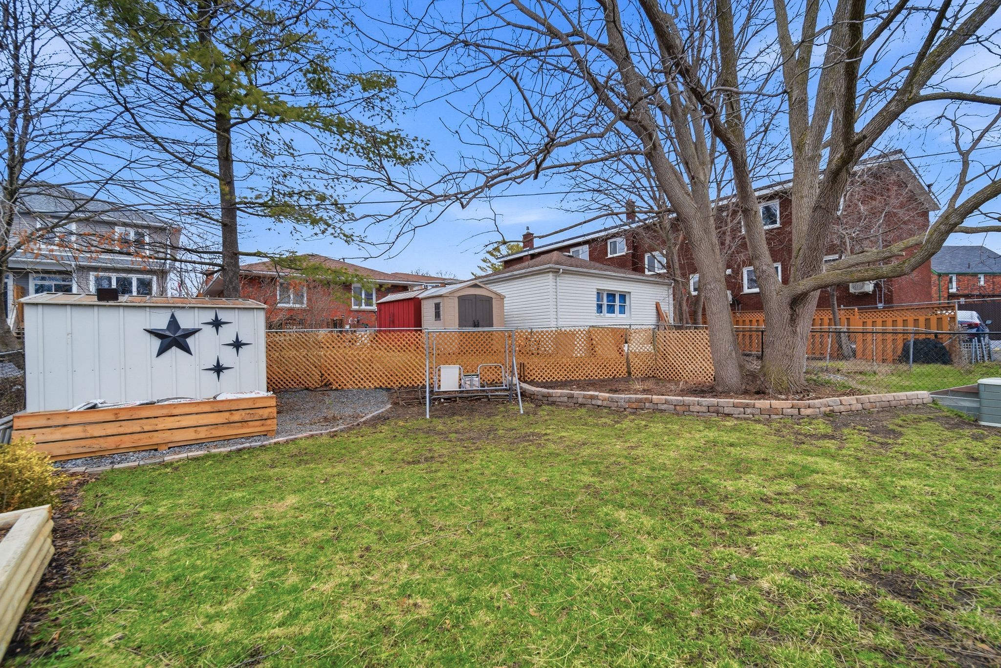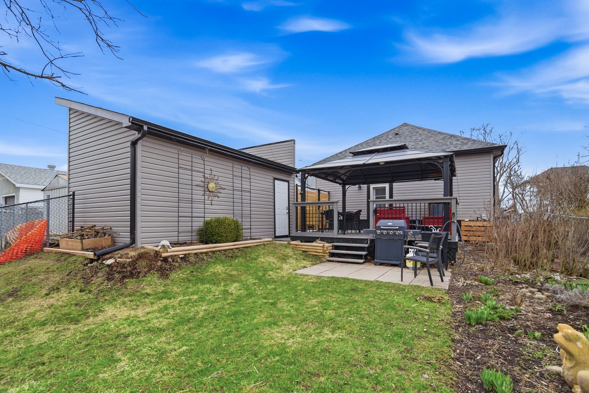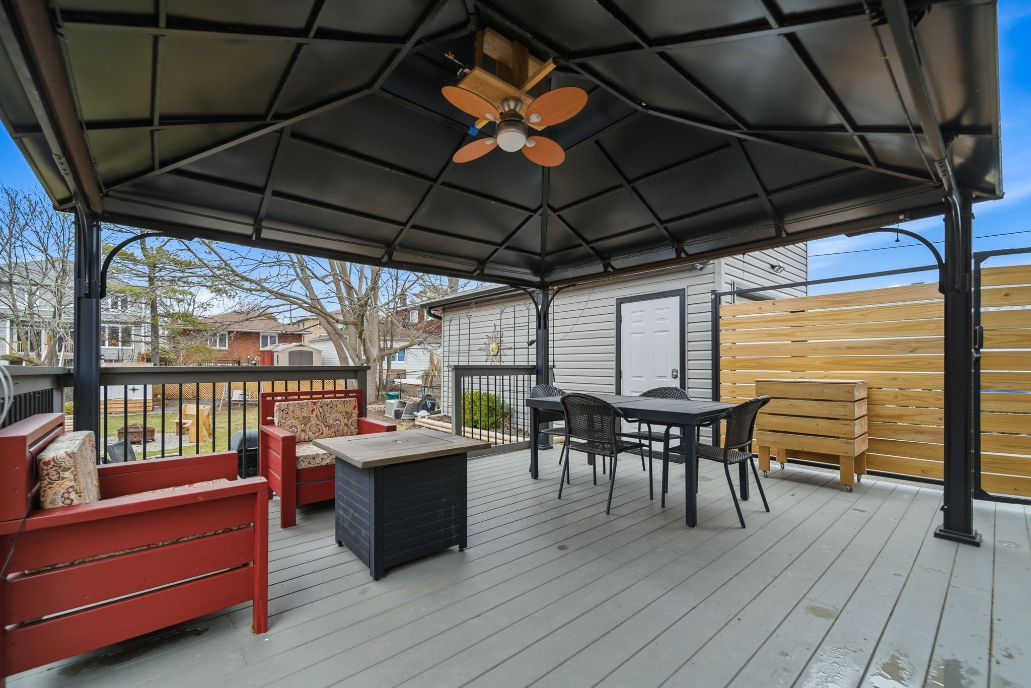 • Fully fenced backyard with deck, fire pit, and mature trees.