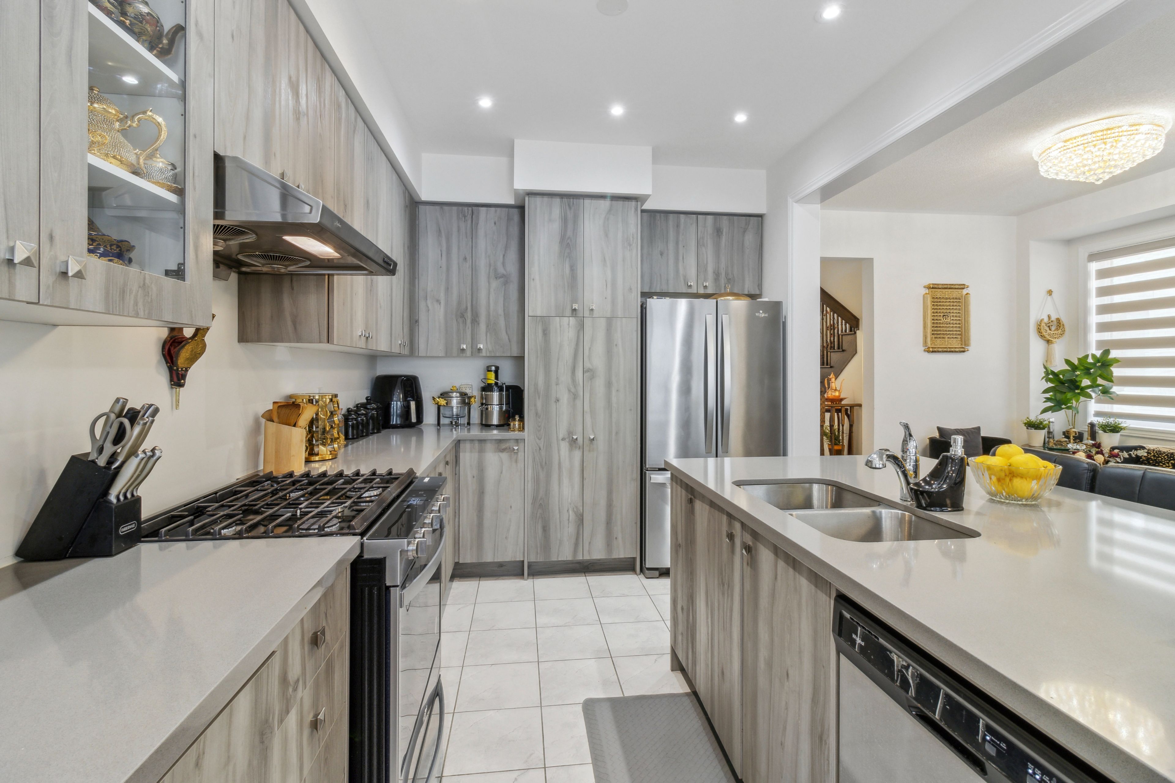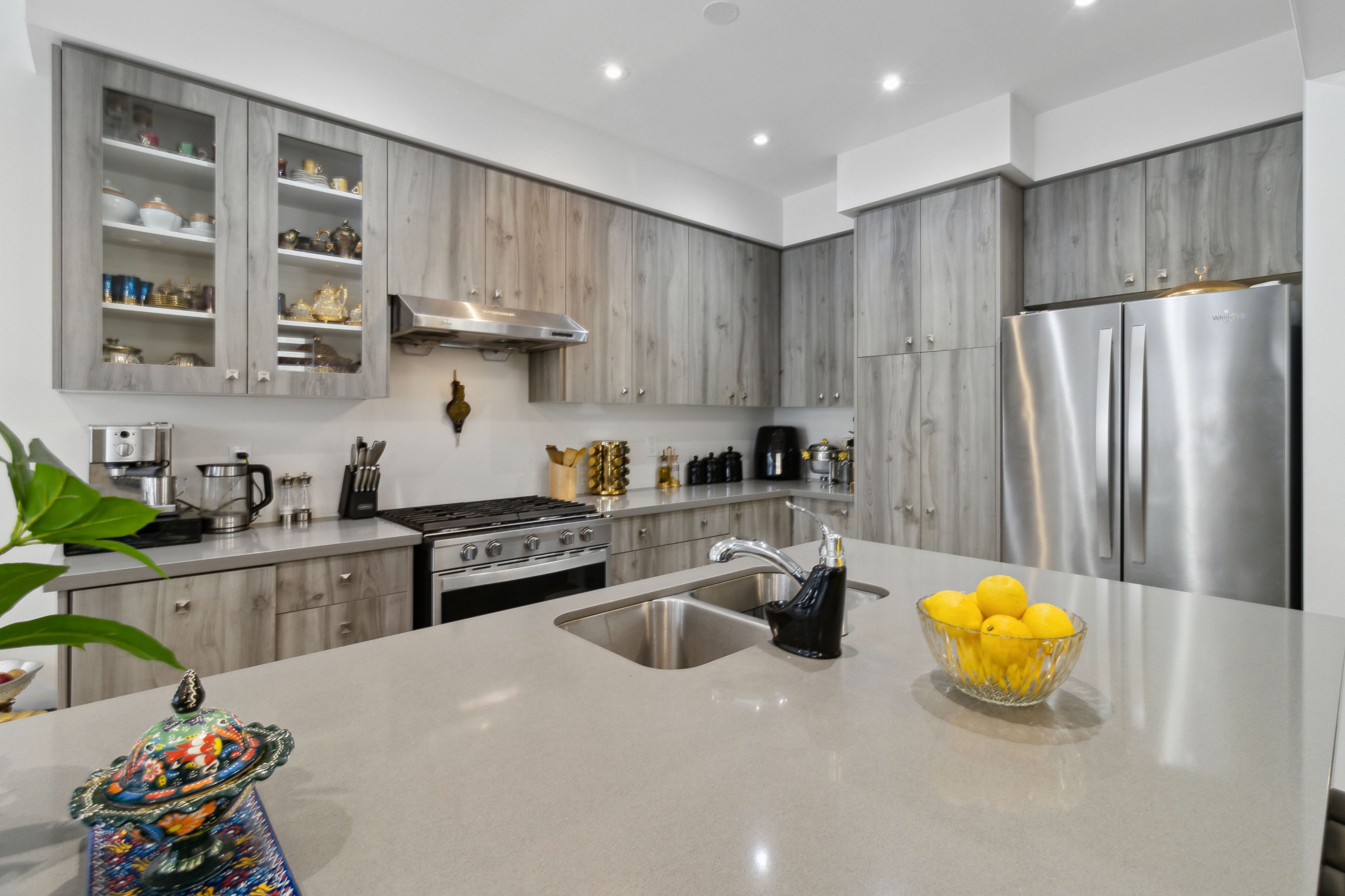• Modern chef's kitchen with quartz countertops and smart appliances.