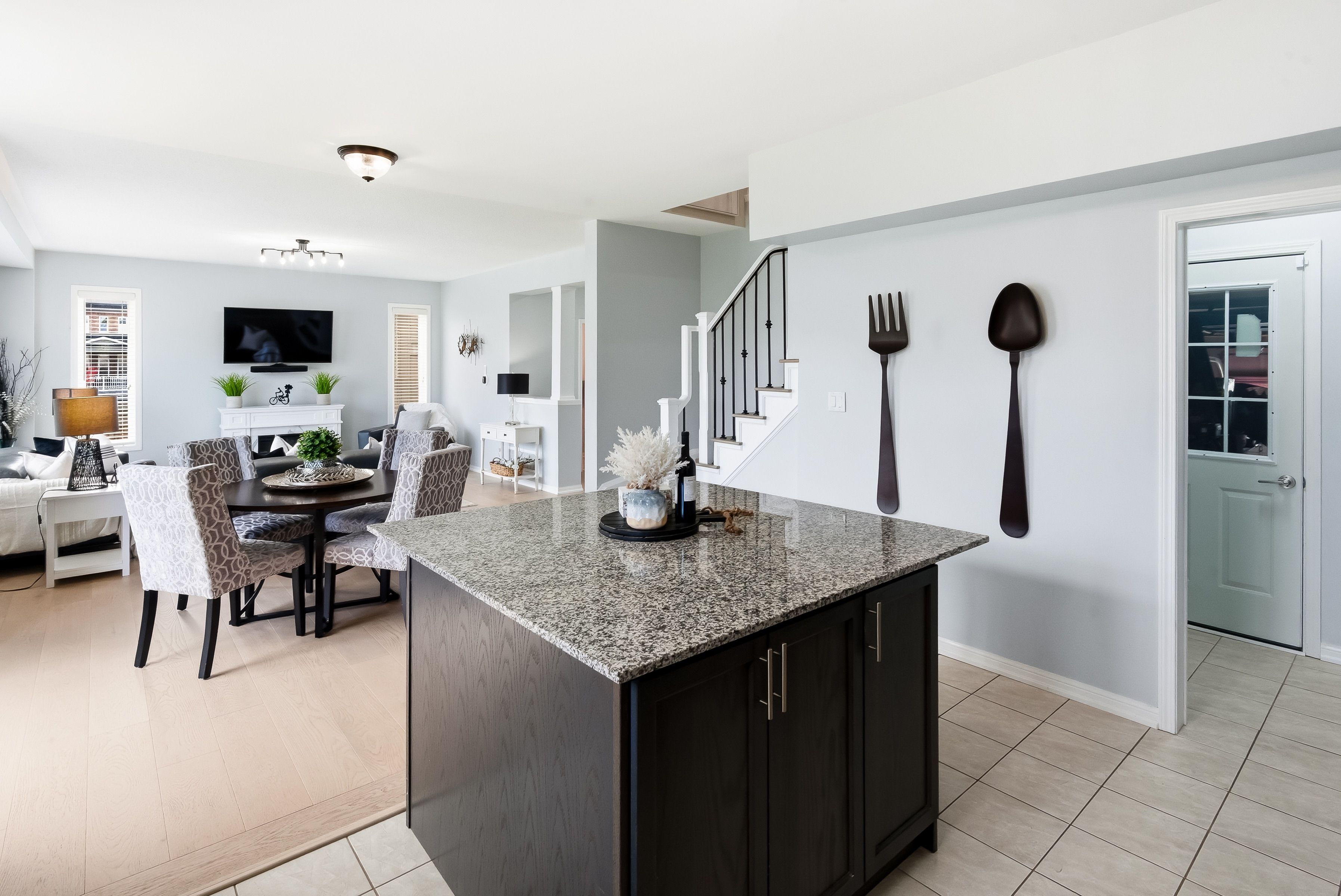 • Gourmet kitchen with granite countertops and stainless steel appliances.