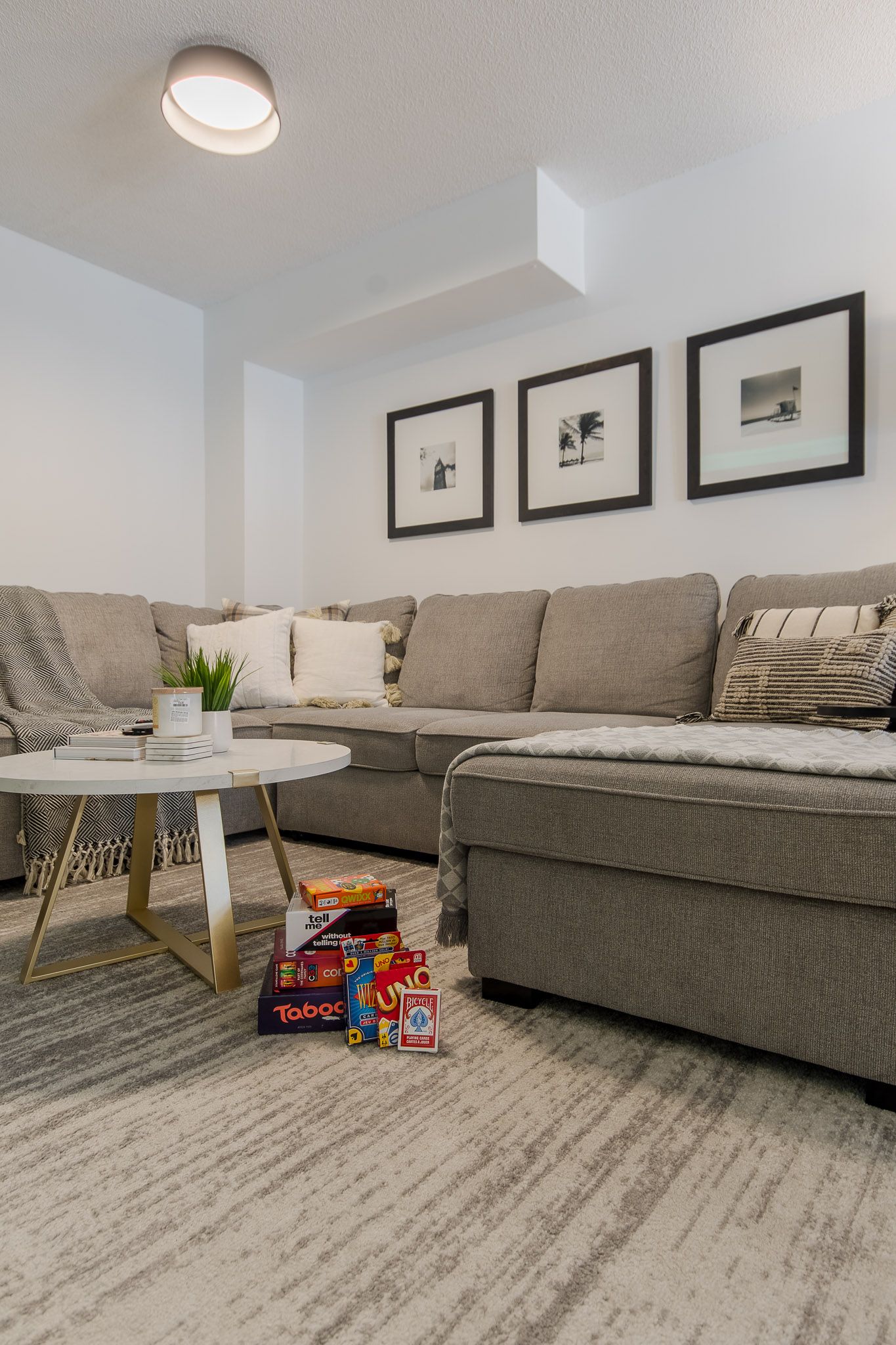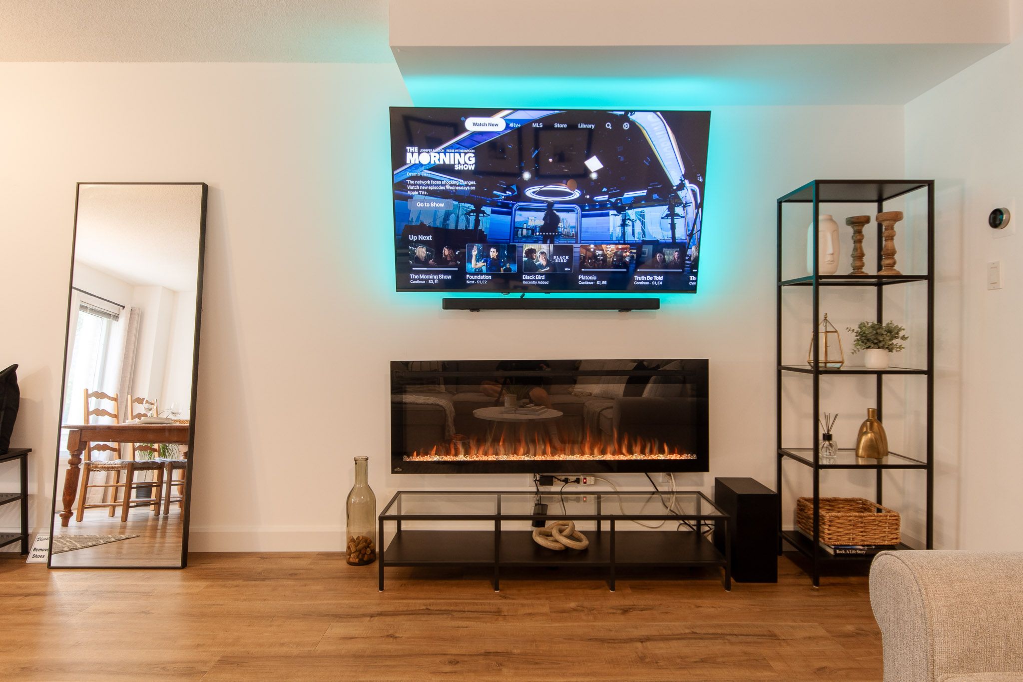 • Open-concept living/dining area featuring a Smart TV and electric fireplace.