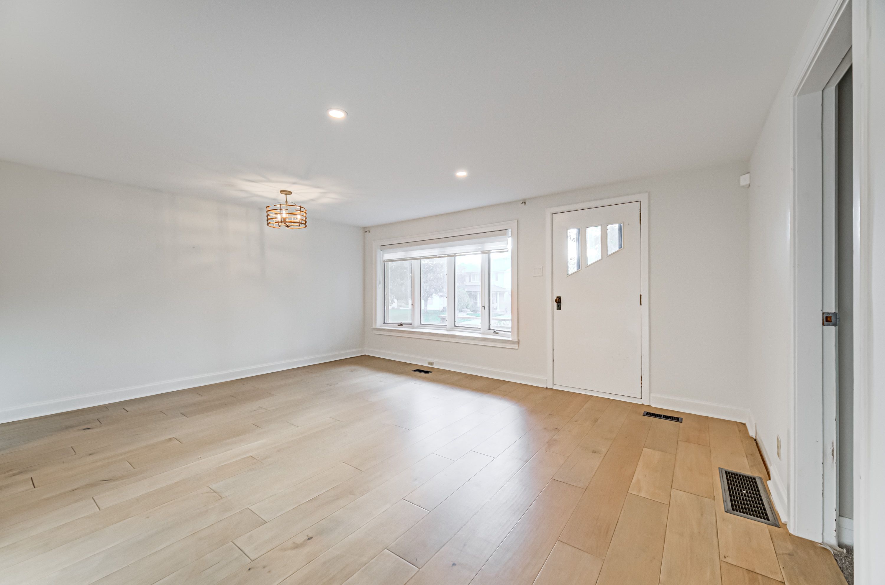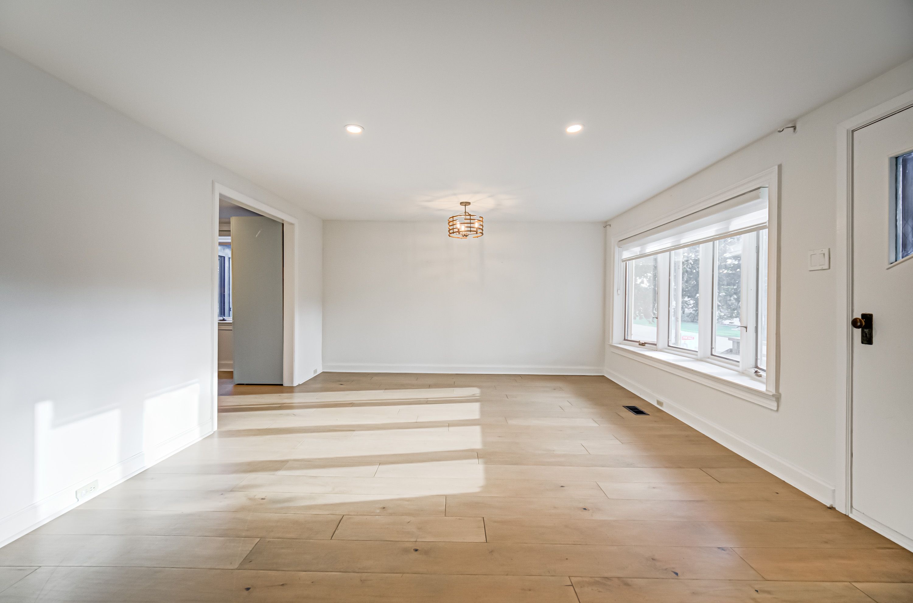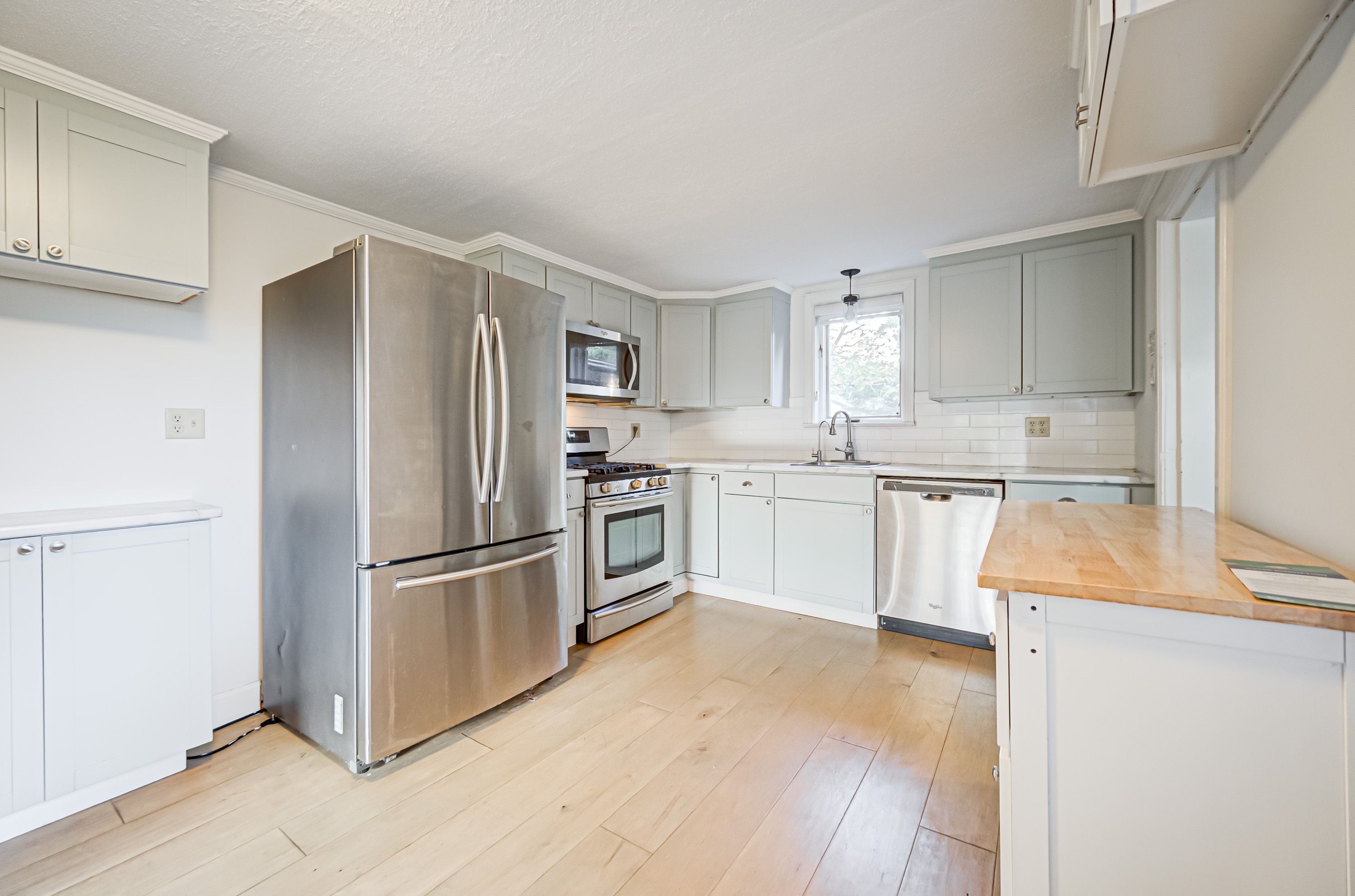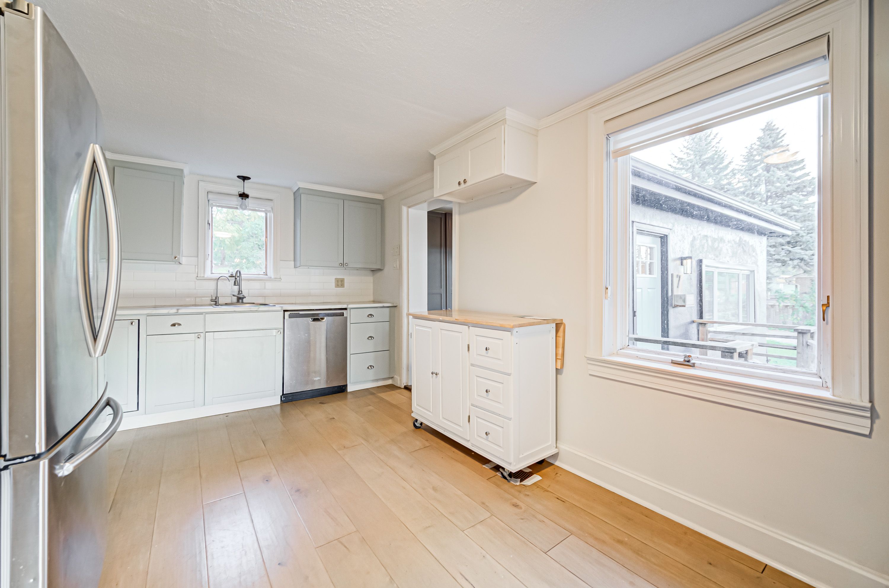 • Bright, updated bungalow with modern interior and maple hardwood floors.
