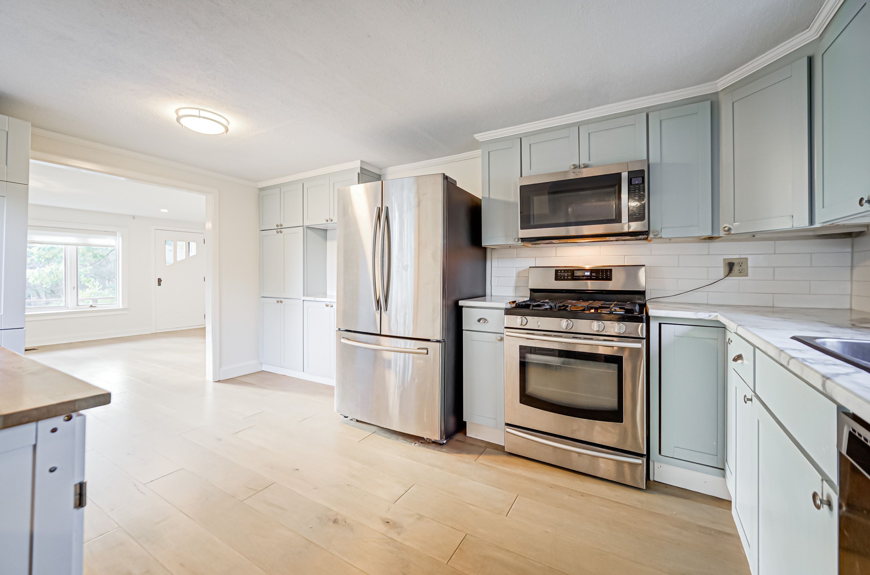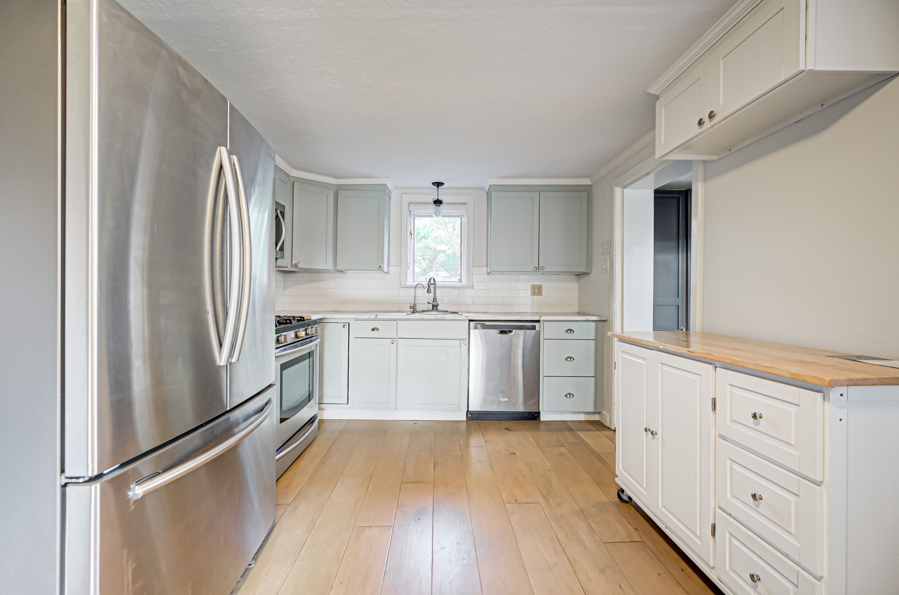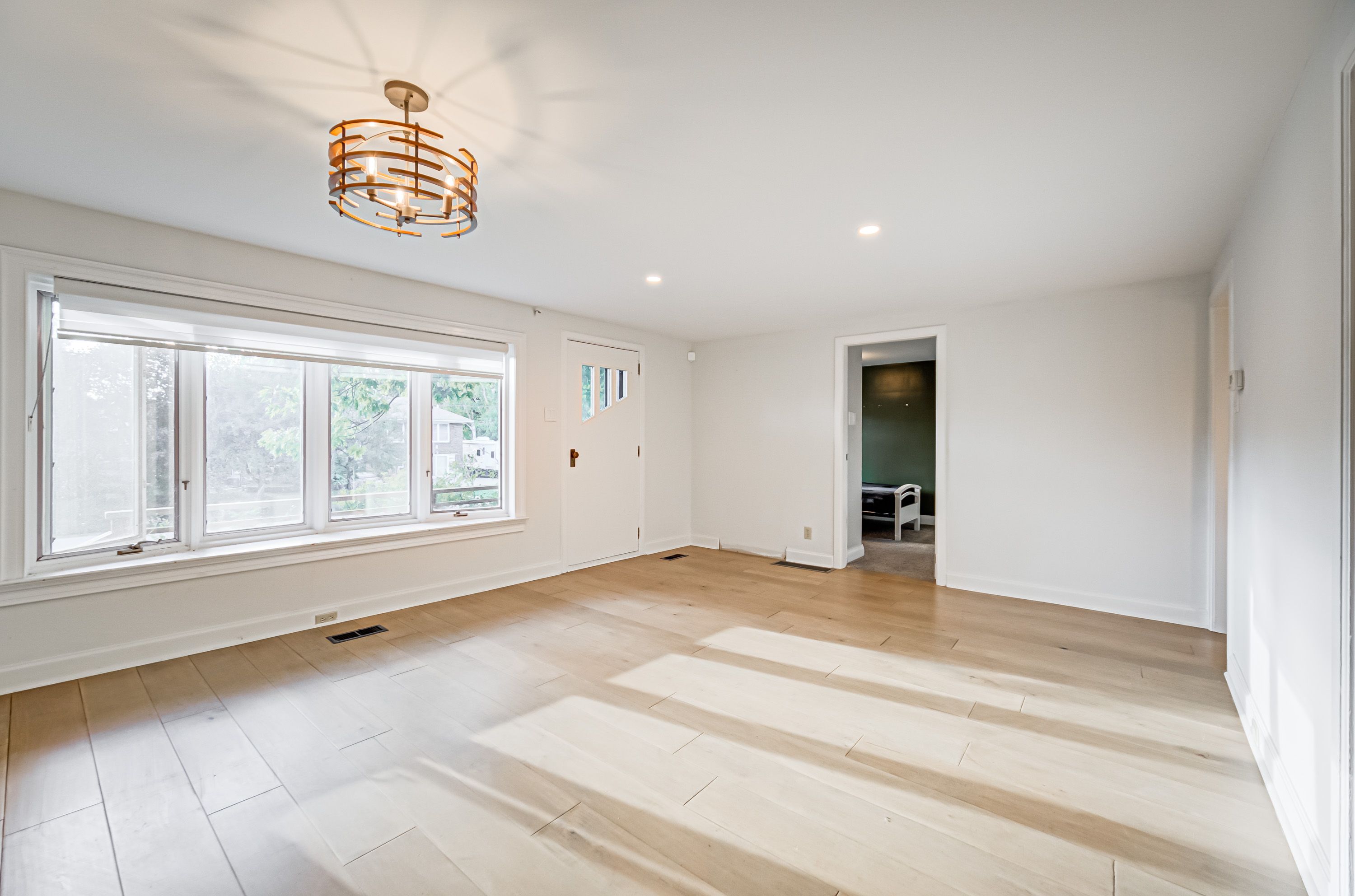 • Bright, updated bungalow with modern interior and maple hardwood floors.
