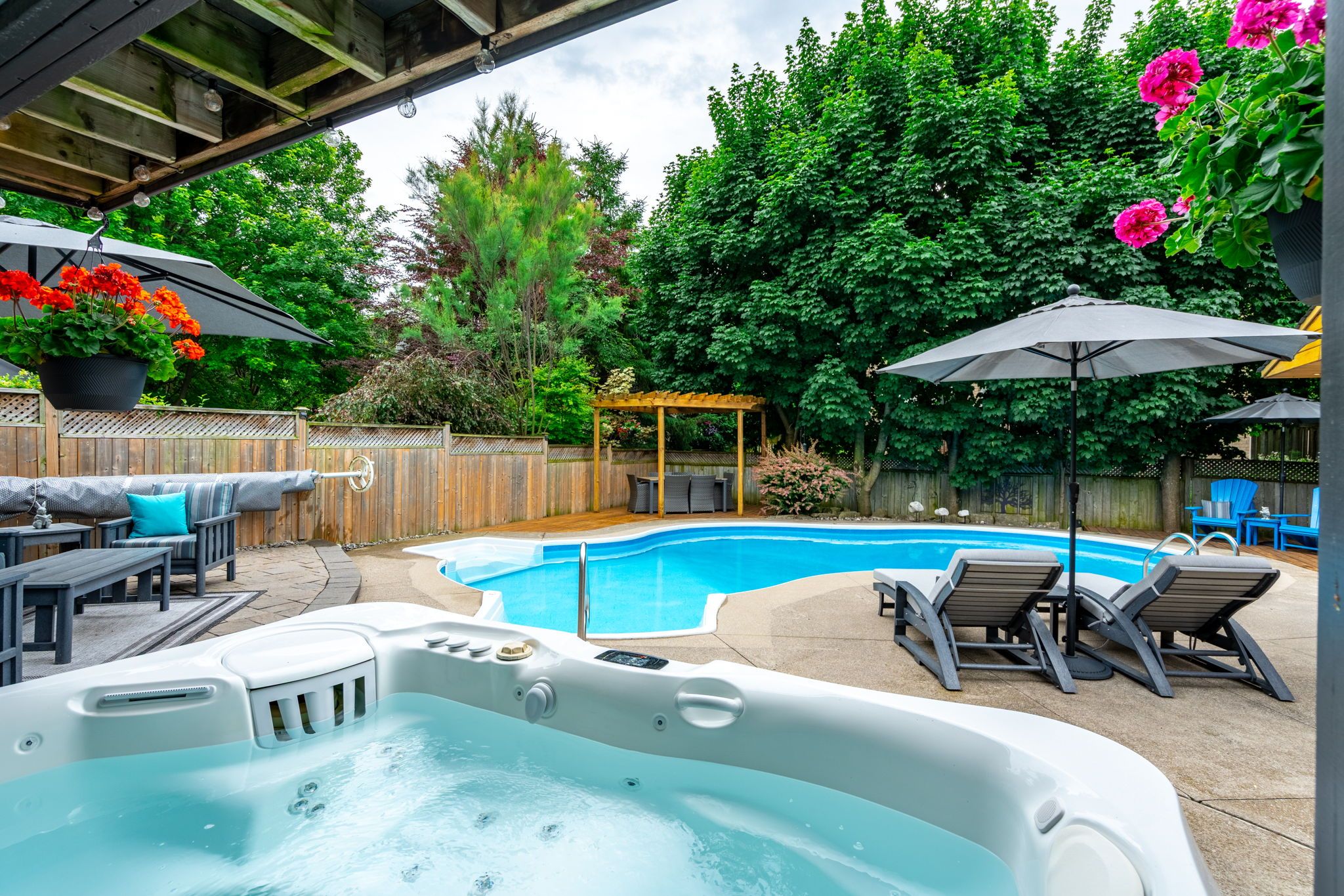 • Private backyard oasis featuring a heated saltwater pool and hot tub.