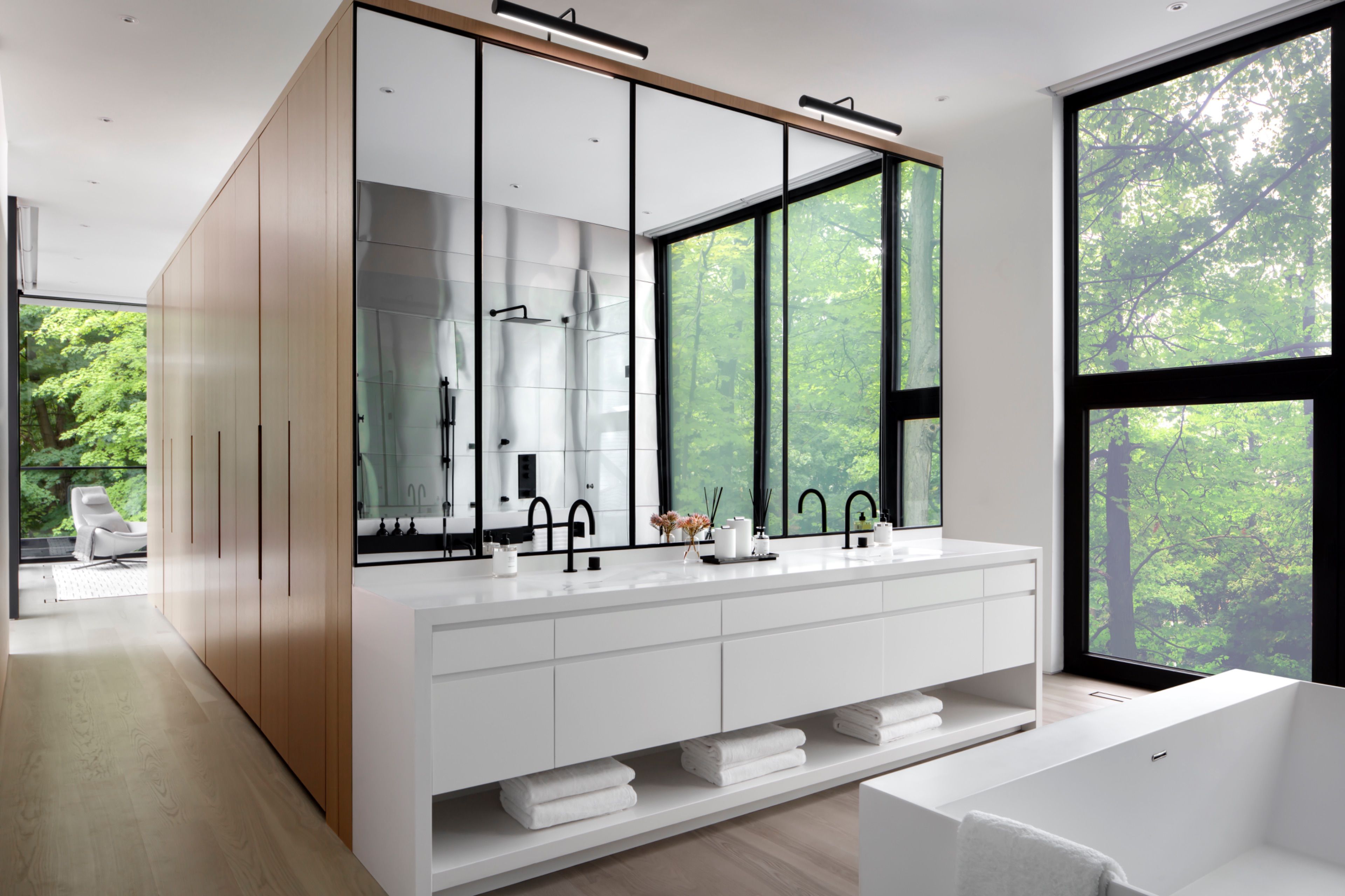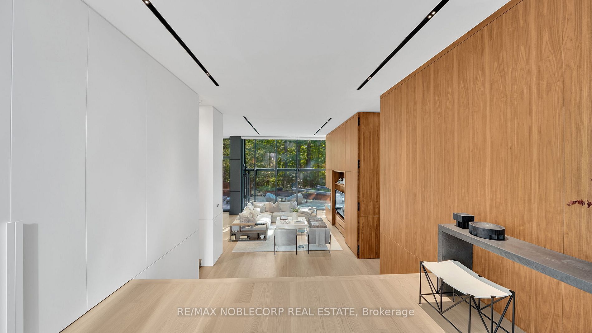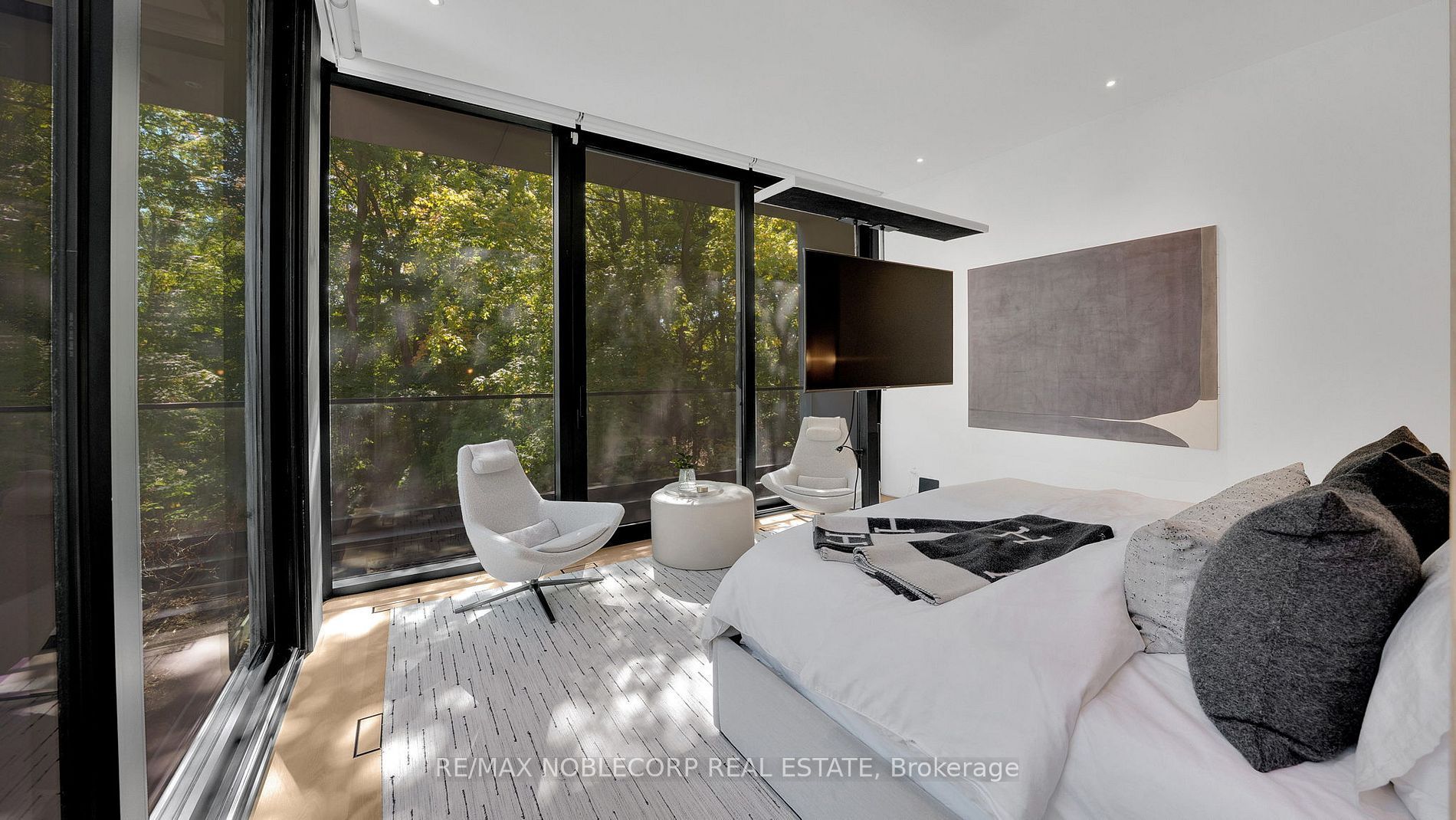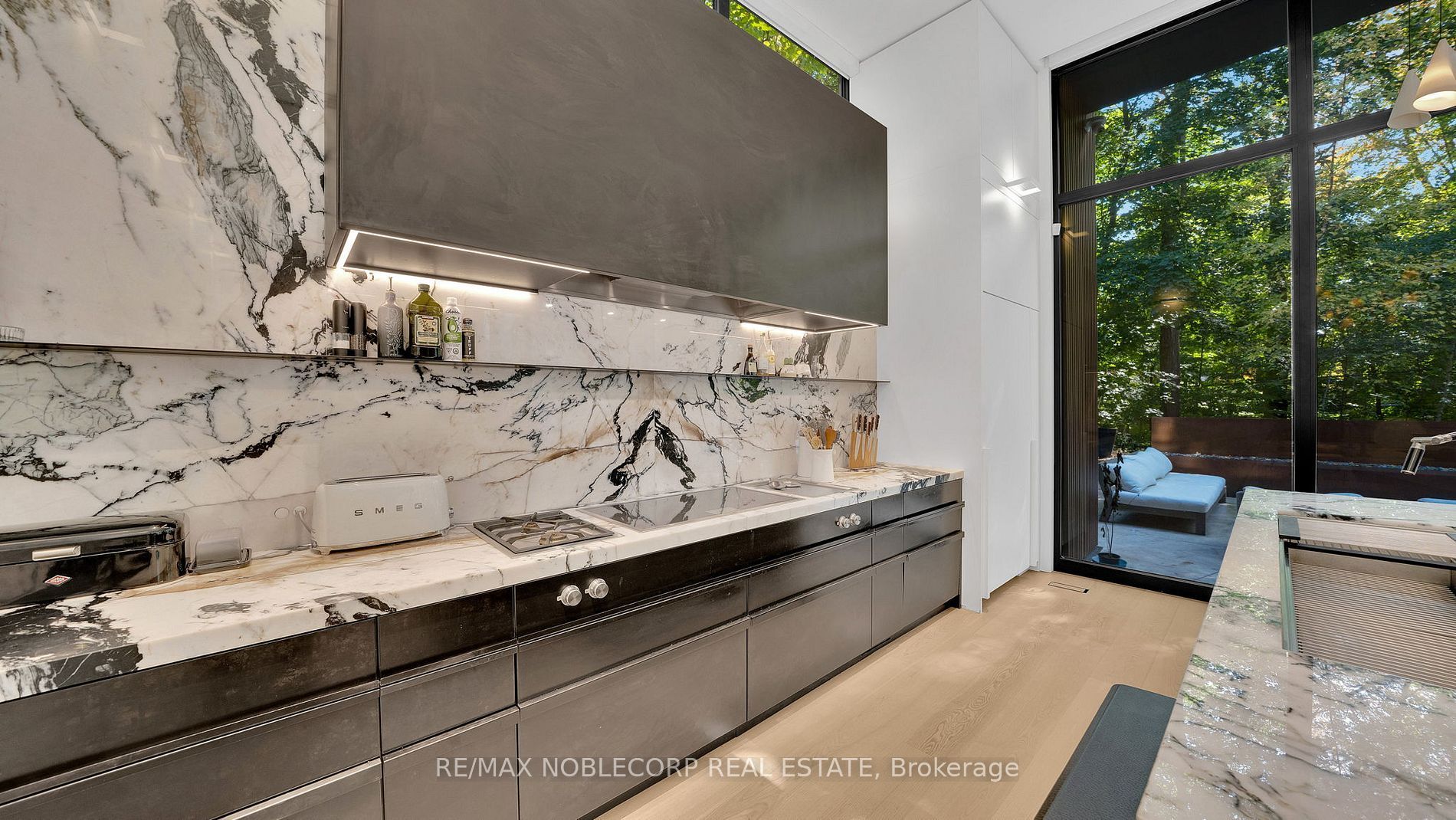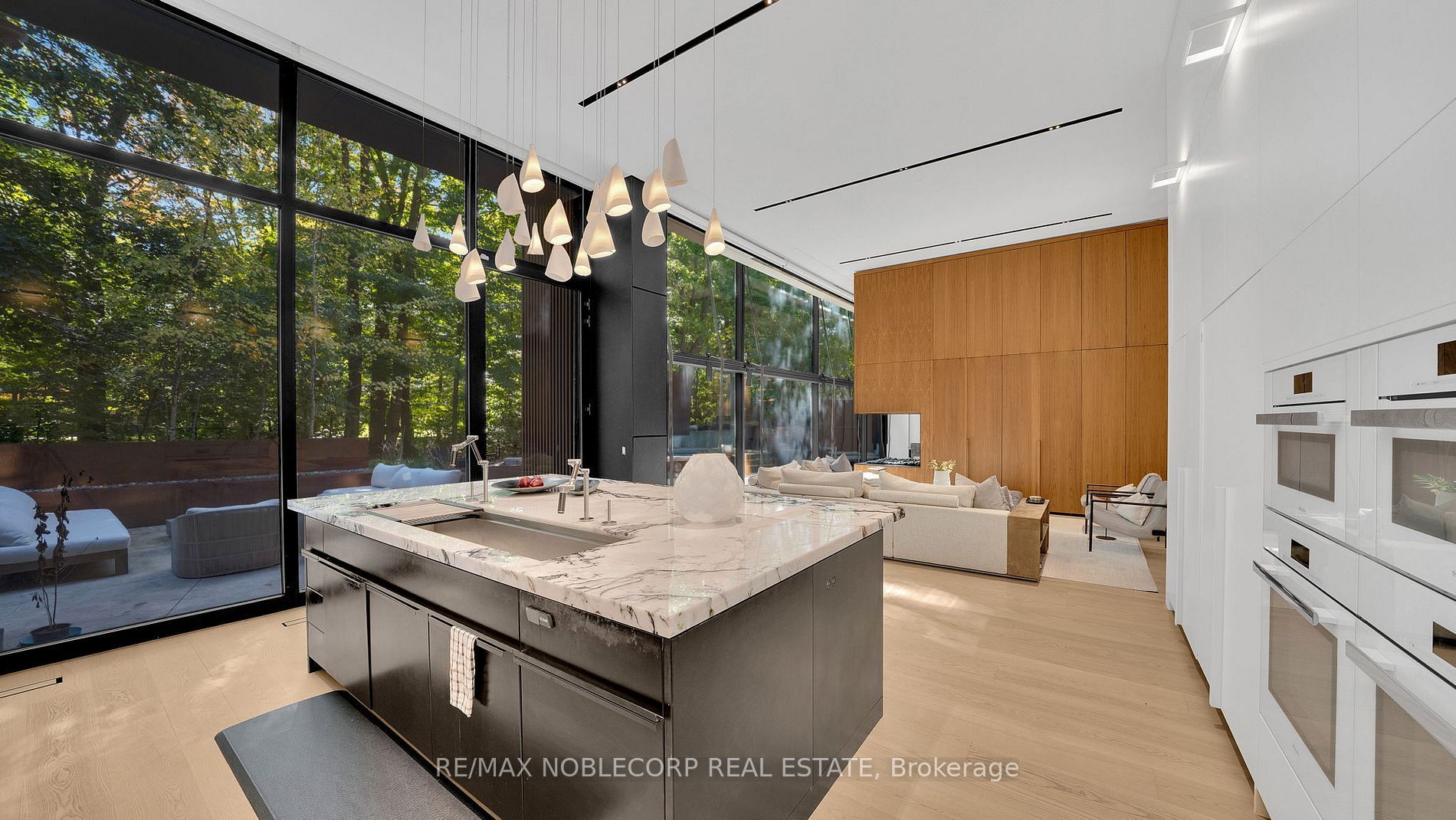 Inspired by the precision and versatility of a swiss army knife, this internationally award-winning, architecturally significant residence offers over 6,000 sq. Ft. Of luxury living on a private, forested ravine cul-de-sac. Designed with dynamic multi-level functionality, its dual wings are connected by a sleek glass bridge and clad in a striking blend of reflective titanium, simulated walnut, and rich black palisade panels. A descending entrance introduces the main living area where a panoramic fireplace anchors open-concept spaces extending to the outdoors through a dramatic, folding glass hangar door. Every detail is engineered for seamless living and entertaining from the indoor/outdoor dining areas, hidden wine closet, and wet bar to the amenity-rich lower level featuring a full kitchen, gym, and theatre. The primary suite is a true retreat with his-and-hers closets, a spa-inspired ensuite, and a private balcony overlooking the ravine. Outside, a tiered infinity pool, integrated outdoor kitchen, and fire table are enveloped by nature, creating a breathtaking, resort-like oasis.
