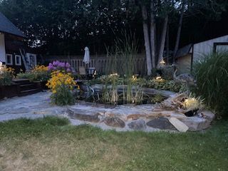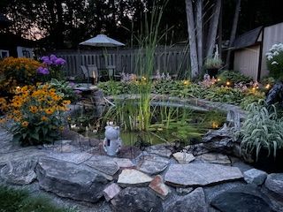 • Deck for outdoor dining, overlooking a serene pond and gardens.