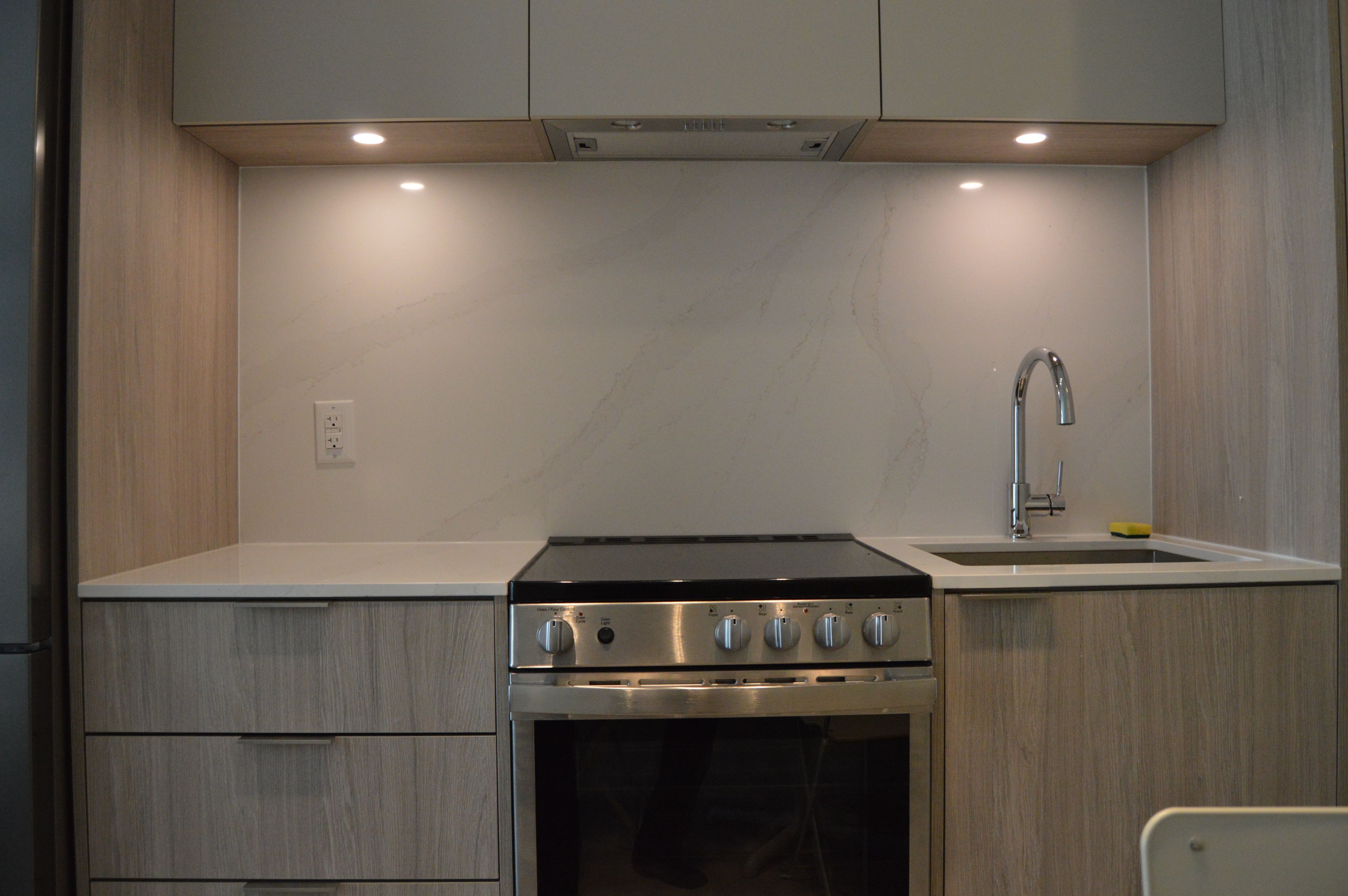 • Modern kitchen features stainless steel appliances and quartz counters.