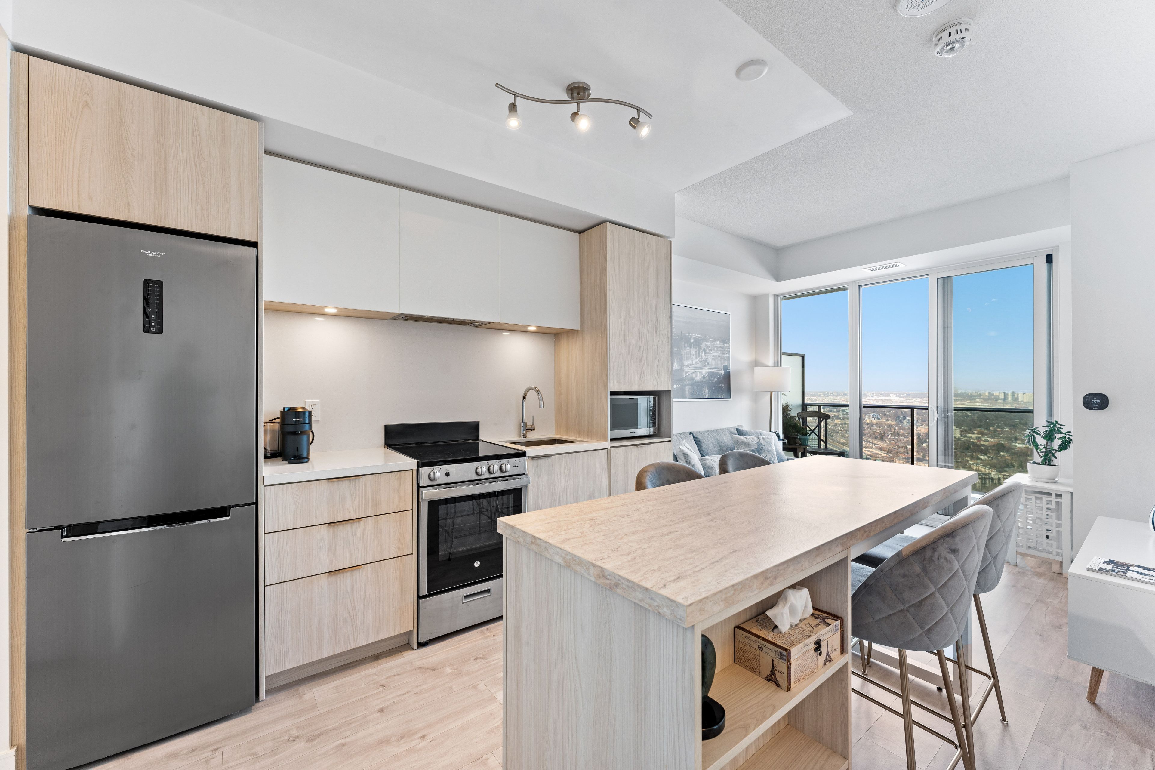 • Oversized balcony with stunning lake and city skyline views for relaxation.