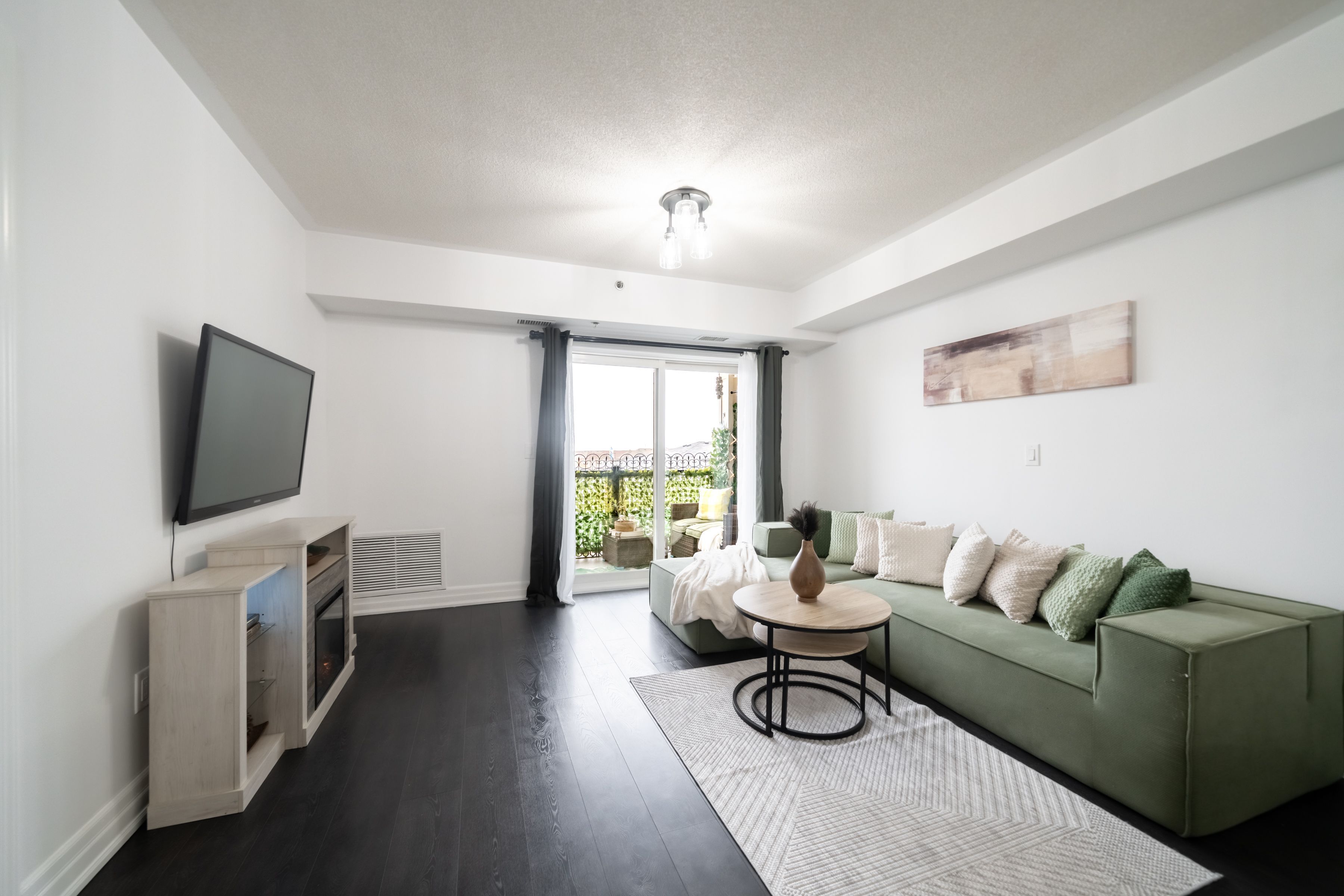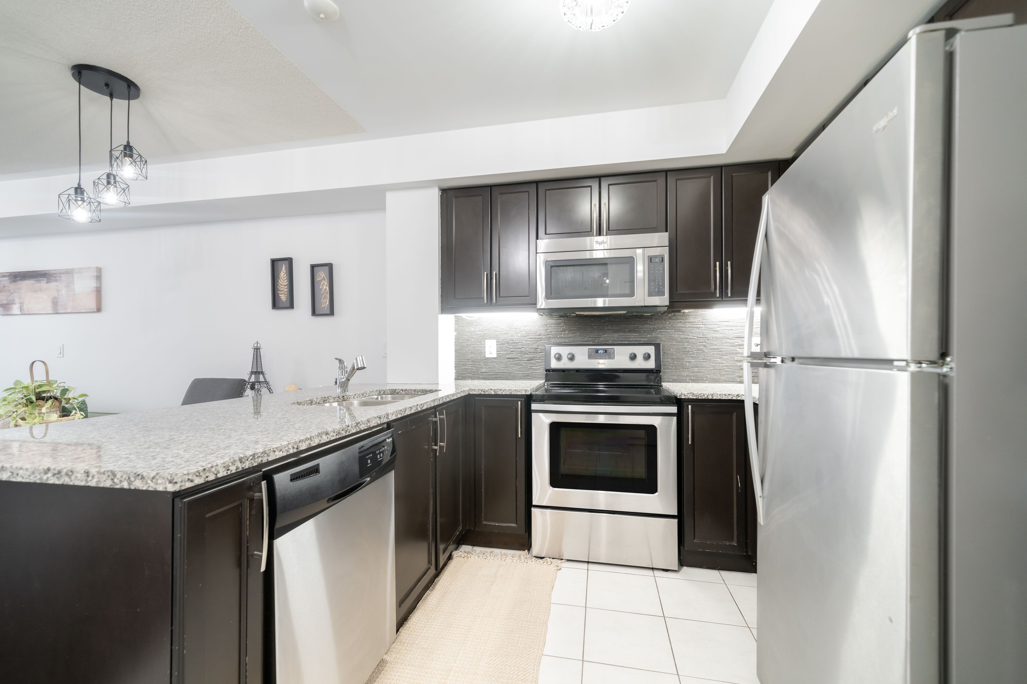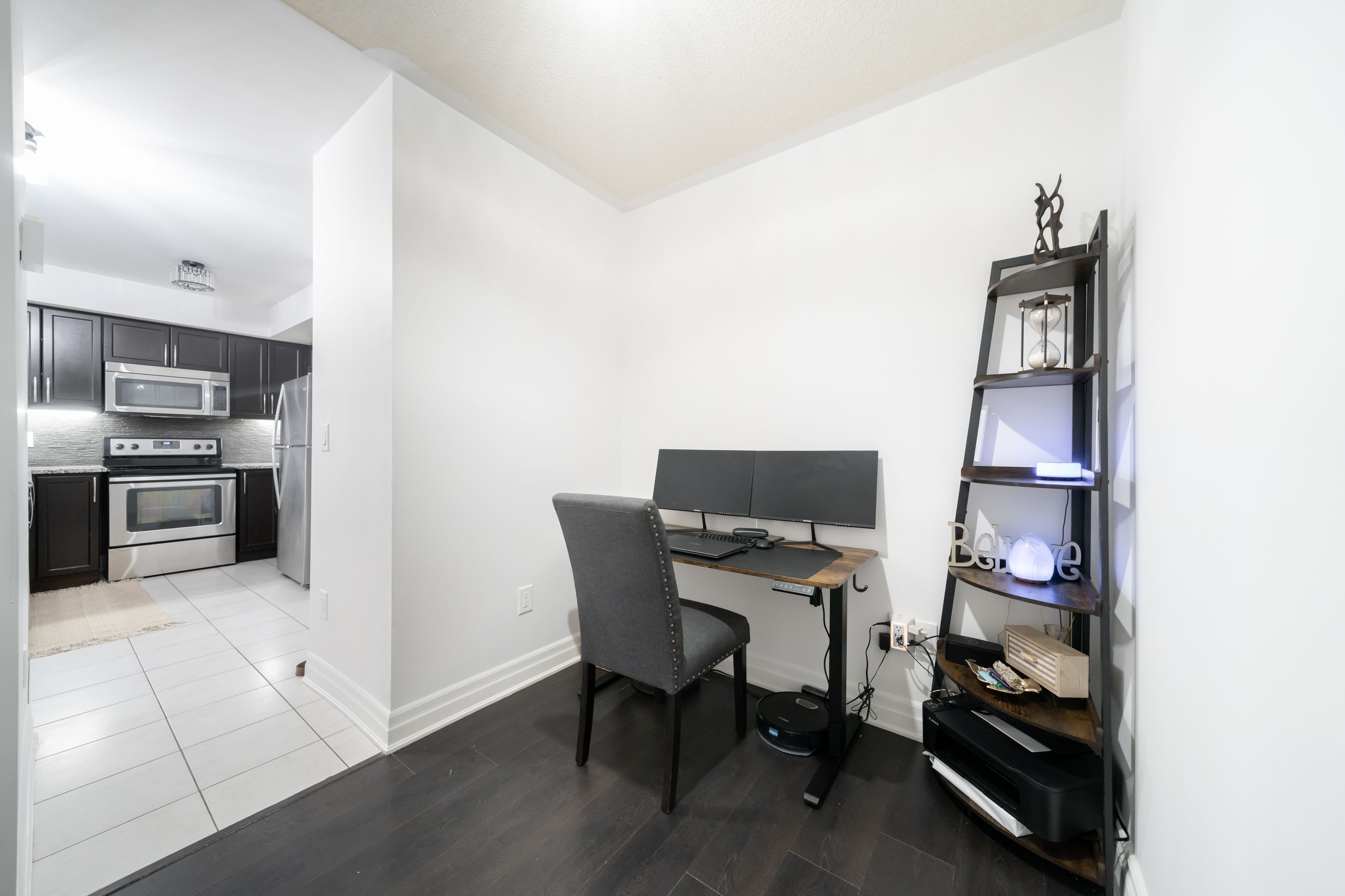 Beautiful and incredibly spacious 1+den located just minutes from mount pleasant go station. Enjoy quiet, convenient living in this bright and inviting home filled with natural light throughout. Step into 767 sf of a freshly painted, comfortable space featuring updated light fixtures and laminate flooring, creating a modern and cohesive feel. The full size kitchen is perfect for the at home cook, complete with granite countertops, full size stainless steel appliances, ample counter space, and plenty of storage. A large breakfast bar provides the ideal setting for casual meals, morning coffee, or entertaining guests. The open concept layout offers generous space for formal dining, accented by a stylish chandelier, and flows seamlessly into a spacious living area designed for both relaxation and hosting. Large windows allow natural light to pour in, enhancing the warm and welcoming atmosphere. Walk out to your private balcony and enjoy serene views and beautiful sunsets, perfect for unwinding at the end of the day. The oversized bedroom is carpet free and thoughtfully designed with two large windows, roller blinds, and a closet featuring custom built-in storage to maximize organization and functionality. The versatile den adds valuable additional living space, ideal for a home office, nursery, guest area, or additional storage, offering flexibility to suit your lifestyle needs. This well maintained unit offers incredible value in a highly convenient location and includes1 parking space and 1 locker for added storage. Within walking distance to mount pleasant go station, schools, libraries, salons, shops, and restaurants. Just minutes to walmart, home depot, grocery stores, parks, and more. A fantastic opportunity and great value for first-time buyers, investors, or down-sizers looking for comfort, style, and convenience.