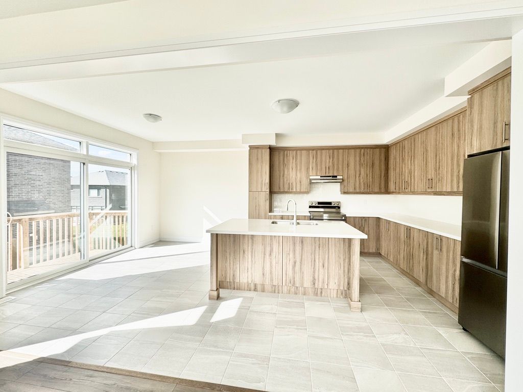 • Modern kitchen with stone countertops and walkout to a raised deck.