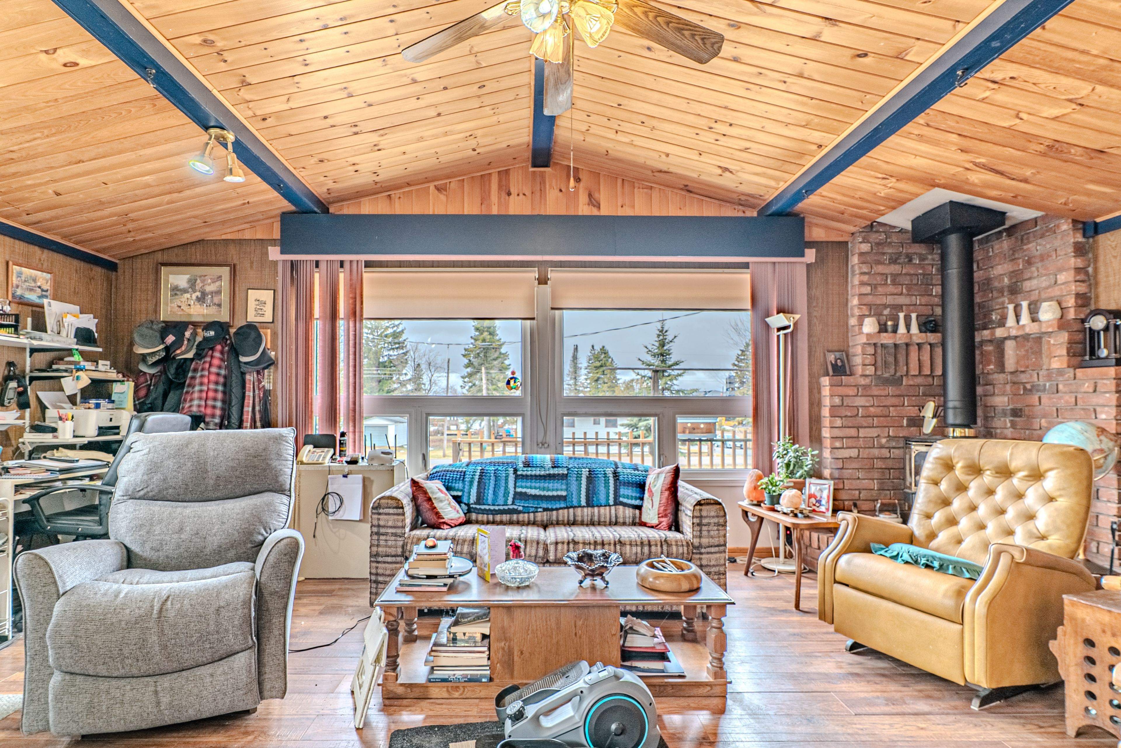 • Bright living room featuring a propane stove and deck access.
