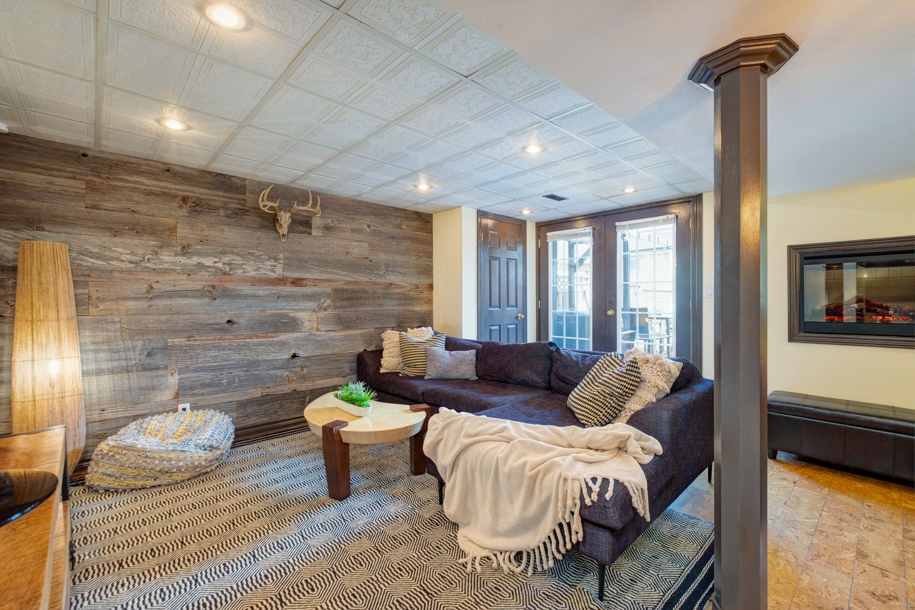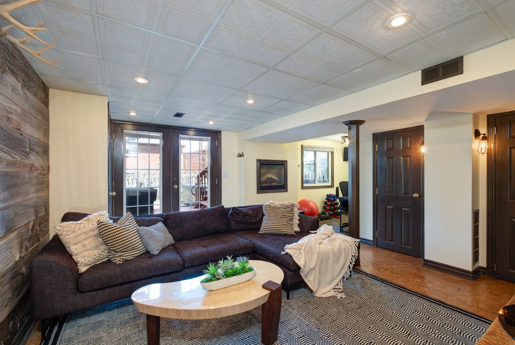 • Flexibility in finished basement with gym setup and roughed-in kitchen.