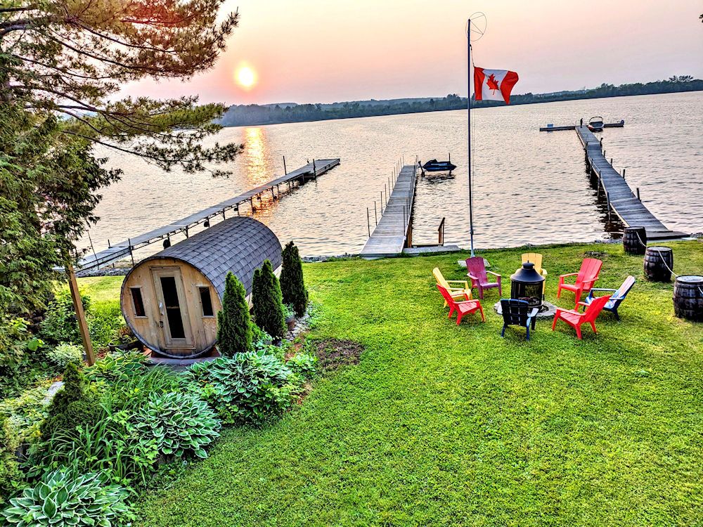 Stunning timber frame waterfront - georgian bay. Experience breathtaking sunset views from this unique 4-bedroom, 3-bathroom year-round waterfront house. This architectural gem features soaring ceilings, expansive windows with lake views, and a seamless open-concept design. Main floor highlights: large open-concept kitchen and a living area featuring a cozy wood-burning stove; a separate, cozy family room provides the perfect additional spot for relaxation. Additional bedroom (perfect for guests or an office),a convenient powder room. A second-floor sitting area overlooks the main living room including a private balcony and a private master sanctuary featuring a unique, open-concept en-suite. This space is designed with an elevated entrance and a partial feature wall, blending style with architectural interest outdoor living: large deck with glass railings, waterfront backyard, and a private barrel sauna steps from the lake. Income potential: lower level features a self-contained 1-bedroom suite with a separate entrance and a living room currently featuring a pool table. The fourth bedroom is also located on the lower level but is situated on the opposite side of the floor, ensuring it remains separate from the suite for maximum privacy. The laundry room is also conveniently located on this lower level. Recent upgrades:new roof and gutters installed in 2021. Electrical system has been upgraded to 200 amp for modern efficiency. Barrel outdoor sauna for relaxation, just steps away from the lake. Convenience: fully connected to municipal utilities for hassle-free living. Versatility: ideal as a permanent home or a serene getaway. Rare opportunity for a permanent residence or serene getaway. Book your private viewing today!