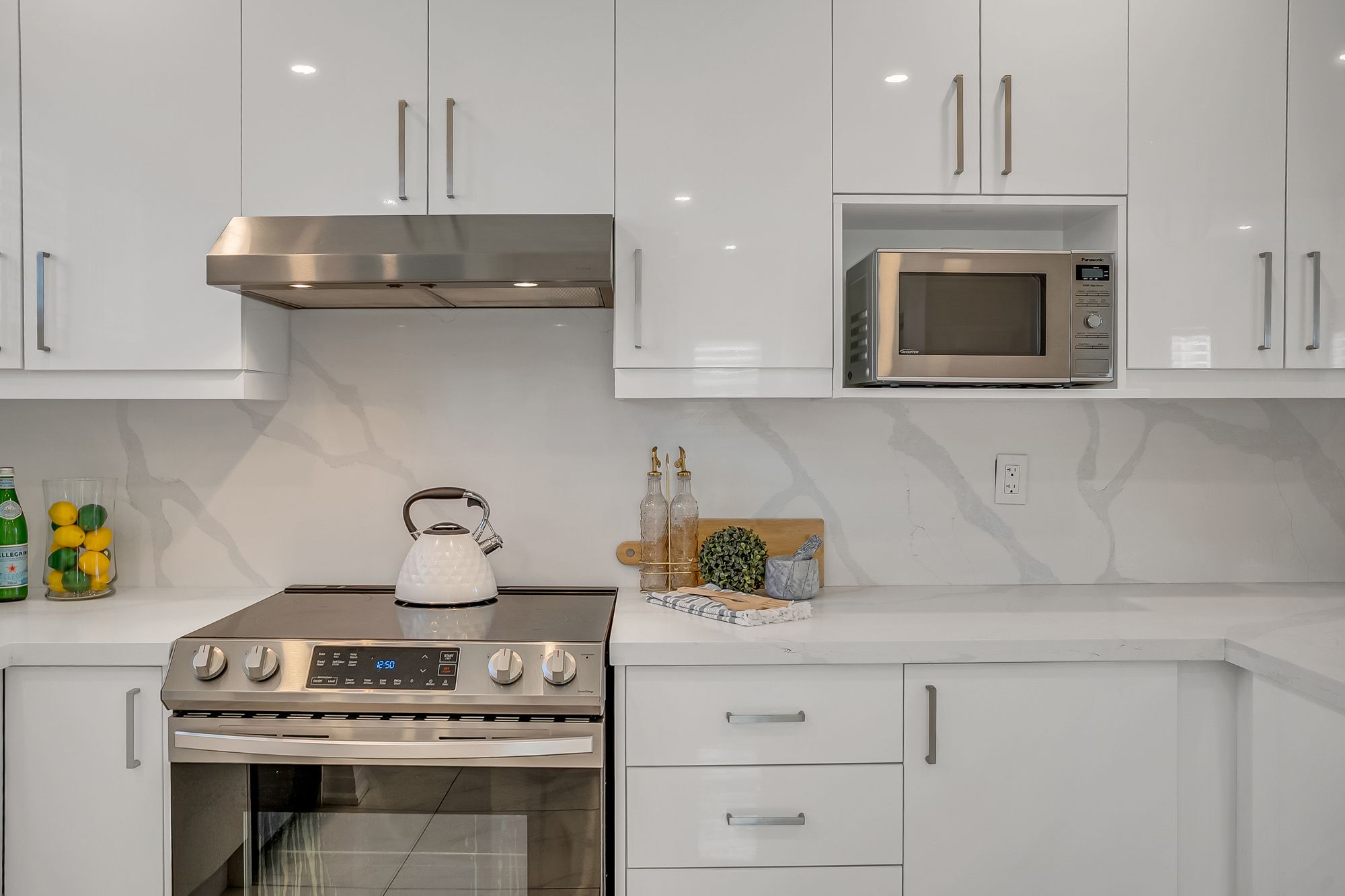 • Stylish kitchen with quartz countertops and stainless steel appliances.