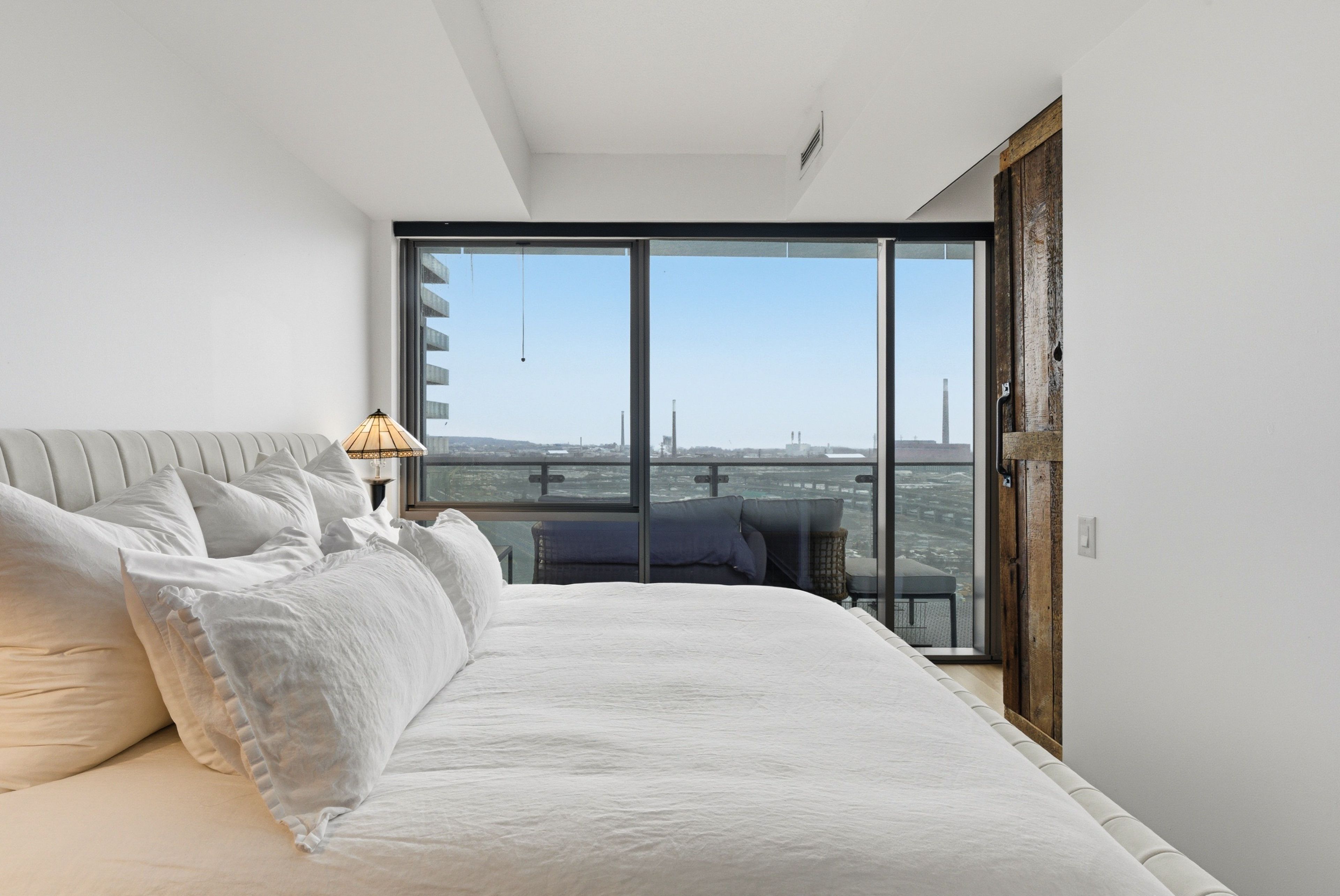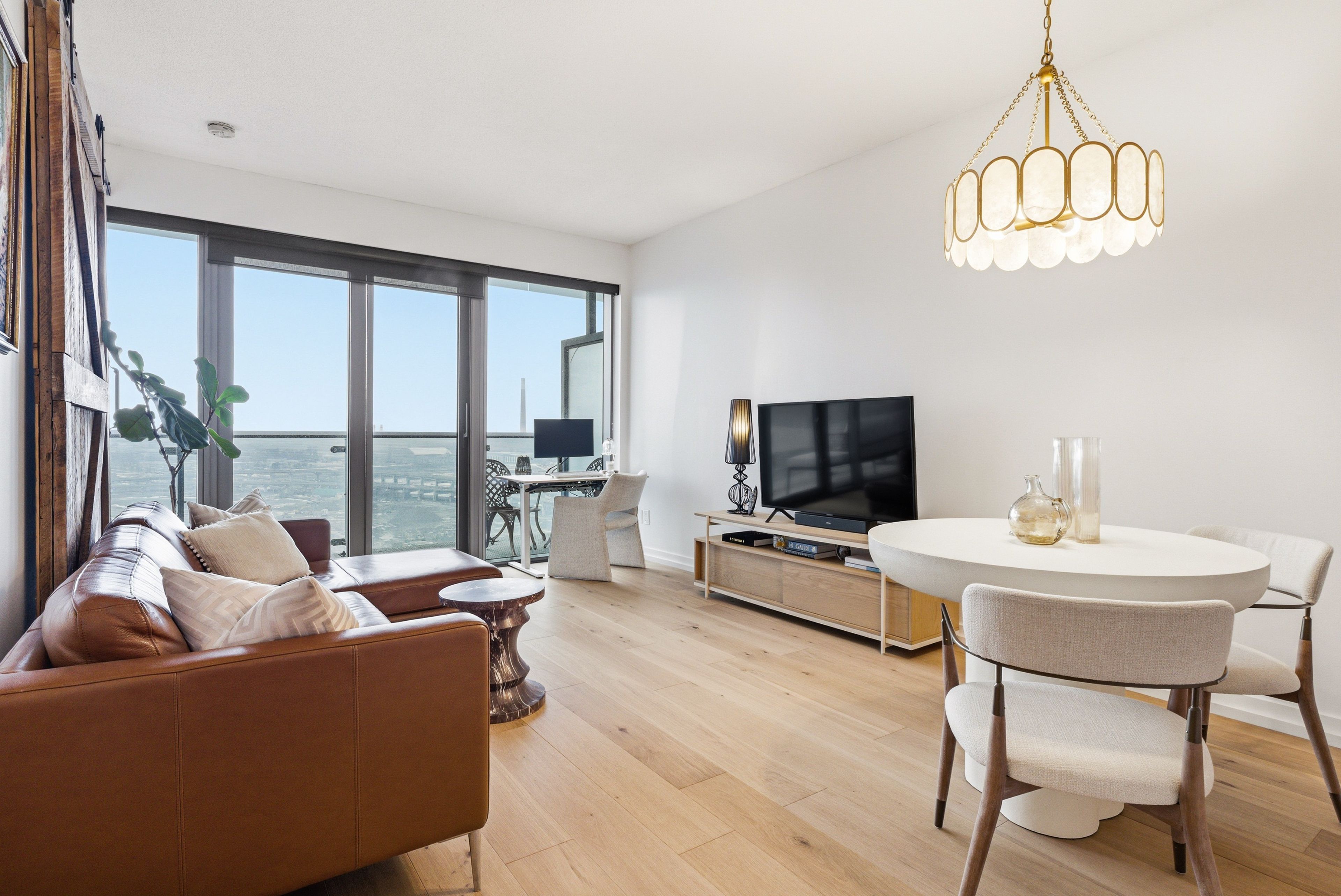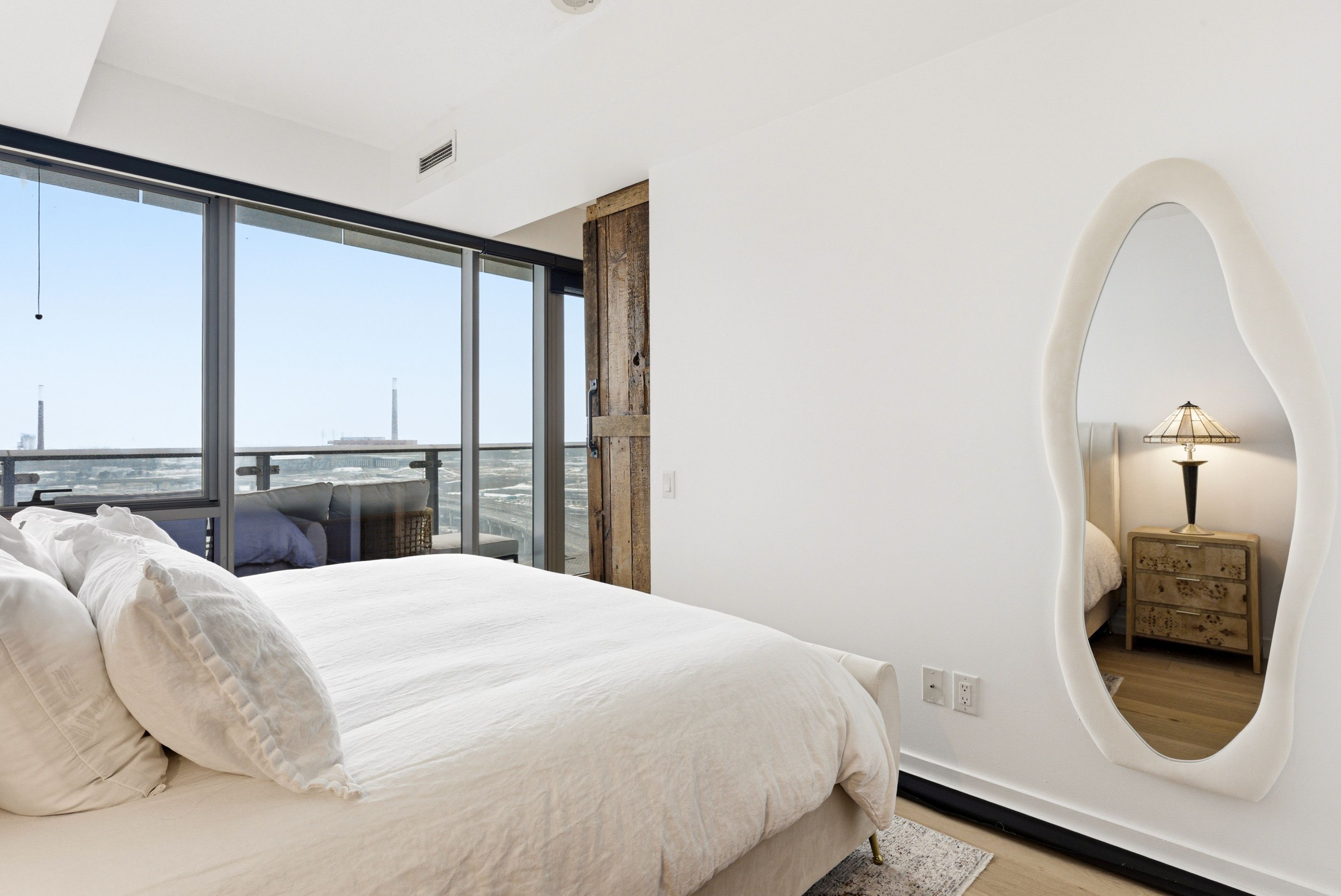 • Bright living space with floor-to-ceiling windows and lake views.