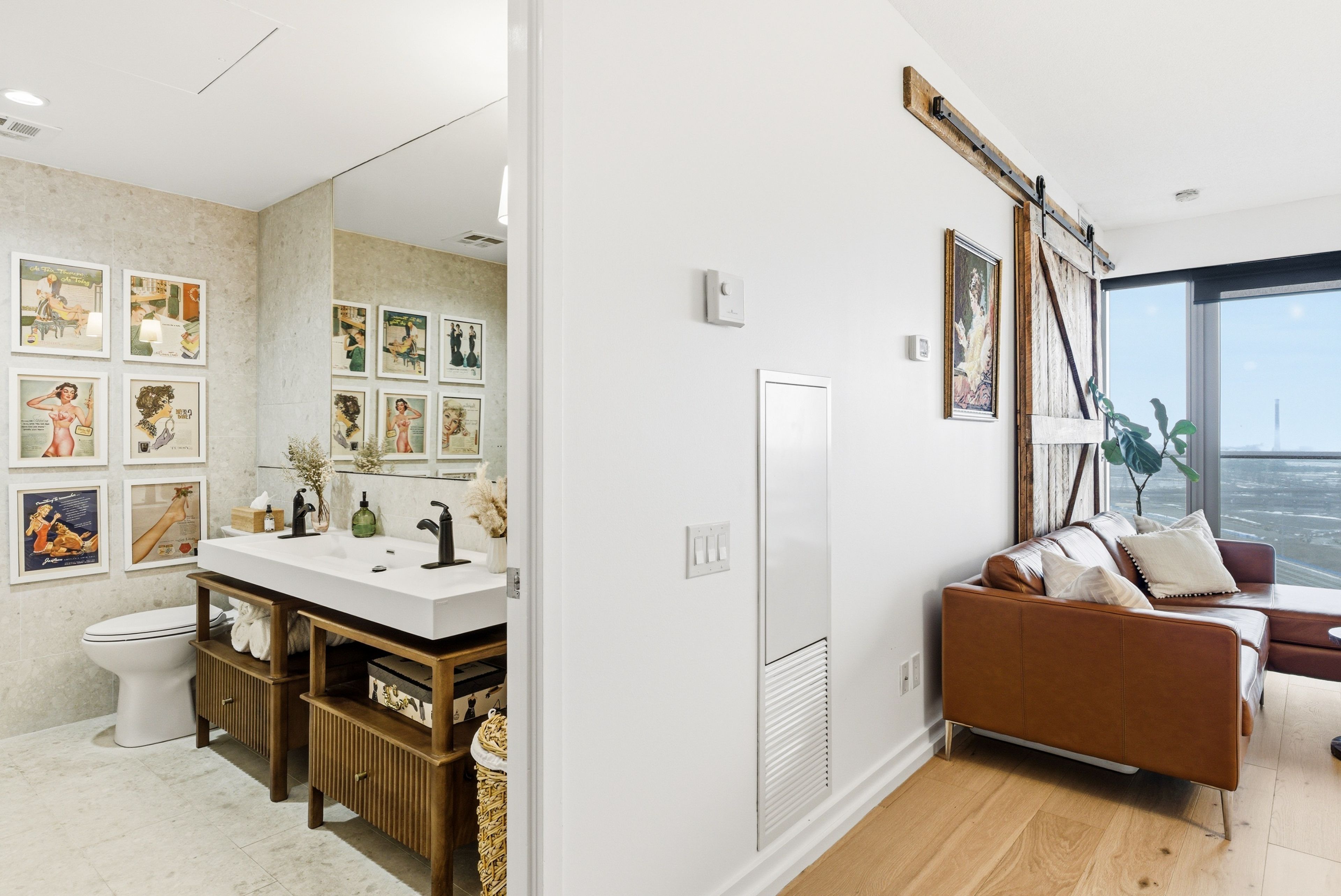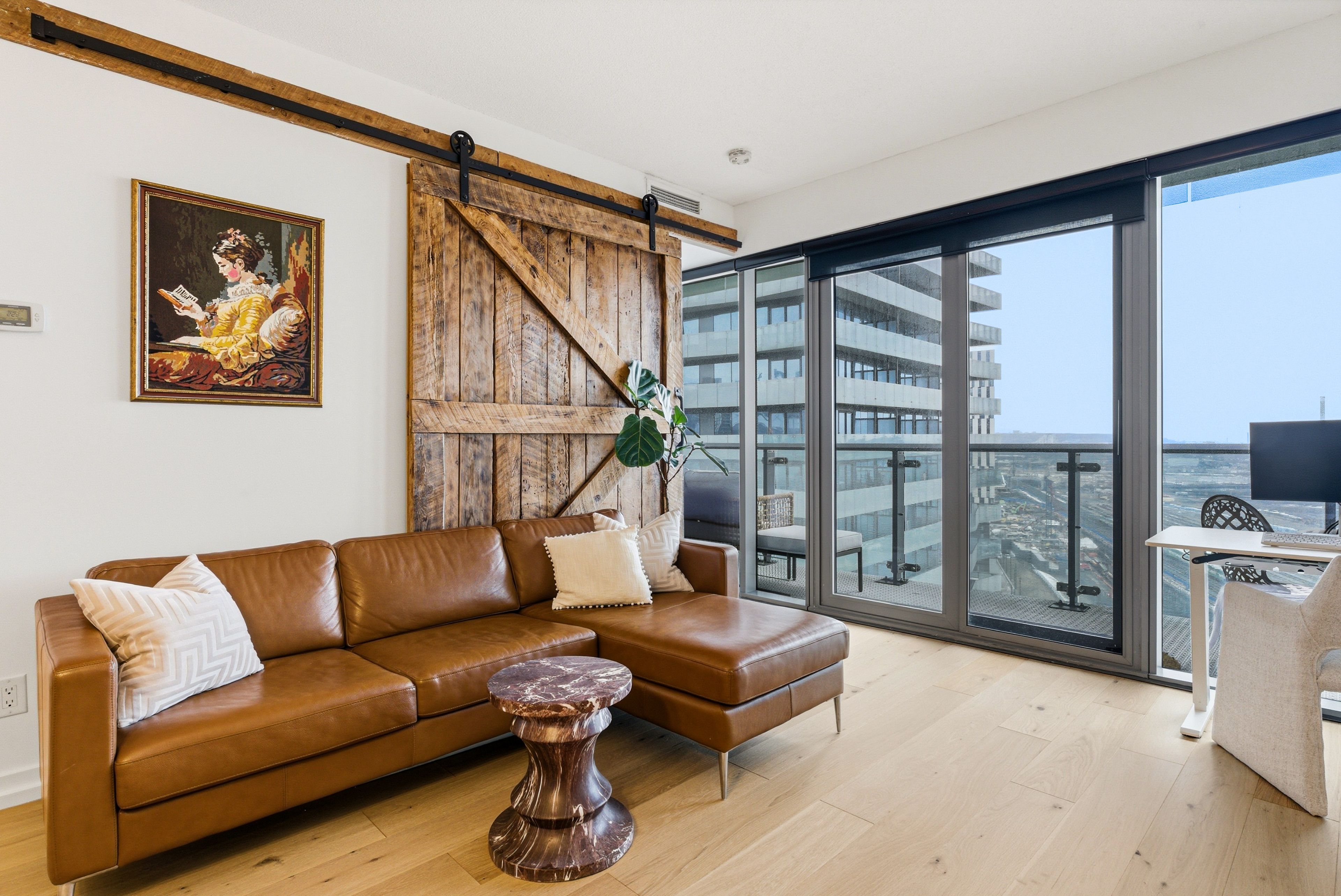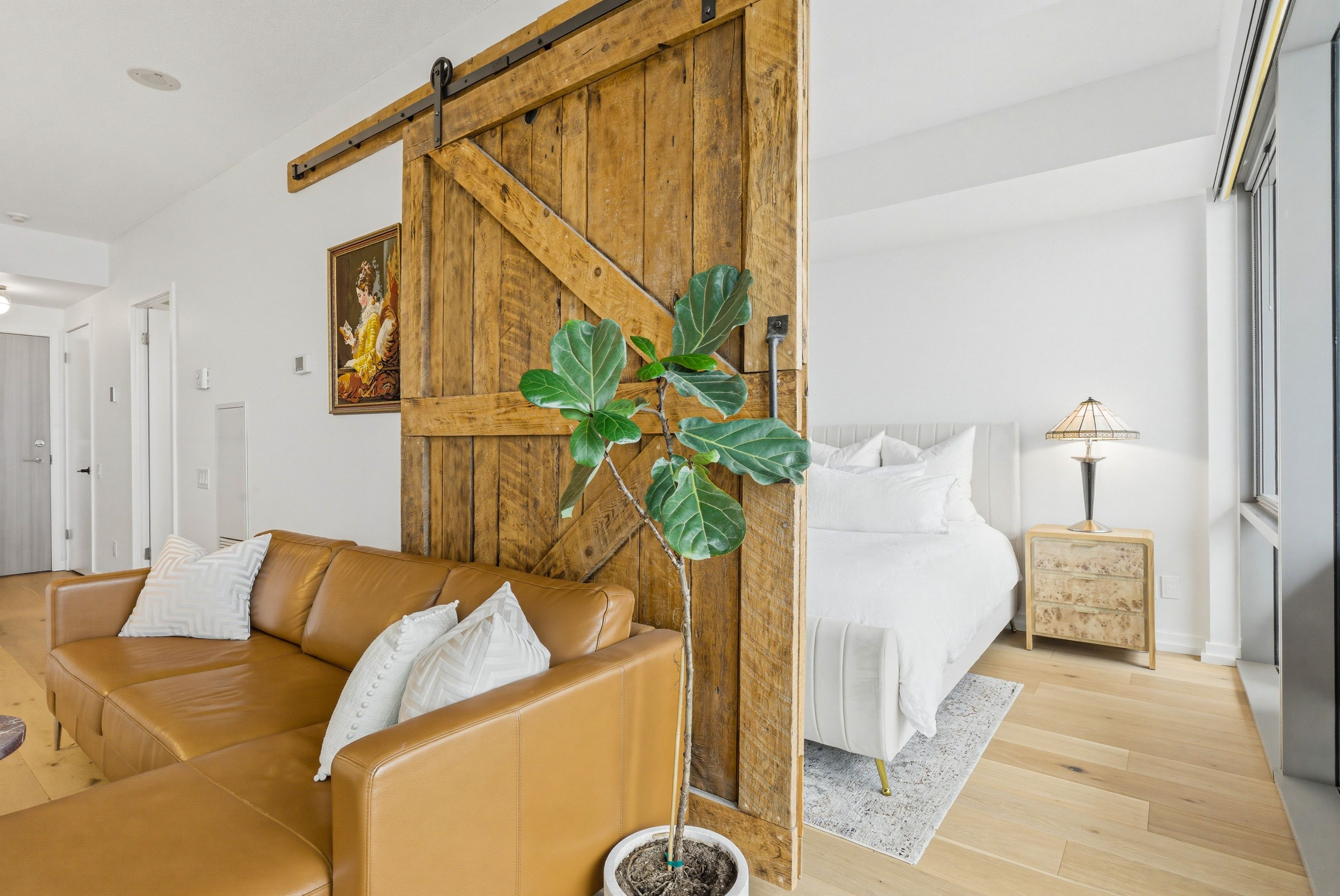 Fully renovated one-bedroom in the heart of the distillery district-thoughtfully upgraded and immaculately maintained. Nearly 600 sq ft of bright, south east-facing living space finished with coastal retreat oak wide-plank engineered hardwood floors. Floor-to-ceiling windows flood the space with natural light and frame open views toward the lake, with a walkout to your private balcony. The kitchen features granite counters, stainless steel appliances, and a centre island. The bathroom has been finished with corian double sinks, high-end faucets, a deep soaker tub, and a rain shower. A reclaimed wood barn door with black iron hardware connects the bedroom to the living area, offering flexibility without sacrificing the open feel. Steps to ttc, the dvp, and the gardiner. A short walk to st. Lawrence market and the financial district. 24/7 concierge and full building amenities included. One parking spot included.