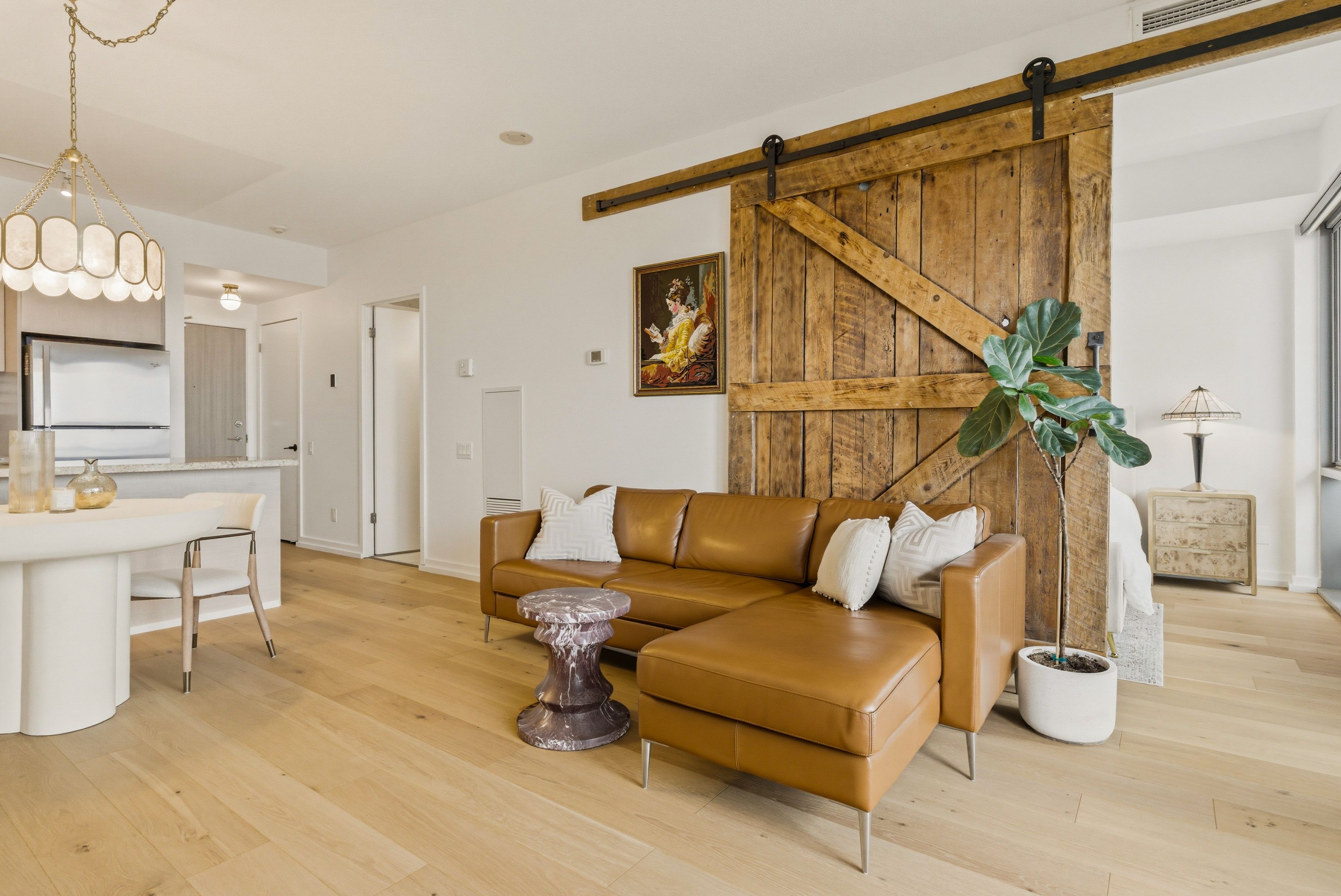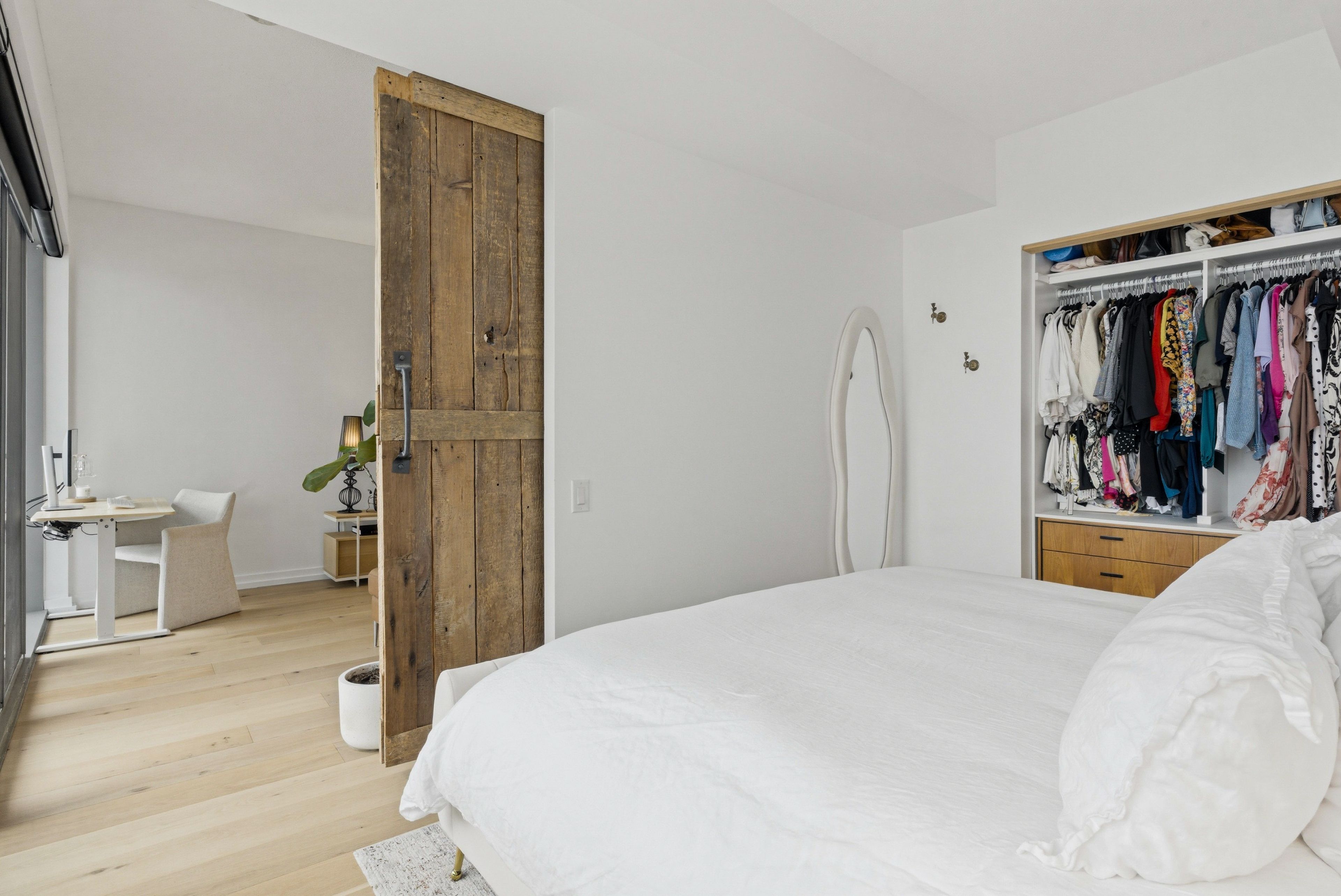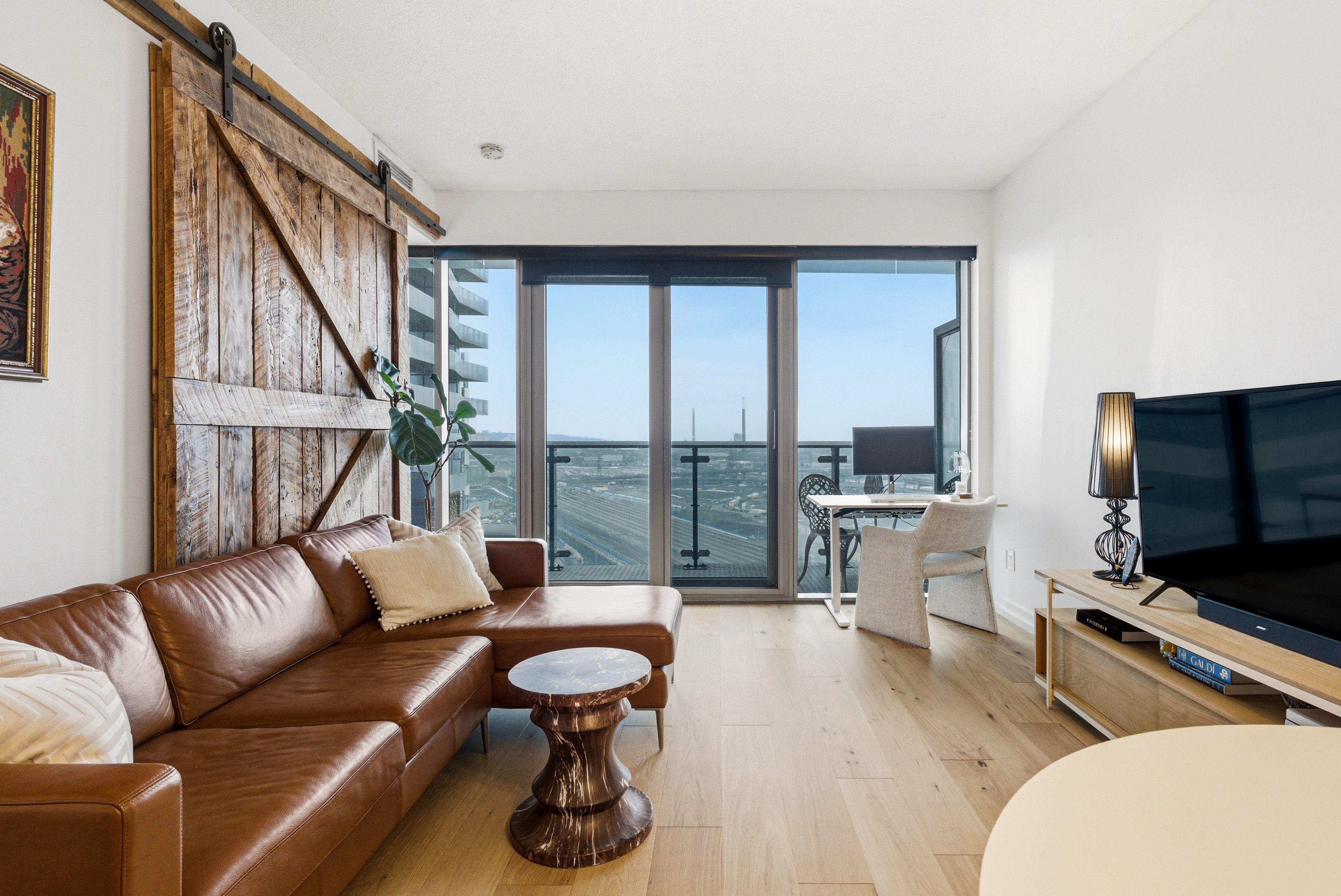 Fully renovated one-bedroom in the heart of the distillery district-thoughtfully upgraded and immaculately maintained. Nearly 600 sq ft of bright, south east-facing living space finished with coastal retreat oak wide-plank engineered hardwood floors. Floor-to-ceiling windows flood the space with natural light and frame open views toward the lake, with a walkout to your private balcony. The kitchen features granite counters, stainless steel appliances, and a centre island. The bathroom has been finished with corian double sinks, high-end faucets, a deep soaker tub, and a rain shower. A reclaimed wood barn door with black iron hardware connects the bedroom to the living area, offering flexibility without sacrificing the open feel. Steps to ttc, the dvp, and the gardiner. A short walk to st. Lawrence market and the financial district. 24/7 concierge and full building amenities included. One parking spot included.