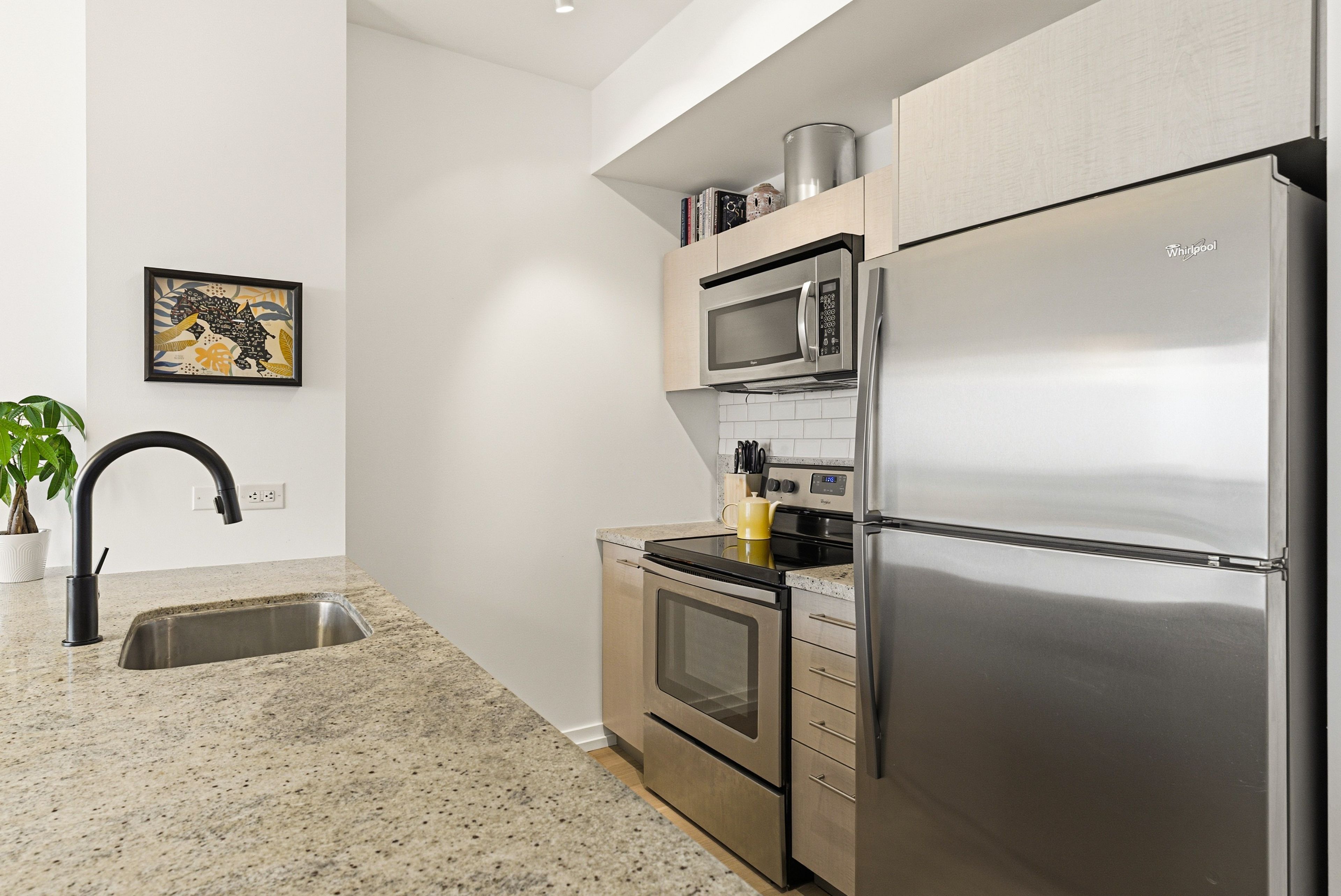 • Kitchen features granite counters, stainless steel appliances, and an island.