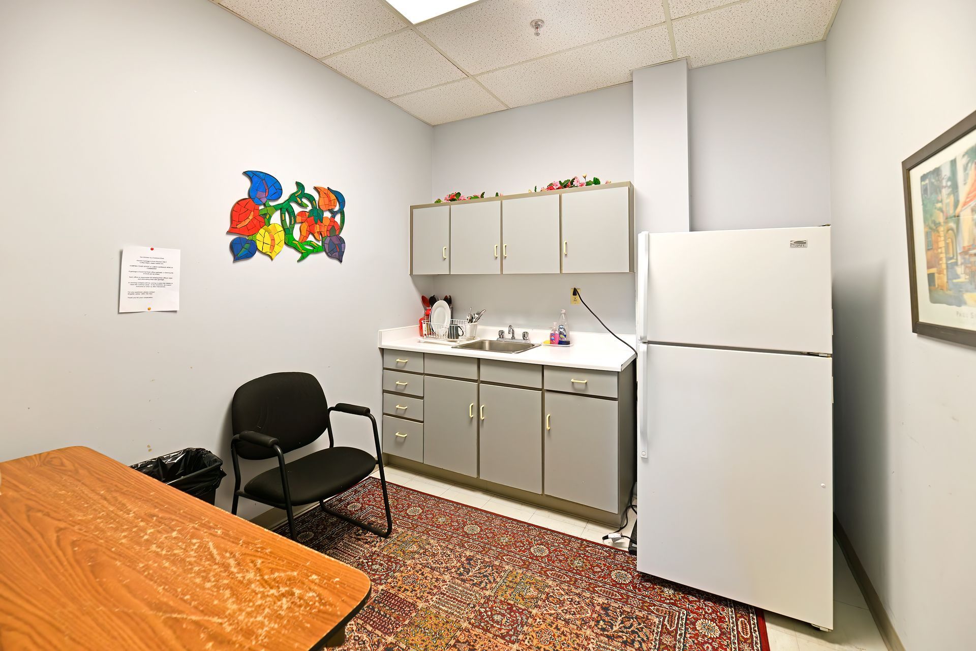 • Includes kitchenette/lunchroom for convenience during work hours.