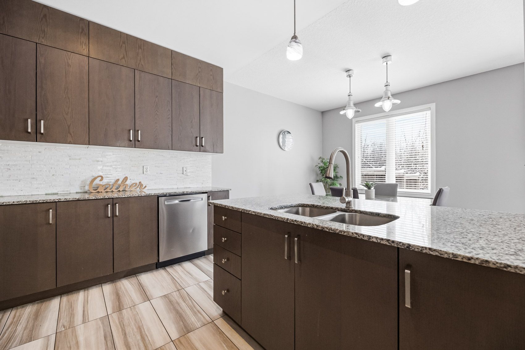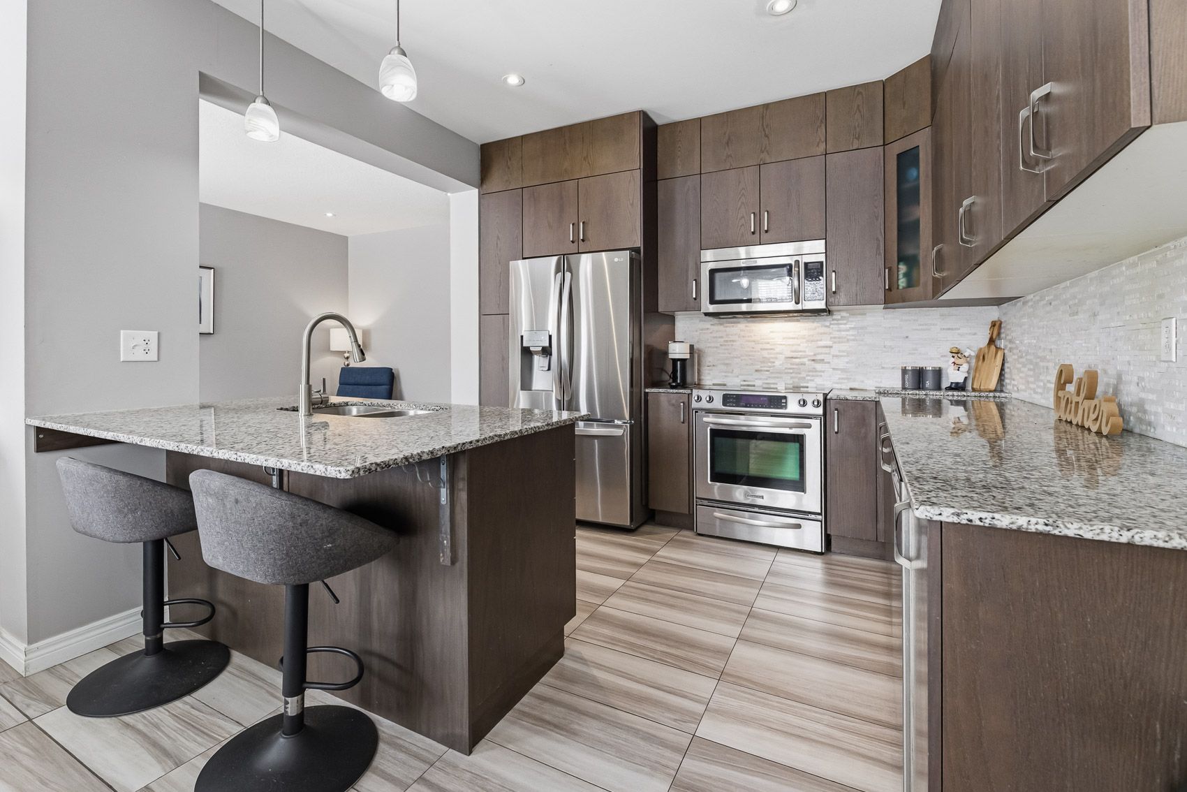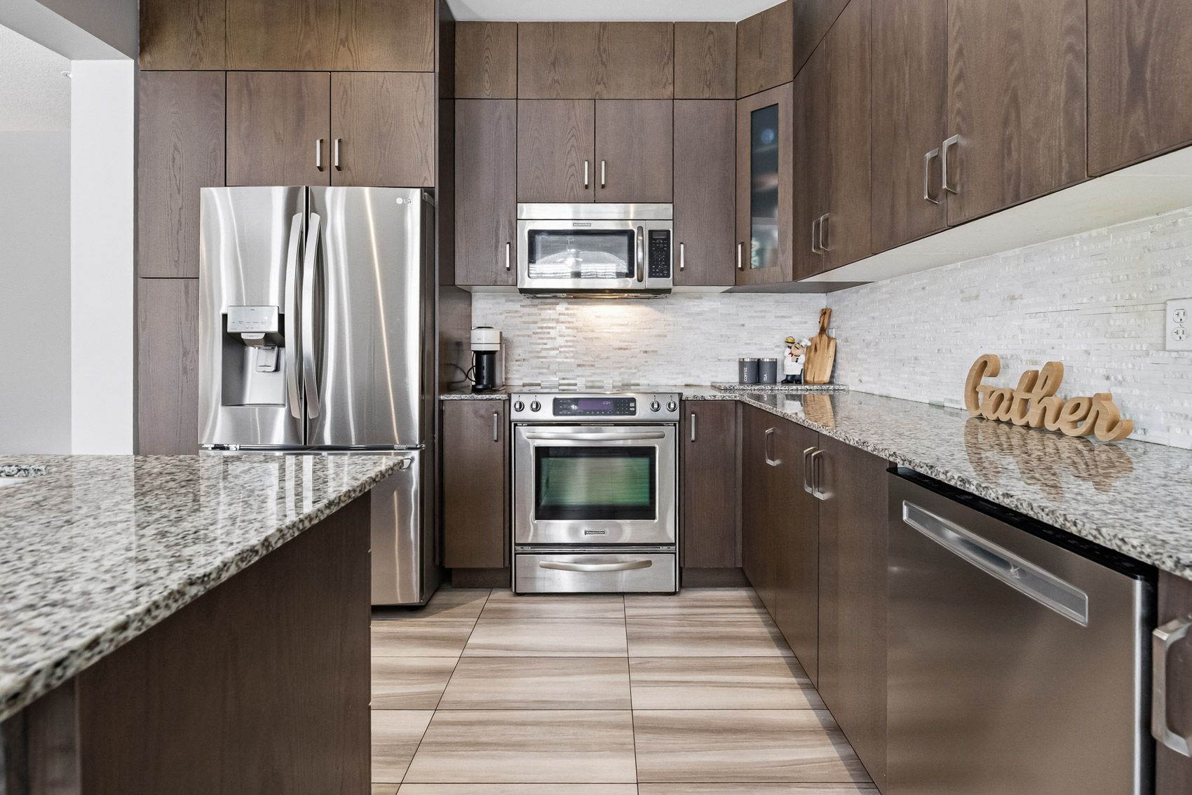 • Functional eat-in kitchen with granite countertops and modern appliances.