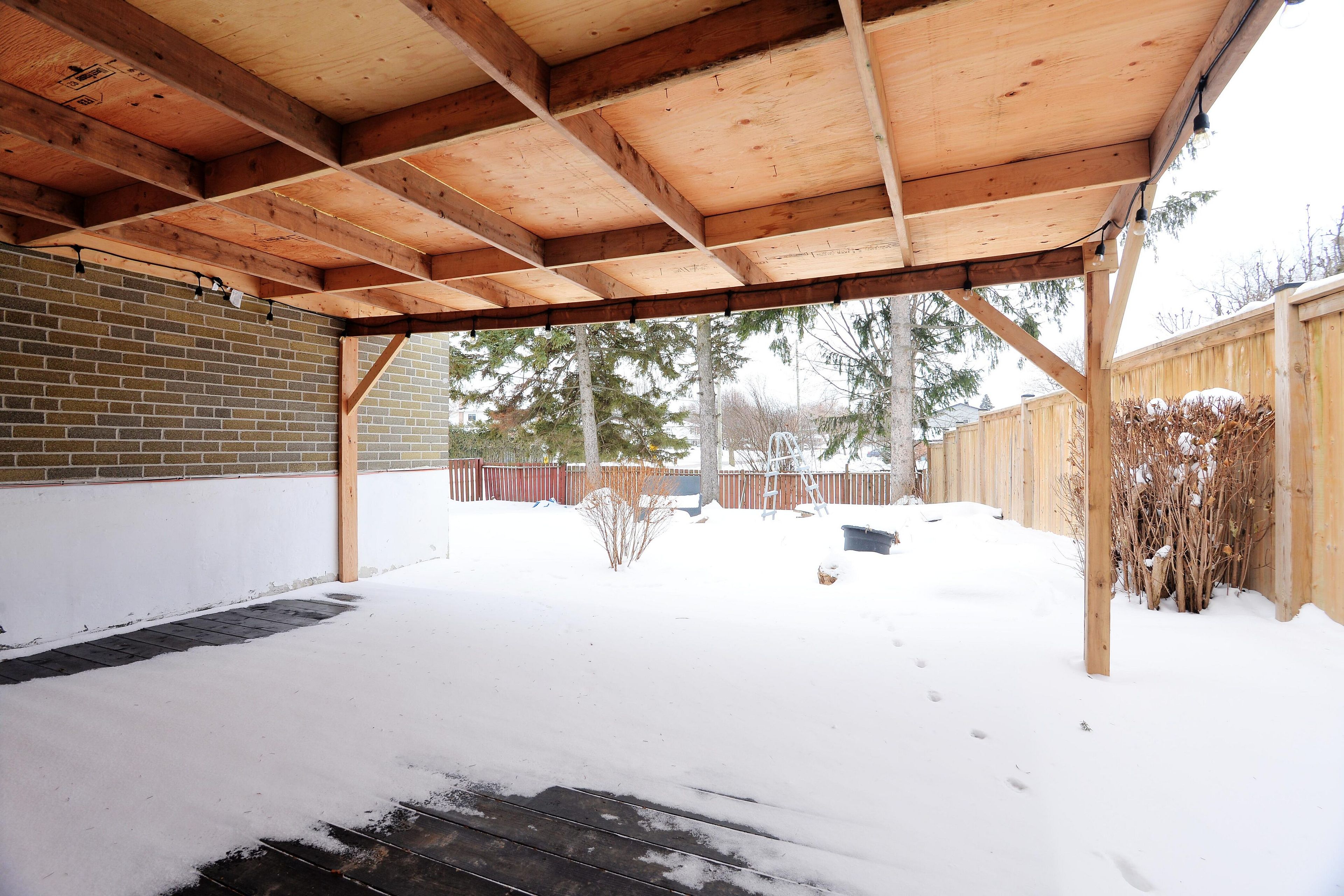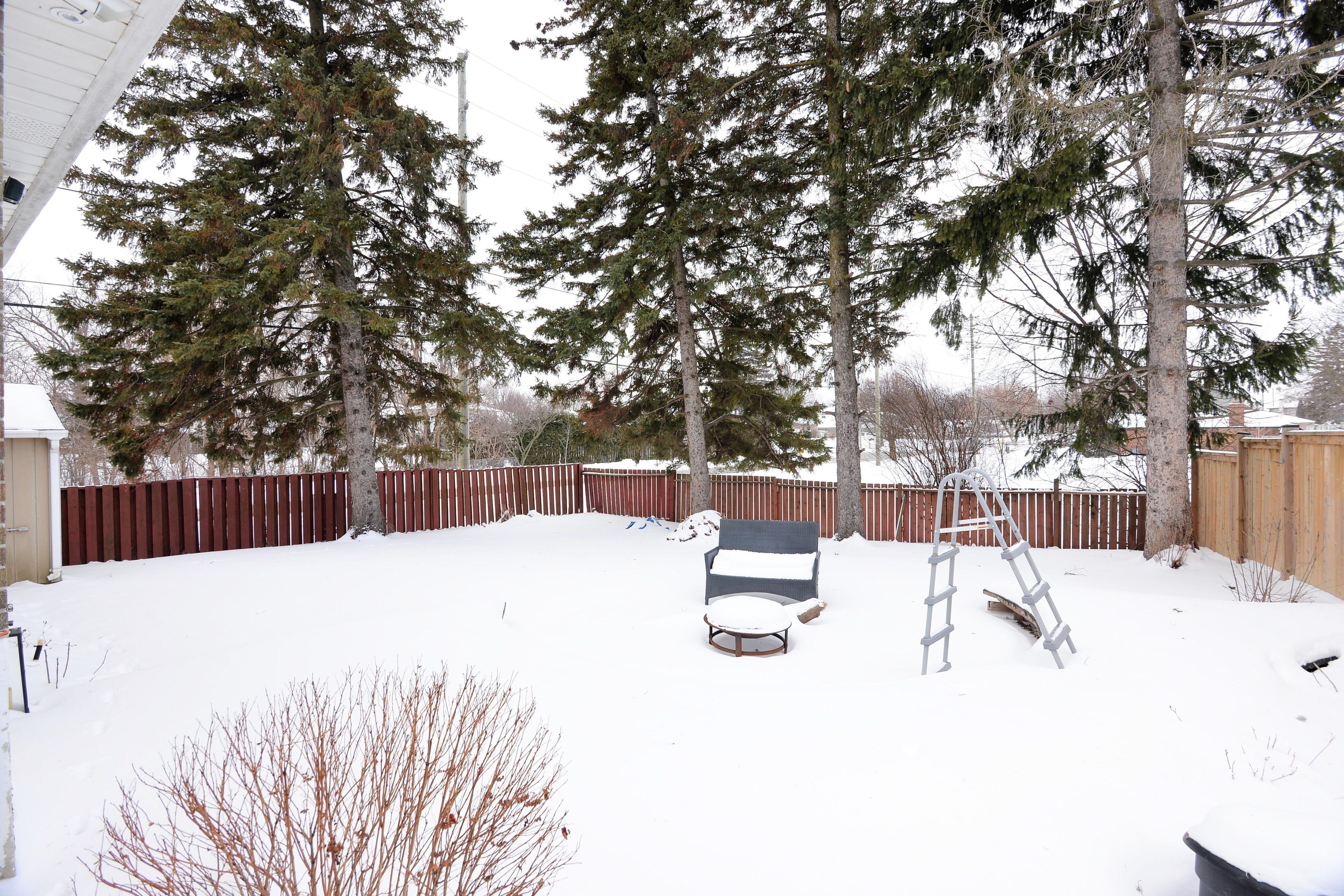 • Fenced backyard with park views and storage shed for convenience.