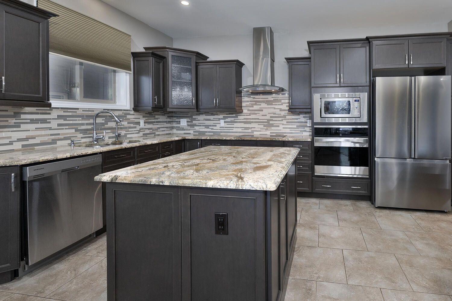• Custom kitchen with granite countertops and two islands for cooking and entertaining.
