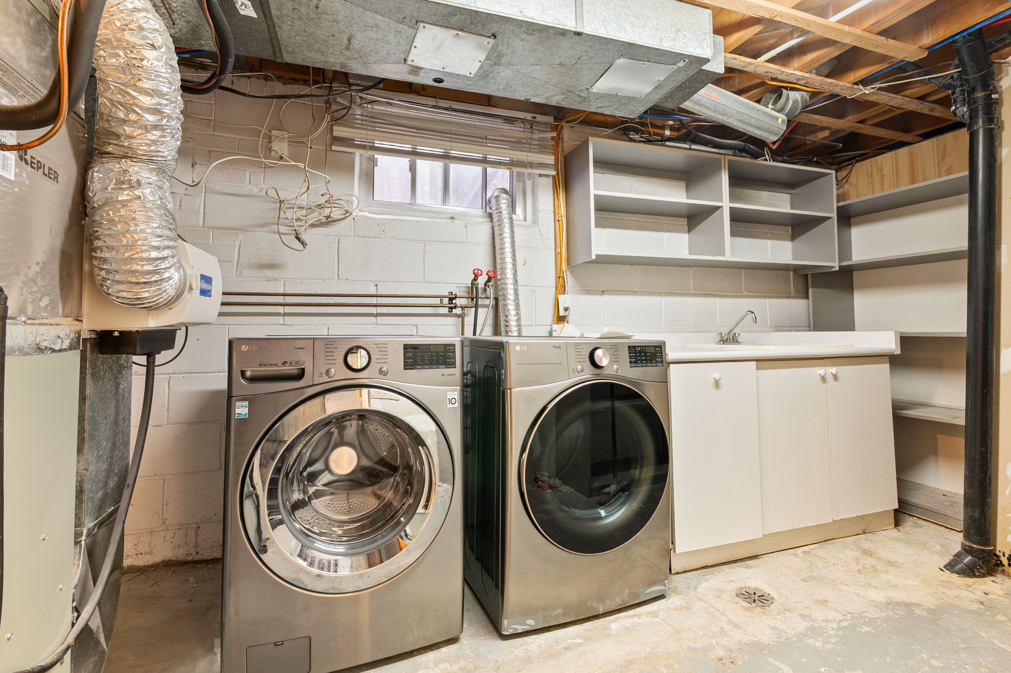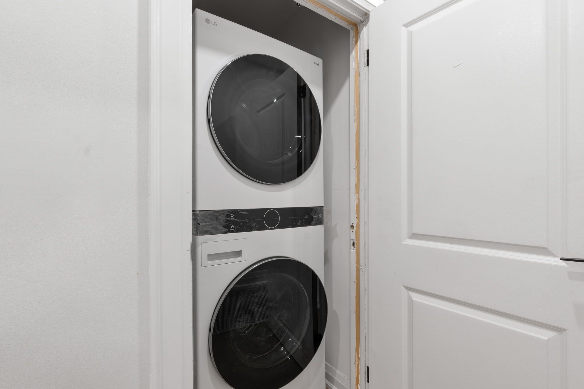 • Bright eat-in kitchen with quartz countertops and stainless steel appliances.