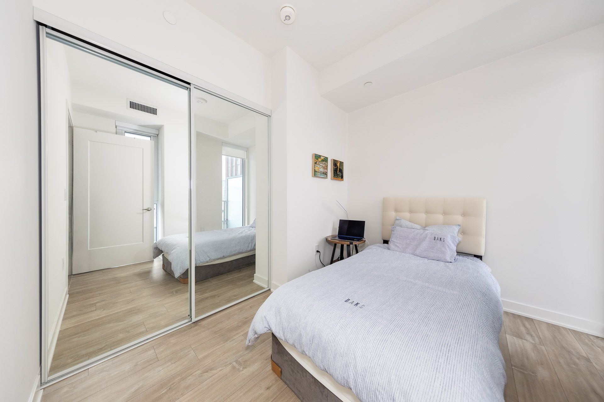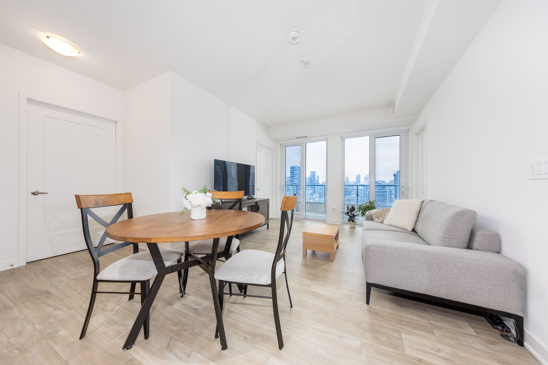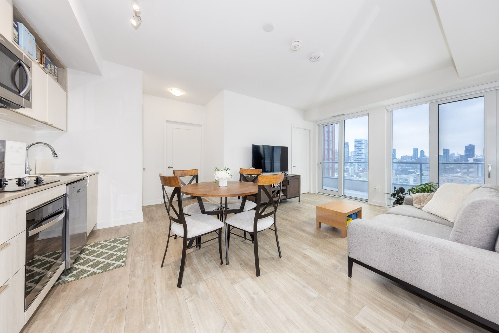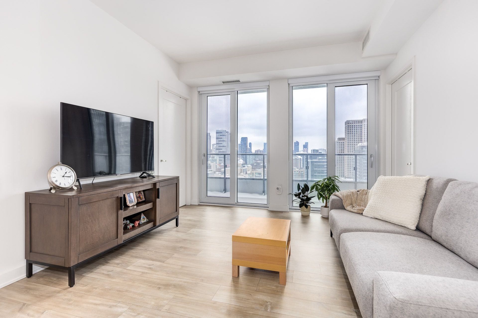 • Bright 2-bedroom suite with large floor-to-ceiling windows and balcony.