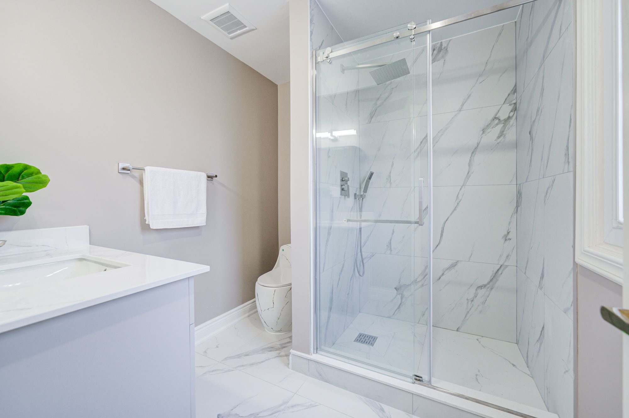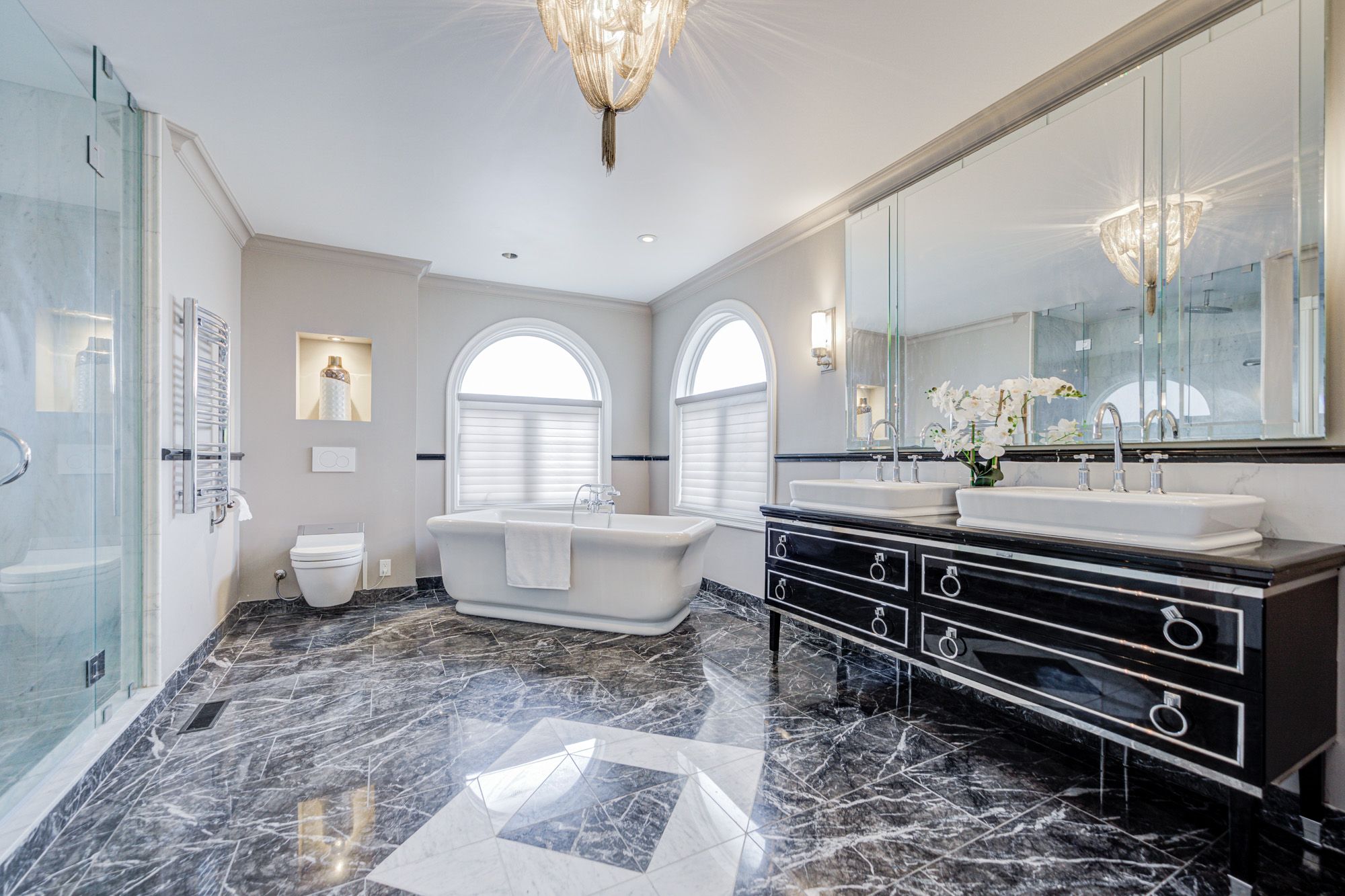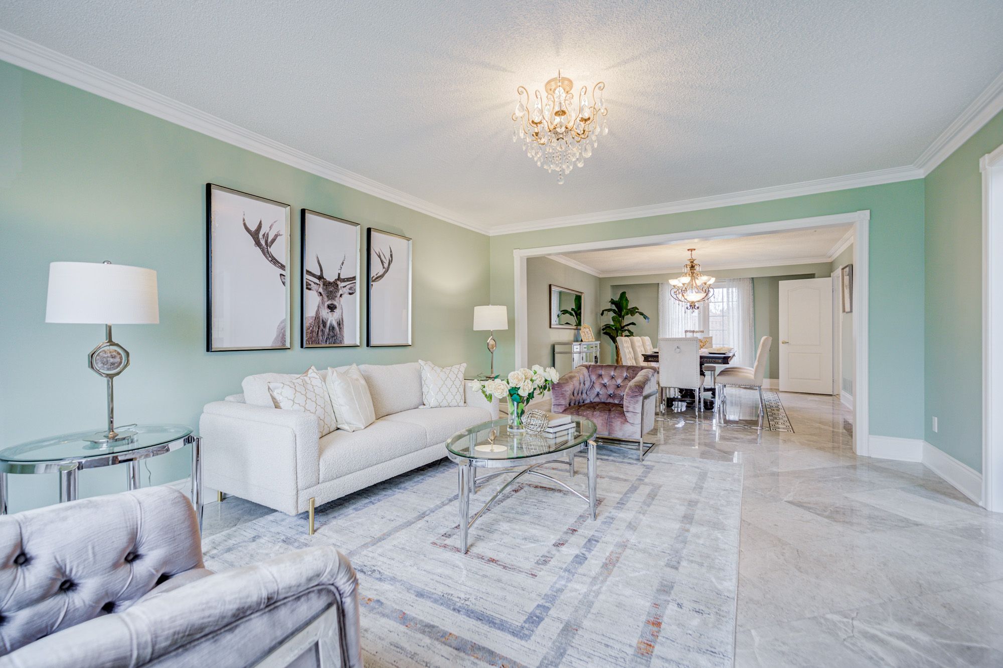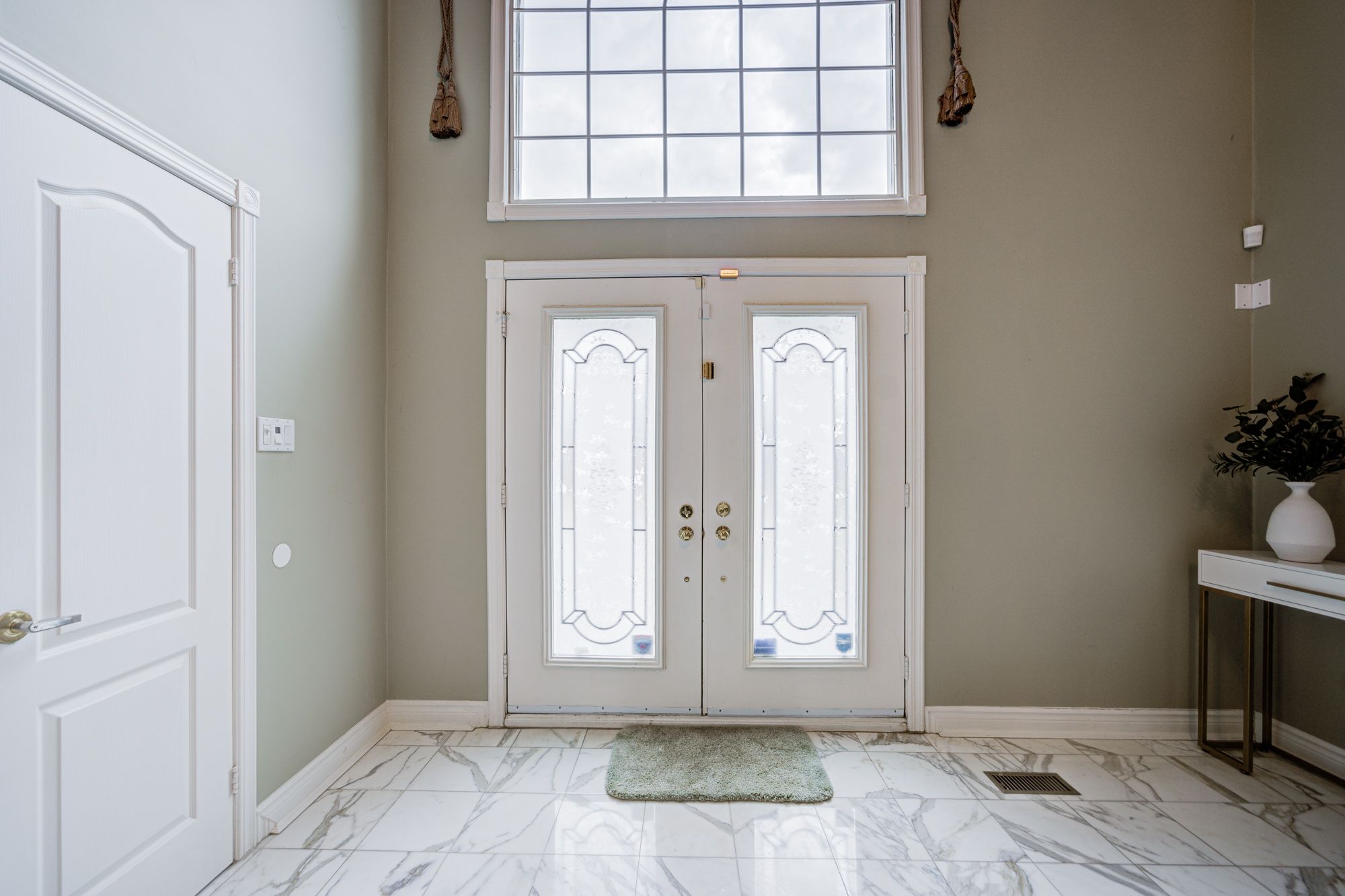 • Grand foyer with marble flooring and an elegant staircase.