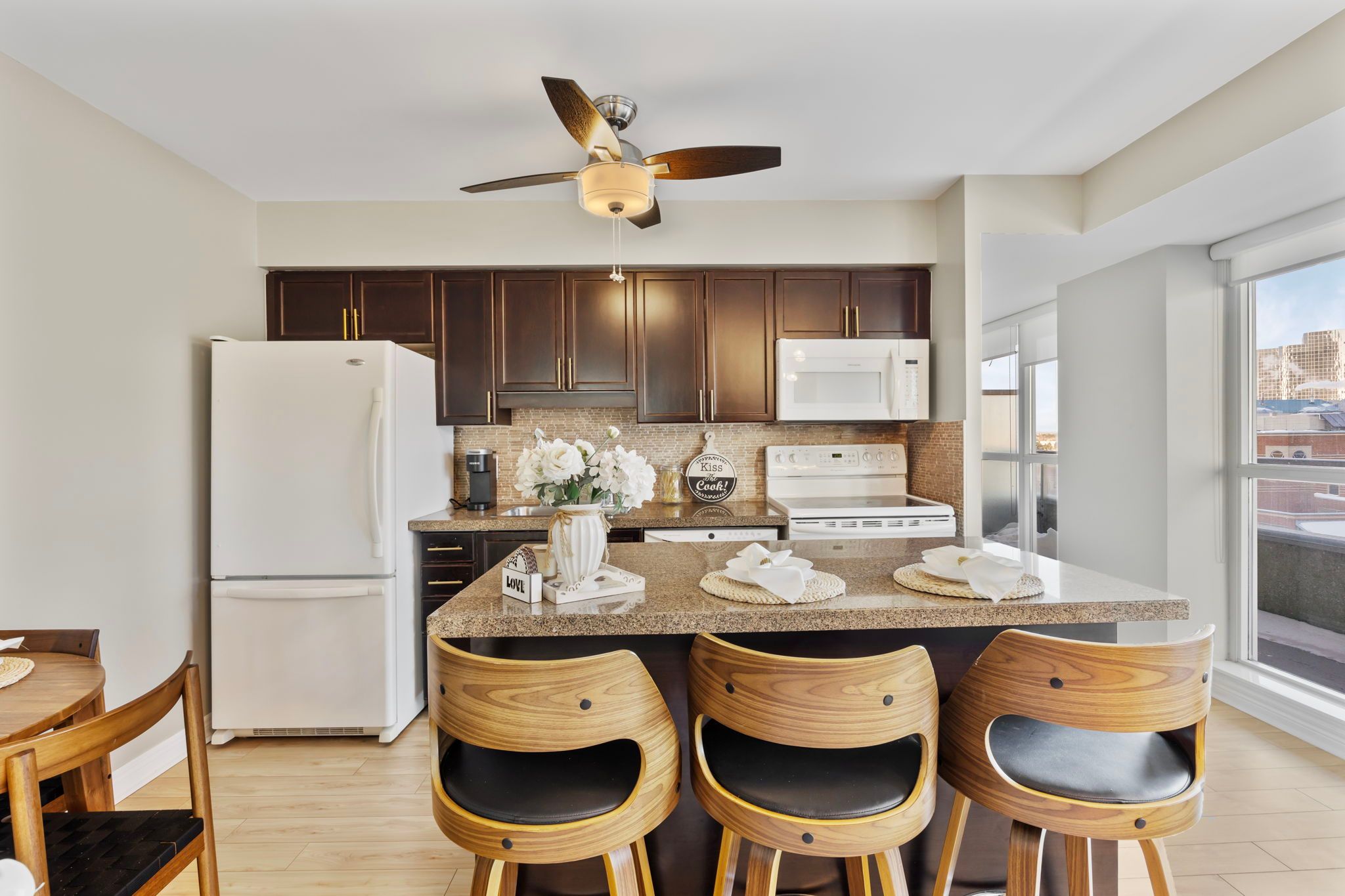 • Bright corner condo with natural light and panoramic views from a wrap-around balcony.