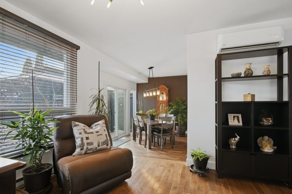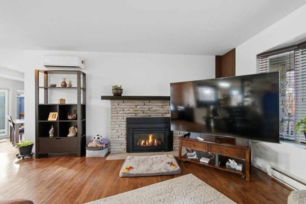 • Bright main level with open kitchen, dining, and living room featuring a gas fireplace.