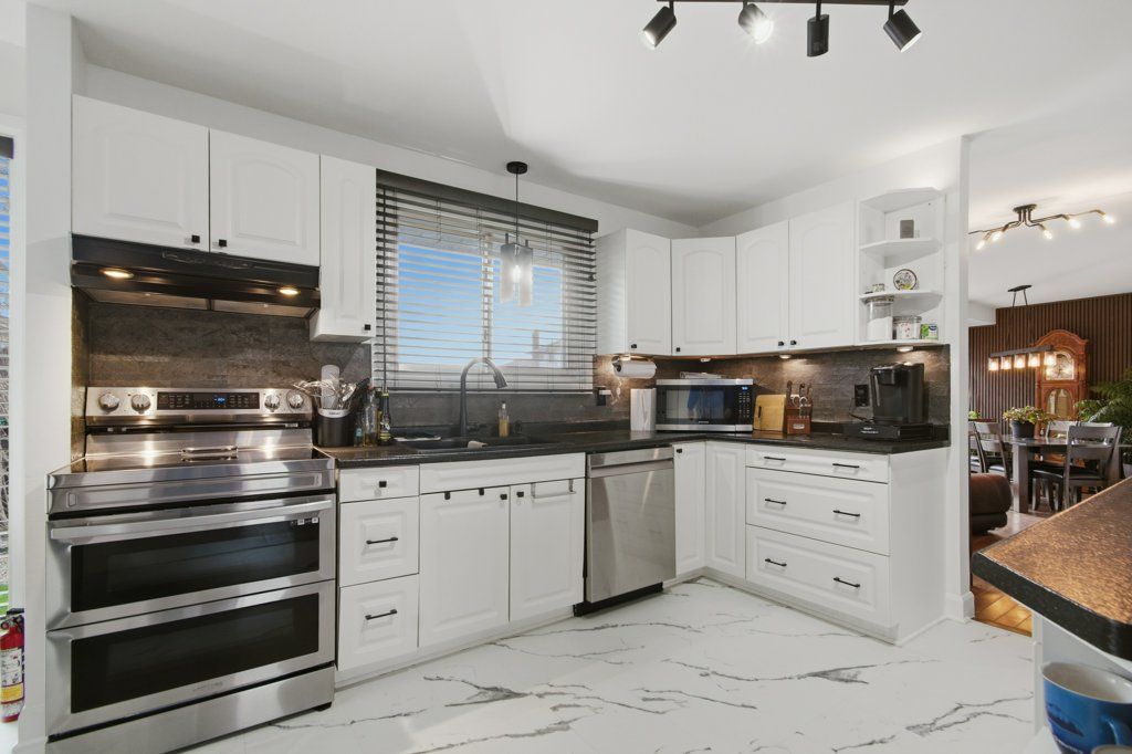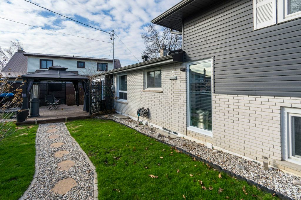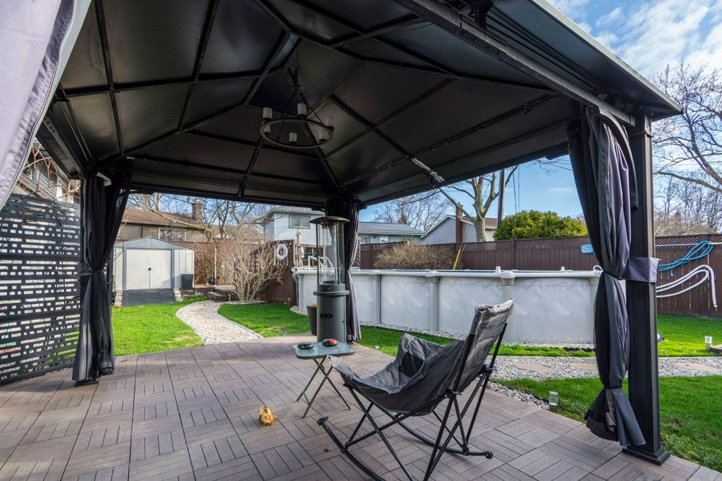 Stunning 4-level side split offering exceptional space and versatility, complete with a fully self-contained in-law suite. From the moment you arrive, the inviting front porch sets the tone for this beautifully maintained home. Inside, you'll find a bright, open-concept main level featuring a spacious kitchen and dining area that flows seamlessly into the sun-filled living room with a cozy gas fireplace. The second level offers two generous bedrooms and a modern 4-piece bath. Walk out from the dining area to your private backyard oasis, fully fenced and thoughtfully designed with patios, a gazebo, above-ground pool, and hot tub-perfect for relaxing or entertaining while keeping children and pets safe. The third level features two additional bedrooms and another full bath, ideal for a growing family, guests, or home office space. The fourth level boasts a complete in-law suite with its own kitchenette, countertop range, breakfast bar, comfortable living area with gas fireplace, a fifth bedroom, and a 3-piece bath-perfect for extended family. Freshly painted (excluding the fourth level) and extensively updated, this move-in ready home is a rare find. A must-see property offering comfort, flexibility, and outstanding outdoor living.