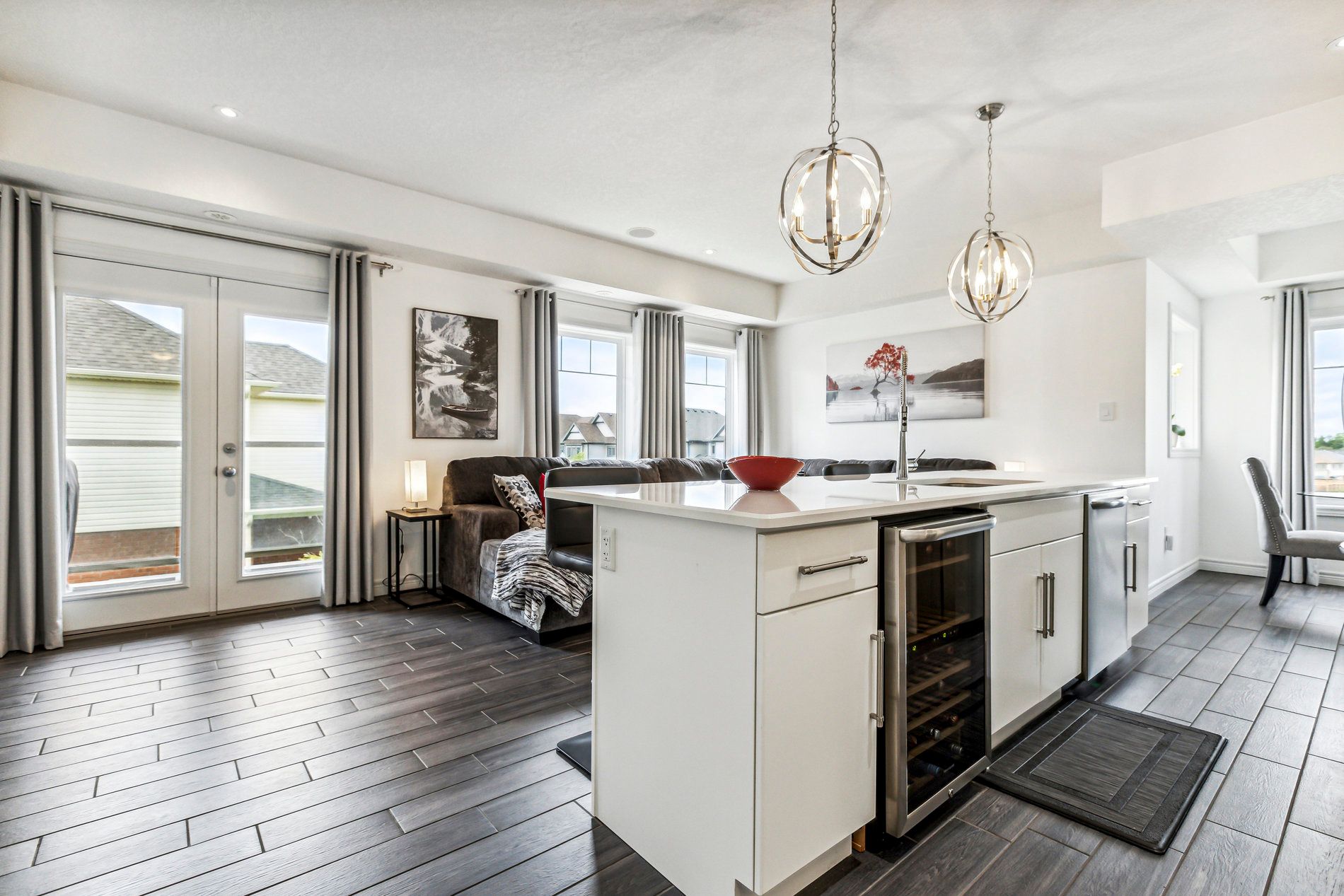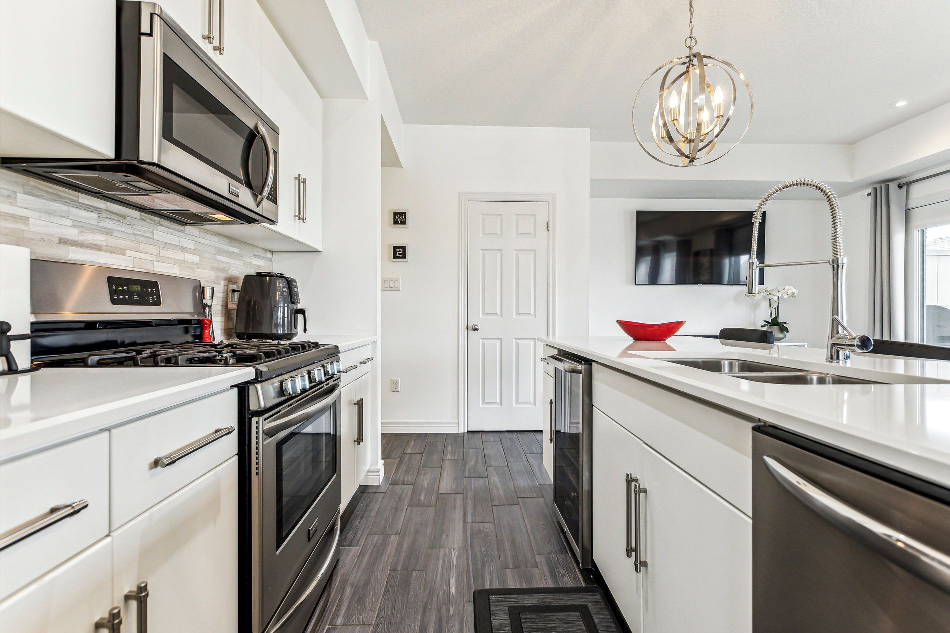 • Open-concept kitchen with stainless steel appliances and elegant quartz countertops.